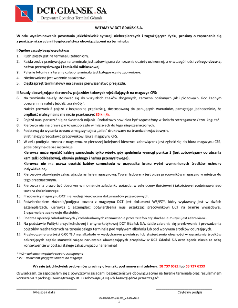 WITAMY W DCT GDAŃSK S.A. W celu wyeliminowania powstania jakichkolwiek sytuacji niebezpiecznych i zagrażających życiu, prosimy o zapoznanie się z poniższymi zasadami bezpieczeństwa obowiązującymi na terminalu: I Ogólne zasady bezpieczeństwa: 1. Ruch pieszy jest na terminalu zabroniony. 2. Każda osoba przebywająca na terminalu jest zobowiązana do noszenia odzieży ochronnej, a w szczególności pełnego obuwia, hełmu przemysłowego i kamizelki odblaskowej. 3. Palenie tytoniu na terenie całego terminalu jest kategorycznie zabronione. 4. Niedozwolone jest wożenie pasażerów. 5. Ciężki sprzęt terminalowy ma zawsze pierwszeństwo przejazdu. II Zasady obowiązujące kierowców pojazdów kołowych wjeżdżających na magazyn CFS: 6. Na terminalu należy stosować się do wszystkich znaków drogowych, zarówno poziomych jak i pionowych. Pod żadnym pozorem nie należy jeździć „na skróty”. Należy prowadzić pojazd z bezpieczną prędkością, dostosowaną do panujących warunków, pamiętając jednocześnie, że prędkość maksymalna nie może przekroczyć 30 km/h. 7. Pojazd musi poruszać się na światłach mijania. Dodatkowo powinien być wyposażony w światło ostrzegawcze / tzw. koguta/. 8. Kierowca nie ma prawa parkować pojazdu w miejscach do tego nieprzeznaczonych. 9. Podstawą do wydania towaru z magazynu jest „bilet” drukowany na bramkach wjazdowych. Bilet należy przedstawić pracownikowi biura magazynu CFS. 10. W celu podjęcia towaru z magazynu, w pierwszej kolejności kierowca zobowiązany jest zgłosić się do biura magazynu CFS, gdzie otrzyma dalsze instrukcje. Kierowca może opuścić kabinę samochodu tylko wtedy, gdy spełnienia wymogi punktu 2 (jest zobowiązany do ubrania kamizelki odblaskowej, obuwia pełnego i hełmu przemysłowego). Kierowca nie ma prawa opuścić kabiny samochodu w przypadku braku wyżej wymienionych środków ochrony indywidualnej. 11. Kierowców obowiązuje zakaz wjazdu na halę magazynową. Towar ładowany jest przez pracowników magazynu w miejscu do tego przeznaczonym. 12. Kierowca ma prawo być obecnym w momencie załadunku pojazdu, w celu oceny ilościowej i jakościowej podejmowanego towaru drobnicowego. 13. Pracownicy magazynu DCT nie wydają kierowcom dokumentów przewozowych. 14. Potwierdzeniem złożenia/podjęcia towaru z magazynu DCT jest dokument WZ/PZ*, który wydawany jest w dwóch egzemplarzach. Kierowca 1 egzemplarz potwierdzenia musi przekazać pracownikowi DCT na bramie wyjazdowej, 2 egzemplarz zachowuje dla siebie. 15. Podczas operacji załadunkowych / rozładunkowych rozmawianie przez telefon czy słuchanie muzyki jest zabronione. 16. Na podstawie Polityki antyalkoholowej i antynarkotykowej DCT Gdańsk S.A. ściśle zabrania się przebywania i prowadzenia pojazdów mechanicznych na terenie całego terminala pod wpływem alkoholu lub pod wpływem środków odurzających. 17. Przekroczenie wartości 0,00 ‰/ mg alkoholu w wydychanym powietrzu lub stwierdzenie obecności w organizmie środków odurzających będzie stanowić rażące naruszenie obowiązujących przepisów w DCT Gdańsk S.A oraz będzie niosło za sobą konsekwencje w postaci stałego zakazu wjazdu na terminal. * WZ – dokument wydania towaru z magazynu * PZ – dokument przyjęcie towaru na magazyn W razie jakichkolwiek problemów prosimy o kontakt pod numerami telefonu: 58 737 6322 lub 58 737 6359 Oświadczam, że zapoznałem się z powyższymi zasadami bezpieczeństwa obowiązującymi na terenie terminala oraz regulaminem korzystania z parkingu zewnętrznego DCT i zobowiązuje się ich bezwzględnie przestrzegać: _______________________________ Miejsce i data _____________________________ Czytelny podpis DCT/DOC/SC/81.05_23.06.2015 1