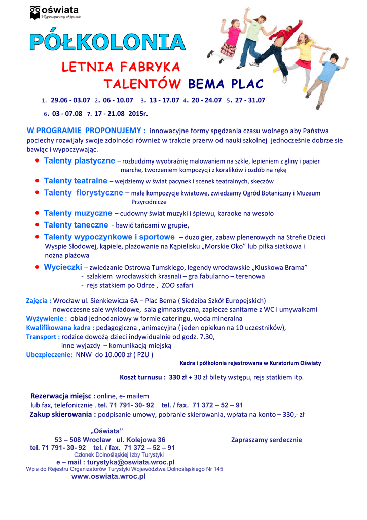 LETNIA FABRYKA TALENTÓW BEMA PLAC . 1. 29.06 - 03.07 2 06 - 10.07 . . . 3 13 - 17.07 4 20 - 24.07 5 27 - 31.07 . 6 03 - 07.08 7. 17 - 21.08 2015r. W PROGRAMIE PROPONUJEMY : innowacyjne formy spędzania czasu wolnego aby Państwa pociechy rozwijały swoje zdolności również w trakcie przerw od nauki szkolnej jednocześnie dobrze sie bawiąc i wypoczywając. Talenty plastyczne – rozbudzimy wyobraźnię malowaniem na szkle, lepieniem z gliny i papier marche, tworzeniem kompozycji z koralików i ozdób na rękę Talenty teatralne – wejdziemy w świat pacynek i scenek teatralnych, skeczów Talenty florystyczne – małe kompozycje kwiatowe, zwiedzamy Ogród Botaniczny i Muzeum Przyrodnicze Talenty muzyczne – cudowny świat muzyki i śpiewu, karaoke na wesoło Talenty taneczne - bawić tańcami w grupie, Talenty wypoczynkowe i sportowe – dużo gier, zabaw plenerowych na Strefie Dzieci Wyspie Słodowej, kąpiele, plażowanie na Kąpielisku „Morskie Oko” lub piłka siatkowa i nożna plażowa Wycieczki – zwiedzanie Ostrowa Tumskiego, legendy wrocławskie „Kluskowa Brama” - szlakiem wrocławskich krasnali – gra fabularno – terenowa - rejs statkiem po Odrze , ZOO safari Zajęcia : Wrocław ul. Sienkiewicza 6A – Plac Bema ( Siedziba Szkół Europejskich) nowoczesne sale wykładowe, sala gimnastyczna, zaplecze sanitarne z WC i umywalkami Wyżywienie : obiad jednodaniowy w formie cateringu, woda mineralna Kwalifikowana kadra : pedagogiczna , animacyjna ( jeden opiekun na 10 uczestników), Transport : rodzice dowożą dzieci indywidualnie od godz. 7.30, inne wyjazdy – komunikacją miejską Ubezpieczenie: NNW do 10.000 zł ( PZU ) Kadra i półkolonia rejestrowana w Kuratorium Oświaty Koszt turnusu : 330 zł + 30 zł bilety wstępu, rejs statkiem itp. Rezerwacja miejsc : online, e- mailem lub fax, telefonicznie . tel. 71 791- 30- 92 tel. / fax. 71 372 – 52 – 91 Zakup skierowania : podpisanie umowy, pobranie skierowania, wpłata na konto – 330,- zł „Oświata” 53 – 508 Wrocław ul. Kolejowa 36 tel. 71 791- 30- 92 tel. / fax. 71 372 – 52 – 91 Członek Dolnośląskiej Izby Turystyki e – mail : [email protected] Wpis do Rejestru Organizatorów Turystyki Województwa Dolnośląskiego Nr 145 www.oswiata.wroc.pl Zapraszamy serdecznie PÓŁKOLONIA 2015 LETNIA FABRYKA TALENTÓW BEMA PLAC Zapraszamy na organizowane półkolonie w centrum Wrocławia Plac Bema. Realizowany przez nas program to ciekawe formy edukacyjne zabawa i ruch. W trakcie wieloletnich działań realizacji aktywnego wypoczynku dla dzieci wypracowaliśmy atrakcyjne metody i formy aktywizacji dziecka. Cena zawiera: - opiekę wychowawców, jednodaniowy obiad, woda mineralna, realizacja programu zajęć wg. programu do południa i po obiedzie, na dni pogodne i deszczowe ( patrz tabela programowa) - opiekę nad dzieckiem w godz. 7.30 – 16.00- 16.30 - prowadzenie zajęć przez osoby o odpowiednich kwalifikacjach pedagogicznych i trenerskich - materiały plastyczne, - sprzęt muzyczny, - sprzęt sportowy i rekreacyjny - ubezpieczenie NNW do 10.000zł PZU, - apteczka pierwszej pomocy - pamiątkową płytę CD ze zdjęciami Prosimy o przygotowanie dla dzieci II śniadania oraz wyposażenie w odpowiedni ekwipunek na dany dzień ( tabela programowa ostatnia kolumna) ! Ramowy plan dnia : godz. 07. 30 – 08.00 – przyjmowanie dzieci godz. 08.00 – 13.30 – realizacja programu „słonecznego” lub „deszczowego” godz. 14.00 - obiad godz. 16.00- 16.30 – odbieramy dzieci Prosimy o przygotowanie pierwszego dnia podpisanej koperty z drobnymi pieniążkami na wstępy i atrakcje + jedenaście biletów ulgowych na tramwaj. Prawdopodobnie będzie potrzebne ok. 45 - 50zł jeżeli dopisze pogoda i będziemy częściej na wolnym powietrzu. Więcej informacji na stronie: www.oswiata.wroc.pl PŁATNOŚĆ : na konto z podaniem nazwy imprezy, terminu i nazwiska uczestnika „Oświata” Spółdzielnia Pracy 53 – 508 Wrocław ul. Kolejowa 36 BZ WBK S.A. I O/ Wrocław 59 1090 2398 0000 0006 0800 0825 Faktury wystawiamy na instytucje lub osoby wpłacające. Tabela programowa Zabieramy ze sobą codziennie : mały plecaczek , mały ręczniczek, legitymację szkolną, ubranie od wiatru i deszczu, czapeczkę z daszkiem od słońca, ulubione nagrania, dobry humor, drugie śniadanie. Gry i zabawy integracyjne w parku. Zabawy integracyjne w sali z wykorzystaniem chusty KLANZY - podstawy modelingu połączone ze nauką piosenek. - lepienie z gliny. - nauka tańców nowoczesnych. - małe formy teatralne. kilka gałganków kolorowych, kolorowe sznureczki, Wyjazd do ZOO, połączony ze zwiedzaniem Wyświetlanie filmu w sali. - utrwalenie poznanych układów tanecznych - papierowe cudaczki - zajęcia artystyczne z papier marche Kilka starych kolorowych gazet, opakowań, mały słoiczek lub buteleczka szklana Wyjście do kina na film. - zajęcia artystyczne malowanie na szkle. - wystawa prac dzieci. - śpiewanie piosenek. - mini warsztaty florystyczne Środa Wersja deszczowa Rejs statkiem po Odrze. Zwiedzanie Ostrowa Tumskiego, słuchanie legend związanych z tą częścią miasta. „Kluskowa brama”, „Głowa na katedrze” Czwartek Program po obiedzie Co dziecko ma zabrać ze sobą ? Wersja słoneczna Wyjście na basen na Wyjście do Aqua Parku Morskie Oko Zabawy na świeżym powietrzu – olimpiada sportowa. - zajęcia artystyczne zabawy Origami. - utrwalenie poznanych układów tanecznych. - zajęcia artystyczne - małe formy teatralne. Piątek Wtorek Poniedziałek Nie zabieramy drogocennych rzeczy, elektroniki itp. ! Szlakiem Karaoke na wesoło wrocławskich krasnali. Wyjście do Rynku połączone ze znalezieniem krasnali i zaznaczeniem ich na mapie. Legendy związane z krasnalami. - zajęcia artystyczne co najbardziej podobało mi się na półkolonii. - zajęcia artystyczne zabawy z koralikami - popisy dzieci - uroczyste rozdanie dyplomów i prac dzieci ------------- Strój kąpielowy / kąpielówki, klapeczki plażowe