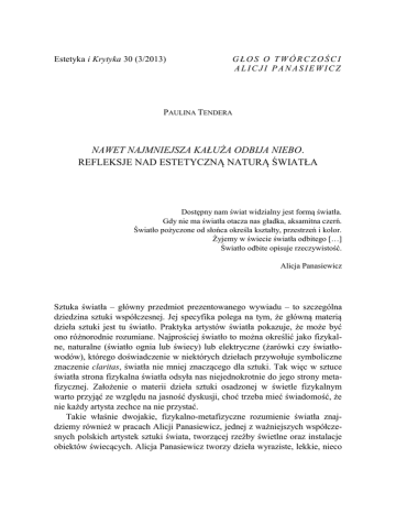 Estetyka i Krytyka 30 (3/2013) GŁOS O TWÓRCZOŚCI ALICJI PANASIEWICZ PAULINA TENDERA NAWET NAJMNIEJSZA KAŁUŻA ODBIJA NIEBO. REFLEKSJE NAD ESTETYCZNĄ NATURĄ ŚWIATŁA Dostępny nam świat widzialny jest formą światła. Gdy nie ma światła otacza nas gładka, aksamitna czerń. Światło pożyczone od słońca określa kształty, przestrzeń i kolor. Żyjemy w świecie światła odbitego […] Światło odbite opisuje rzeczywistość. Alicja Panasiewicz Sztuka światła – główny przedmiot prezentowanego wywiadu – to szczególna dziedzina sztuki współczesnej. Jej specyfika polega na tym, że główną materią dzieła sztuki jest tu światło. Praktyka artystów światła pokazuje, że może być ono różnorodnie rozumiane. Najprościej światło to można określić jako fizykalne, naturalne (światło ognia lub świecy) lub elektryczne (żarówki czy światłowodów), którego doświadczenie w niektórych dziełach przywołuje symboliczne znaczenie claritas, światła nie mniej znaczącego dla sztuki. Tak więc w sztuce światła strona fizykalna światła odsyła nas niejednokrotnie do jego strony metafizycznej. Założenie o materii dzieła sztuki osadzonej w świetle fizykalnym warto przyjąć ze względu na jasność dyskusji, choć trzeba mieć świadomość, że nie każdy artysta zechce na nie przystać. Takie właśnie dwojakie, fizykalno-metafizyczne rozumienie światła znajdziemy również w pracach Alicji Panasiewicz, jednej z ważniejszych współczesnych polskich artystek sztuki świata, tworzącej rzeźby świetlne oraz instalacje obiektów świecących. Alicja Panasiewicz tworzy dzieła wyraziste, lekkie, nieco 174 Paulina Tendera __________________________________________________________________________________________________________________________________________________________________________________________________________________________________ poetyckie, estetyczne i emanujące pierwiastkiem kobiecym, a ponadto niejednokrotnie przesycone filozoficzną intuicją, dotyczącą nie tylko piękna zmysłowego, ale i ogólnie pojętej natury rzeczy, w jej wewnętrznym, ontologicznym rozumieniu. Taka postawa artystki inspiruje odbiorcę, tworząc dla niego odrębną, nieco baśniową przestrzeń sztuki światła. To niecodzienne dzisiaj połączenie piękna z filozofią potrafi zachwycić, pokazuje coś, co przywołuje na myśl istotę kobiecości. W niej właśnie nieustannie konfrontują się: potrzeba piękna, zmysłowego zachwytu nad światem z intelektualną treścią i wyzwaniem. Zmysłowe piękno to zachęta, a wartości rozumowe stanowią drogę ku pełni rozwoju duchowego, którą powinna przeżywać w życiu każda kobieta. Takie są właśnie prace Panasiewicz – zdradzają sensualność, ulotność i kobiece widzenie świata. Widać to w Lapille (rzeźba, materiały: szkło, odcisk w piasku, technika: pate de verte, LED diody, wymiar: 25 x 9 x 7 cm), stanowiącym efekt refleksji nad fenomenem postrzegania, połączonym z fascynacją światłem. Widzenie stanowi tu akt wzbogacania pamięci i kształtowania osobowości w perspektywie całego życia, stąd światło jaśniejące z wnętrza bryły jest znakiem żywotności i aktywności treści wewnętrznej, która ujawnia się nie tylko w przeżyciu duchowym, ale również w biologicznym życiu jednostki, dlatego dodać można, że światło jest wizualnym odpowiednikiem ciepła, które w postaci ognia i ciepła słonecznego towarzyszy człowiekowi. Słońce i blask ognia rozpraszają mrok i dają poczucie bezpieczeństwa1. Do fenomenu widzenia odwołuje się również praca Dreamwoven (materiały: metalowa linka, elementy świecące – elektroluminescencja w zmiennym polu elektrycznym, wymiary: 40 x 30 x 70 cm, 40 x 30 x 50 cm, 30 x 15 cm). Zjawisko powidoku może stać się przedmiotem doświadczenia zmysłowego, a jako takie może być potencjalnie przemienione w źródło piękna, jeśli tylko widzowi uda się stworzyć sytuację estetyczną i odczuć estetyczne zaangażowanie. Estetyzacja naturalnego zjawiska widzenia odbywa się tutaj dzięki skupieniu na obrazie następczym: [...] nietrwały, migotliwy, trudno uchwytny ślad pod powiekami – [to] powidok. W pierwszej chwili jako negatyw, a później jako kolor dopełniający. Ślady rzeczywistości przeplatające się ze snami, myślami, zapamiętanymi obrazami i tworzące nowe obrazy2. 1 2 alicjapanasiewicz.net Tamże. Nawet najmniejsza kałuża odbija niebo... 175 __________________________________________________________________________________________________________________________________________________________________________________________________________________________________ Sztuka Panasiewicz znosi przepaść między zmysłowością piękna a rozumem, przywracając świadomość harmonii świata i urzeczywistniając aspekty neoplatońskich idei. Poza inspiracjami bliskimi tradycji neoplatońskiej, na przykład odwołaniami do myśli Pseudo-Dionizego Areopagity, które zawarte są w pracy Kałuże Pseudo-Dionizego (materiał: lustro fazowane, wymiary: 65 x 35 cm, 35 x 30 cm, 25 x 20 cm), w pracach Panasiewicz znajdujemy także odleglejsze odniesienia do tego nurtu, pozostające w kręgu refleksji filozoficznej. Przykładem jest tu dzieło Kałuża św. Tomasza (materiał: szkło slamping, aluminium, LED, wymiary: 50 x 90 x 3 cm, 55 x 80 x 3 cm). Gdzie mogło odbyć się pierwsze doświadczenie estetyczne tego dzieła? Światło słoneczne lub witryny sklepowej, a może latarni odbiło się w kałuży przy ulicy św. Tomasza w Krakowie – nic więcej nie trzeba, by przypomnieć sobie myśli scholastyki – consonantia et claritas. Czy to zachęta do świadomej estetyzacji codzienności? Spacerując tą czy inną ulicą Krakowa, zachowujemy postawę zaangażowania estetycznego, tym samym ożywiamy życie codzienne poetyką zmysłowości. Artystka przypomni nam ważne słowa Akwinaty – „światło jest przyczyną rozkosz