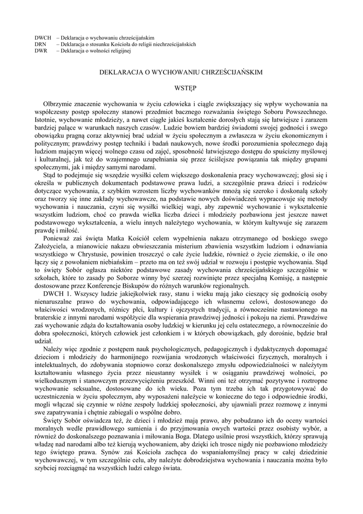 DWCH – Deklaracja o wychowaniu chrześcijańskim DRN – Deklaracja o stosunku Kościoła do religii niechrześcijańskich DWR – Deklaracja o wolności religijnej DEKLARACJA O WYCHOWANIU CHRZEŚCIJAŃSKIM WSTĘP Olbrzymie znaczenie wychowania w życiu człowieka i ciągle zwiększający się wpływ wychowania na współczesny postęp społeczny stanowi przedmiot bacznego rozważania świętego Soboru Powszechnego. Istotnie, wychowanie młodzieży, a nawet ciągłe jakieś kształcenie dorosłych stają się łatwiejsze i zarazem bardziej palące w warunkach naszych czasów. Ludzie bowiem bardziej świadomi swojej godności i swego obowiązku pragną coraz aktywniej brać udział w życiu społecznym a zwłaszcza w życiu ekonomicznym i politycznym; prawdziwy postęp techniki i badań naukowych, nowe środki porozumienia społecznego dają ludziom mającym więcej wolnego czasu od zajęć, sposobność łatwiejszego dostępu do spuścizny myślowej i kulturalnej, jak też do wzajemnego uzupełniania się przez ściślejsze powiązania tak między grupami społecznymi, jak i między samymi narodami. Stąd to podejmuje się wszędzie wysiłki celem większego doskonalenia pracy wychowawczej; głosi się i określa w publicznych dokumentach podstawowe prawa ludzi, a szczególnie prawa dzieci i rodziców dotyczące wychowania, z szybkim wzrostem liczby wychowanków mnożą się szeroko i doskonalą szkoły oraz tworzy się inne zakłady wychowawcze, na podstawie nowych doświadczeń wypracowuje się metody wychowania i nauczania, czyni się wysiłki wielkiej wagi, aby zapewnić wychowanie i wykształcenie wszystkim ludziom, choć co prawda wielka liczba dzieci i młodzieży pozbawiona jest jeszcze nawet podstawowego wykształcenia, a wielu innych należytego wychowania, w którym kultywuje się zarazem prawdę i miłość. Ponieważ zaś święta Matka Kościół celem wypełnienia nakazu otrzymanego od boskiego swego Założyciela, a mianowicie nakazu obwieszczania misterium zbawienia wszystkim ludziom i odnawiania wszystkiego w Chrystusie, powinien troszczyć o całe życie ludzkie, również o życie ziemskie, o ile ono łączy się z powołaniem niebiańskim – przeto ma on też swój udział w rozwoju i postępie wychowania. Stąd to święty Sobór ogłasza niektóre podstawowe zasady wychowania chrześcijańskiego szczególnie w szkołach, które to zasady po Soborze winny być szerzej rozwinięte przez specjalną Komisję, a następnie dostosowane przez Konferencje Biskupów do różnych warunków regionalnych. DWCH 1. Wszyscy ludzie jakiejkolwiek rasy, stanu i wieku mają jako cieszący się godnością osoby nienaruszalne prawo do wychowania, odpowiadającego ich własnemu celowi, dostosowanego do właściwości wrodzonych, różnicy płci, kultury i ojczystych tradycji, a równocześnie nastawionego na braterskie z innymi narodami współżycie dla wspierania prawdziwej jedności i pokoju na ziemi. Prawdziwe zaś wychowanie zdąża do kształtowania osoby ludzkiej w kierunku jej celu ostatecznego, a równocześnie do dobra społeczności, których człowiek jest członkiem i w których obowiązkach, gdy dorośnie, będzie brał udział. Należy więc zgodnie z postępem nauk psychologicznych, pedagogicznych i dydaktycznych dopomagać dzieciom i młodzieży do harmonijnego rozwijania wrodzonych właściwości fizycznych, moralnych i intelektualnych, do zdobywania stopniowo coraz doskonalszego zmysłu odpowiedzialności w należytym kształtowaniu własnego życia przez nieustanny wysiłek i w osiąganiu prawdziwej wolności, po wielkodusznym i stanowczym przezwyciężeniu przeszkód. Winni oni też otrzymać pozytywne i roztropne wychowanie seksualne, dostosowane do ich wieku. Poza tym trzeba ich tak przygotowywać do uczestniczenia w życiu społecznym, aby wyposażeni należycie w konieczne do tego i odpowiednie środki, mogli włączać się czynnie w różne zespoły ludzkiej społeczności, aby ujawniali przez rozmowę z innymi swe zapatrywania i chętnie zabiegali o wspólne dobro. Święty Sobór oświadcza też, że dzieci i młodzież mają prawo, aby pobudzano ich do oceny wartości moralnych wedle prawidłowego sumienia i do przyjmowania owych wartości przez osobisty wybór, a również do doskonalszego poznawania i miłowania Boga. Dlatego usilnie prosi wszystkich, którzy sprawują władzę nad narodami albo też kierują wychowaniem, aby dzięki ich trosce nigdy nie pozbawiono młodzieży tego świętego prawa. Synów zaś Kościoła zachęca do wspaniałomyślnej pracy w całej dziedzinie wychowawczej, w tym szczególnie celu, aby należyte dobrodziejstwa wychowania i nauczania można było szybciej rozciągnąć na wszystkich ludzi całego świata. DWCH 2. Wszyscy chrześcijanie, którzy jako nowe stworzenie dzięki odrodzeniu z wody i z Ducha Świętego nazywają się dziećmi Bożymi i są nimi, mają prawo do wychowania chrześcijańskiego. Wychowanie to zdąża nie tylko do pełnego rozwoju osoby ludzkiej, dopiero co opisanego, lecz ma na względzie przede wszystkim to, aby ochrzczeni, wprowadzani stopniowo w tajemnicę zbawienia, stawali się z każdym dniem coraz bardziej świadomi otrzymanego daru wiary. Niechaj uczą się chwalić Boga Ojca w duchu i w prawdzie (por. J 4,23), zwłaszcza w kulcie liturgicznym, niechaj zaprawiają się w prowadzeniu własnego życia wedle nowego człowieka w sprawiedliwości i świętości prawdy (Ef 4,22-24), w ten sposób niech stają się ludźmi doskonałymi na miarę wieku pełności Chrystusowej (por. Ef 4,13) i przyczyniają się do wzrostu Ciała Mistycznego. Ponadto świadomi swego powołania niech się przyzwyczajają dawać świadectwo nadziei, która w nich jest (por. 1 P 3,15), jako też pomagać w chrześcijańskim kształtowaniu świata, dzięki któremu wartości naturalne włączone do pełnego rozumienia człowieka odkupionego przez Chrystusa przyczynią się do dobra całej społeczności. Dlatego obecn