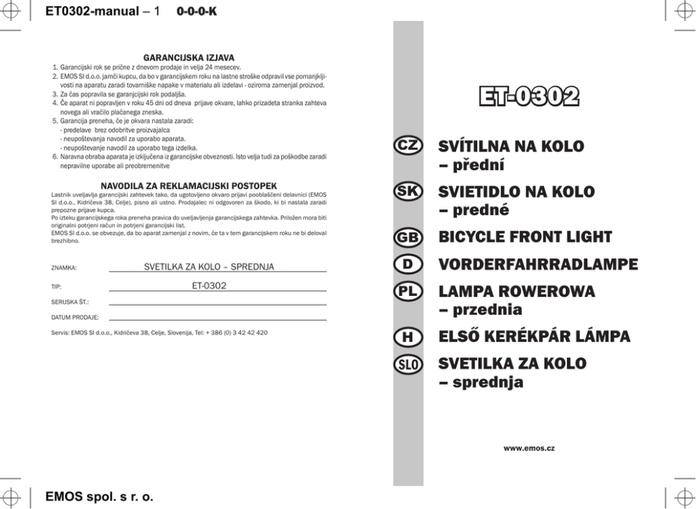 ET0302-manual – 1 0-0-0-K GARANCIJSKA IZJAVA 1. Garancijski rok se prične z dnevom prodaje in velja 24 mesecev. 2. EMOS SI d.o.o. jamči kupcu, da bo v garancijskem roku na lastne stroške odpravil vse pomanjkljivosti na aparatu zaradi tovarniške napake v materialu ali izdelavi - oziroma zamenjal proizvod. 3. Za čas popravila se garanjcijski rok podaljša. 4. Če aparat ni popravljen v roku 45 dni od dneva prijave okvare, lahko prizadeta stranka zahteva novega ali vračilo plačanega zneska. 5. Garancija preneha, če je okvara nastala zaradi: - predelave brez odobritve proizvajalca - neupoštevanja navodil za uporabo aparata. - neupoštevanje navodil za uporabo tega izdelka. 6. Naravna obraba aparata je izključena iz garancijske obveznosti. Isto velja tudi za poškodbe zaradi nepravilne uporabe ali preobremenitve NAVODILA ZA REKLAMACIJSKI POSTOPEK Lastnik uveljavlja garancijski zahtevek tako, da ugotovljeno okvaro prijavi pooblaščeni delavnici (EMOS SI d.o.o., Kidričeva 38, Celje), pisno ali ustno. Prodajalec ni odgovoren za škodo, ki bi nastala zaradi prepozne prijave kupca. Po izteku garancijskega roka preneha pravica do uveljavljenja garancijskega zahtevka. Priložen mora biti originalni potrjeni račun in potrjeni garancijski list. EMOS SI d.o.o. se obvezuje, da bo aparat zamenjal z novim, če ta v tem garancijskem roku ne bi deloval brezhibno. ZNAMKA: ET-0302 CZ SVÍTILNA NA KOLO – přední SK SVIETIDLO NA KOLO – predné GB BICYCLE FRONT LIGHT SVETILKA ZA KOLO – SPREDNJA D ET-0302 PL LAMPA ROWEROWA – przednia H ELSŐ KERÉKPÁR LÁMPA SLO SVETILKA ZA KOLO – sprednja TIP: SERIJSKA ŠT.: DATUM PRODAJE: Servis: EMOS SI d.o.o., Kidričeva 38, Celje, Slovenija, Tel: + 386 (0) 3 42 42 420 VORDERFAHRRADLAMPE www.emos.cz EMOS spol. s r. o. ET0302-manual – 2 0-0-0-K CZ ET-0302 SVÍTILNA NA KOLO – PŘEDNÍ Smer popuščanja Sponka Gumijasta zanka Gumijasti jermenček Izvleci gumijasti jermen z zanke in popusti sponko tako, kot je prikazano na sliki. Kaveljček Izvzemi kaveljček iz nosilca. Smer jemanja ven Smer privijanja Izvleci gumijasti jermen tako, kot je prikazano na sliki, da bo njegov uporabni del čim daljši. Smer privijanja Sponka Privij sponko navzgor in zatakni gumijasti jermen v zanko. Specifikace: • Zdroj světla: • Napájení: • Doba nepřetržitého svícení: doba nepřetržitého blikání: 5 x LED Ø 5 mm 6 V – 4 x AA (tužka) až 70 hodin (při použití alkalických baterií) až 100 hodin (při použití alkalických baterií) 2 EMOS spol. s r. o. Nosilec pritrdi na ročaje kolesa. Kavelj pritrdi v nosilec in privij gumijasti jermen (ravnajte se po navodilih na sliki) Namestitev nosilca je končana. Lučko namesti na nosilec in upoštevaj napotke na sliki. Opozorilo: 1. Ne svetite z lučko v oči. 2. Če lučka sveti slabo, zamenjajte baterije. 3. Baterije zamenjajte, če lučke ne uporabljate dalj časa. V nasprotnem primeru lahko poškodujejo lučko. 4. Lučka je odporna proti brizgajoči vodi (npr. dež itd.), ni pa popolnoma odporna proti vodi, zato je ne potapljajte v vodo, da je ne uničite. 15 ET0302-manual – 3 SLO 0-0-0-K ET-0302 SVETILKA ZA KOLO – SPREDNJA Stikalo Lučka Nosilec lučke Ročaji kolesa slika 1 Zgornji pokrov Smer raztezanja slika 2 Vijak Specifikacija: • Vir svetlobe: LED 5 x Ø 5 mm • Napajanje: 6 V – 4 x AA (baterija R 6) • Čas konstantne osvetlitve: do 70 ur (ob uporabi alkalnih baterij); utripanje do 10 ur (ob uporabi alkalnih baterij) 14 EMOS spol. s r. o. Upozornění: 1. Svítilnou nesviťte do očí. 2. Svítilna svítí slabě – vyměňte baterie. 3. Vyjměte baterie, pokud nebudete svítilnu delší dobu používat. V opačném případě by mohlo dojít k poškození svítilny. 4. Svítilna je odolná vůči stříkající vodě (déšť), není voděodolná (neponořujte ji do vody) – mohlo dojít ke zničení svítilny. 3 ET0302-manual – 4 0-0-0-K SK ET-0302 SVIETIDLO NA KOLO – PREDNÉ Prepínač A fellazítás iránya Svietidlo Kis fül Clip Szíjtartó Gumi szíjacska Húzza ki a gumi szíjacskát a tartójából és lazítsa fel a klippet az ábra szerint. Vegye ki a kis kampót a tartóból. Držiak svietidla A húzás iránya Riaditka Obrázok 1 A meghúzás iránya Húzza ki a gumi szíjat az ábra szerint, hogy biztosítva legyen a maximális felhasználható hossz. A meghúzás iránya A tartót tegye fel a kormányra, a fület helyezze a tartójába és húzza meg fokozatosan a gumi szíjat az ábra szerint. Clip Vrchný kryt Smer vysunutia Obrázok 2 Šraub Špecifikácia • Zdroj svetla: • Napájanie: • Doba nepretržitého svietenia: doba nepretržitého blikania: červená LED 5 x Ø 5 mm 6 V – 4 x AA (tužka) až 70 hodín (pri použití alkalických batérií) až 100 hodín (při použití alkalických batérií) 4 EMOS spol. s r. o. A klippet húzza meg felfelé és a gumiszíjat helyezze a tartófülbe. A tartó szerelése komplett. A lámpát feltoljuk a tartójára eljárás az ábra szerint. Figyelmeztetés: 1. A lámpával ne világítson a szemekbe. 2. Ha a lámpa gyengén világít, cserélje ki az elemeket. 3. Az elemeket vegye ki a lámpából, ha azt hosszabb ideig nem kívánja használni. Másképen a lámpa megsérülhetne 4. A lámpa ellenáll a fröcskölő víznek (eső) de nem vízhatlan () ne kerüljön víz alá a lámpa tönkremehetne. 13 ET0302-manual – 5 H 0-0-0-K ET- 0302 ELSŐ KERÉKPÁR LÁMPA Átkapcsoló Smer uvoľnenia Lámpatest Háčik Clip Gumové putko Gumový remienok Vytiahnite gumový remeň z putka a uvoľnite klip podľa obrázku. Vytiahnite háčik z držiaku. Lámpatartó Smer vytiahnutia Smer dotiahnutia Kormány 1. ábra Vytiahnite gumový remeň podľa obr. Aby bola zaistená max. funkčná dĺžka. Smer dotiahnutia Držiak pripevnite na riaditka. Pripevnite háčik do držiaku a dotiahnite gumový remeň (postupujte podľa obr.) Clip Felső fedél A kitolás iránya 2. ábra Csavar Specifikáció: • A fény forr