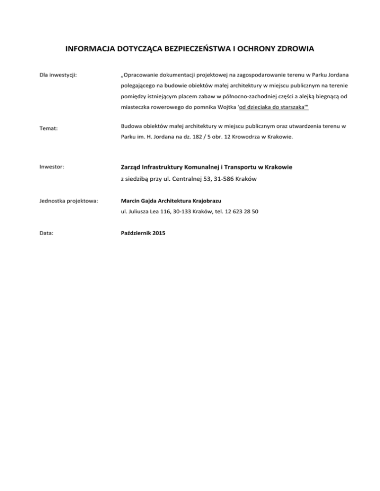 INFORMACJA DOTYCZĄCA BEZPIECZEŃSTWA I OCHRONY ZDROWIA Dla inwestycji: „Opracowanie dokumentacji projektowej na zagospodarowanie terenu w Parku Jordana polegającego na budowie obiektów małej architektury w miejscu publicznym na terenie pomiędzy istniejącym placem zabaw w północno-zachodniej części a alejką biegnącą od miasteczka rowerowego do pomnika Wojtka 'od dzieciaka do starszaka'" Temat: Budowa obiektów małej architektury w miejscu publicznym oraz utwardzenia terenu w Parku im. H. Jordana na dz. 182 / 5 obr. 12 Krowodrza w Krakowie. Inwestor: Zarząd Infrastruktury Komunalnej i Transportu w Krakowie z siedzibą przy ul. Centralnej 53, 31-586 Kraków Jednostka projektowa: Marcin Gajda Architektura Krajobrazu ul. Juliusza Lea 116, 30-133 Kraków, tel. 12 623 28 50 Data: Październik 2015 1. Zakres robót dla całego zamierzenia budowlanego oraz kolejność realizacji poszczególnych obiektów. Zamierzenie budowlane: „Budowa obiektów małej architektury w miejscu publicznym oraz utwardzenia terenu w Parku im. H. Jordana na dz. 182 / 5 obr. 12 Krowodrza w Krakowie. Prace obejmują – budowę obiektów małej architektury placu zabaw w istniejącym parku: urządzeń do wspinania w postaci dwóch linowych piramid połączonych ze sobą specjalnym łącznikiem – tunelem do przechodzenia oraz tablicy informacyjnej, koszy na odpadki oraz ławki z oparciami a także budowę nawierzchni piaskowej z obrzeżem z palisady drewnianej. Inwestycja nie obejmuje swoim zakresem budowy obiektów kubaturowych. Planowane zamierzenie budowlane realizowane będzie jednoetapowo. Kolejność wykonywania poszczególnych prac: - wykonanie zabezpieczeń placu budowy, oczyszczenie terenu i wytyczenie obiektu; - rozbiórka istniejącej obiektu małej architektury (zjeżdżalnia) - wykonanie wykopów fundamentowych; - wykonanie wykopów pod nawierzchnię; - budowa obiektów placu zabaw; - budowa obrzeża oraz nawierzchni; - montaż obiektów małej architektury (ławki, kosze na odpadki, tablica informacyjna). 2. Wykaz istniejących obiektów budowlanych. W obrębie zakresu inwestycji, na dz. 182/5 obr. 12 Krowodrza nie występują obiekty budowlane poza obiektem małej architektury (zjeżdżalnia) przeznaczonym do rozbiórki. 3. Wskazanie elementów zagospodarowania działki lub terenu, które mogą stwarzać zagrożenie bezpieczeństwa i zdrowia ludzi. 3.1 Projekt w małym stopniu ingeruje w zagospodarowanie działki, zagrożenie może stanowić wykonywanie prac na terenie ogólnodostępnego parku publicznego. 4. Wskazanie dotyczące przewidywanych zagrożeń występujących podczas realizacji robót budowlanych, określające skalę i rodzaje zagrożeń oraz miejsce ich wystąpienia. 4.1 Roboty budowlane. Zagrożenia występujące przy wykonywaniu robót budowlanych: a) Upadek pracownika z wysokości: - Prace przy wykonywaniu wykopów - prace przy budowie obiektów placu zabaw (piramidy) b) Przygniecenie pracownika : - przygniecenie przez rusztowanie, 1. Przy wykonaniu robót budowlanych może być zatrudniony tylko pracownik, który: - posiada kwalifikacje przewidziane odrębnymi przepisami dla danego stanowiska, - uzyskał orzeczenie lekarskie o dopuszczeniu do określonej pracy. 2. Przy robotach na wysokości stanowiska pracy oraz przejścia należy zabezpieczyć barierką składającą się : - z deski krawężnikowej wys. 15,00 cm; - poręczy ochronnej wys. 1,10 m. Pomosty robotnicze wykonane z desek lub bali powinny być dostosowane do przewidzianego obciążenia i zabezpieczone przed zmianą ich położenia. 3. Roboty ziemne i przygotowawcze: - zabezpieczenie wykopów fundamentowych przed obsypywaniem ziemi zgodnie ze sztuką budowlaną - dodatkowe wykopy o ścianach pionowych (nie umocnionych) mogą być wykonane tylko w gruntach stałych o głębokości 1,00 m, gdy teren przy wykopie nie jest obciążony w pasie o szerokości równej głębokości wykopu; 4. Roboty betonowe i żelbetowe. - przy dostawie masy betonowej samochodami punkt zsypu powinien być wyposażony w odbojnice zabezpieczające samochód przed stoczeniem się; - wylewanie masy betonowej w deskowanie nie może być wykonywane z wysokości większej niż 1,00 m; - deskowanie powinno być zabezpieczone przed rozszczelnieniem. 5. Roboty ciesielskie: - cięcie drewna piłą tarczową jest dozwolone po osiągnięciu przez nią pełnych obrotów przy prawidłowo założonych osłonach i klinie rozszczepiającym; - przy pracy ręczną piłą mechaniczną drewno przeznaczone do cięcia powinno być unieruchomione; - ręczne podawanie w pionie materiałów długich np. desek lub bali jest dozwolone do wysokości 3,0m, - rozbiórkę deskowania należy prowadzić ze szczególną ostrożnością zabezpieczając się przed możliwością zawalenia się elementów deskowania; - roboty związane z impregnacją drewna powinny być wykonane przez pracowników zapoznanych z występującymi zagrożeniami i odpowiednio przeszkolonych. 5. Wskazanie sposobu prowadzenia instruktażu pracowników przed przystąpieniem do realizacji robót szczególnie niebezpiecznych. Szkolenia w dziedzinie bezpieczeństwa i higieny pracy dla pracowników zatrudnionych na stanowiskach robotniczych, przeprowadza się jako szkolenie wstępne i szkolenie okresowe. Szkolenia te przeprowadzane są w oparciu o programy poszczególnych rodzajów szkolenia. Szkolenia wstępne ogólne („instruktaż ogólny") przechodzą wszyscy nowo zatrudniani pracownicy przed opuszczeniem do wykonywania pracy. Obejmuje ono zapoznanie pracowników z podstawowymi przepisami bhp zawartymi w Kodeksie pracy, w układach zbiorowych pracy i regulaminach pracy, zasadami bhp obowiązującymi w danym zakładzie pracy oraz zasadami udzielania pierwszej pomocy. Szkolenie wstępne na stanowisku pracy („Instruktaż stanowiskowy") powinien zapoznać pracowników z zagrożeniami występującymi na określonym stanowisku pracy, sposobami ochrony przed zagrożeniami, oraz metodami bezpieczne