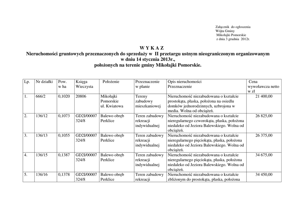Załącznik do ogłoszenia Wójta Gminy Mikołajki Pomorskie z dnia 3 grudnia 2012r. WYKAZ Nieruchomości gruntowych przeznaczonych do sprzedaży w II przetargu ustnym nieograniczonym organizowanym w dniu 14 stycznia 2013r., położonych na terenie gminy Mikołajki Pomorskie. Lp. Nr działki Pow. w ha Księga Wieczysta Położenie Przeznaczenie w planie Opis nieruchomości Przeznaczenie 1. 666/2 0,1020 20806 Mikołajki Pomorskie ul. Kwiatowa Tereny zabudowy mieszkaniowej Nieruchomość niezabudowana o kształcie prostokąta, płaska, położona na osiedlu domków jednorodzinnych, uzbrojona w media. Wolna od obciążeń. Nieruchomość niezabudowana o kształcie nieregularnego czworokąta, płaska, położona niedaleko od Jeziora Balewskiego. Wolna od obciążeń. Nieruchomość niezabudowana o kształcie nieregularnego pięciokąta, płaska, położona niedaleko od Jeziora Balewskiego. Wolna od obciążeń. Nieruchomość niezabudowana o kształcie nieregularnego pięciokąta, płaska, położona niedaleko od Jeziora Balewskiego. Wolna od obciążeń. Nieruchomość niezabudowana o kształcie zbliżonym do prostokąta, płaska, położona 2. 136/12 0,1073 GD2I/00007 Balewo obręb 324/8 Perklice Teren zabudowy rekreacji indywidualnej 3. 136/13 0,1055 GD2I/00007 Balewo obręb 324/8 Perklice Teren zabudowy rekreacji indywidualnej 4. 136/15 0,1387 GD2I/00007 Balewo obręb 324/8 Perklice Teren zabudowy rekreacji indywidualnej 5. 136/16 0,1378 GD2I/00007 Balewo obręb 324/8 Perklice Teren zabudowy rekreacji Cena wywoławcza netto w zł 21 400,00 26 825,00 26 375,00 34 675,00 34 450,00 indywidualnej niedaleko od Jeziora Balewskiego. Wolna od obciążeń. Nieruchomość niezabudowana o kształcie zbliżonym do prostokąta, płaska, położona niedaleko od Jeziora Balewskiego. Wolna od obciążeń. Nieruchomość niezabudowana o kształcie zbliżonym do prostokąta, płaska, położona niedaleko od Jeziora Balewskiego. Wolna od obciążeń. Nieruchomość niezabudowana o kształcie nieregularnego pięciokąta, płaska, położona niedaleko od Jeziora Balewskiego. Wolna od obciążeń. Nieruchomość niezabudowana o kształcie nieregularnym, płaska, położona niedaleko od Jeziora Balewskiego. Wolna od obciążeń. 6. 136/17 0,1272 GD2I/00007 Balewo obręb 324/8 Perklice Teren zabudowy rekreacji indywidualnej 7. 136/21 0,0906 GD2I/00007 Balewo obręb 324/8 Perklice Teren zabudowy rekreacji indywidualnej 8. 136/23 0,0846 GD2I/00007 Balewo obręb 324/8 Perklice Teren zabudowy rekreacji indywidualnej 9. 136/24 0,1186 GD2I/00007 Balewo obręb 324/8 Perklice Teren zabudowy rekreacji indywidualnej 10. 136/25 0,1335 GD2I/00007 Balewo obręb 324/8 Perklice 11. 136/27 0,1699 GD2I/00007 Balewo obręb 324/8 Perklice 12. 136/28 0,0565 GD2I/00007 Balewo obręb 324/8 Perklice Teren zabudowy Nieruchomość niezabudowana o kształcie rekreacji zbliżonym do prostokąta, płaska, położona indywidualnej niedaleko od Jeziora Balewskiego. Wolna od obciążeń. Teren zabudowy Nieruchomość niezabudowana o kształcie rekreacji nieregularnego czworokąta, płaska, położona indywidualnej niedaleko od Jeziora Balewskiego. Wolna od obciążeń. Teren zabudowy Nieruchomość niezabudowana o kształcie rekreacji nieregularnego pięciokąta, płaska, położona indywidualnej niedaleko od Jeziora Balewskiego. Wolna od obciążeń. 31 800,00 22 650,00 21 150,00 29 650,00 33 375,00 42 475,00 14 125,00 13. 136/29 0,0514 GD2I/00007 Balewo obręb 324/8 Perklice 14. 136/30 0,0514 GD2I/00007 Balewo obręb 324/8 Perklice 15. 136/31 0,0514 GD2I/00007 Balewo obręb 324/8 Perklice 16. 136/32 0,0612 GD2I/00007 Balewo obręb 324/8 Perklice 17. 136/33 0,0638 GD2I/00007 Balewo obręb 324/8 Perklice 18. 136/38 0,0622 GD2I/00007 Balewo obręb 324/8 Perklice 19. 136/39 0,1595 GD2I/00007 Balewo obręb 324/8 Perklice 20. 136/40 0,1678 GD2I/00007 Balewo obręb 324/8 Perklice Teren zabudowy Nieruchomość niezabudowana o kształcie rekreacji zbliżonym do prostokąta, płaska, położona indywidualnej niedaleko od Jeziora Balewskiego. Wolna od obciążeń. Teren zabudowy Nieruchomość niezabudowana o kształcie rekreacji zbliżonym do prostokąta, płaska, położona indywidualnej niedaleko od Jeziora Balewskiego. Wolna od obciążeń. Teren zabudowy Nieruchomość niezabudowana o kształcie rekreacji zbliżonym do prostokąta, płaska, położona indywidualnej niedaleko od Jeziora Balewskiego. Wolna od obciążeń. Teren zabudowy Nieruchomość niezabudowana o kształcie rekreacji nieregularnego sześciokąta, płaska, położona indywidualnej niedaleko od Jeziora Balewskiego. Wolna od obciążeń. Teren zabudowy Nieruchomość niezabudowana o kształcie rekreacji nieregularnego sześciokąta, płaska, położona indywidualnej niedaleko od Jeziora Balewskiego. Wolna od obciążeń. Teren zabudowy Nieruchomość niezabudowana o kształcie rekreacji nieregularnego pięciokąta, płaska, położona indywidualnej niedaleko od Jeziora Balewskiego. Wolna od obciążeń. Teren zabudowy Nieruchomość niezabudowana o kształcie rekreacji nieregularnego pięciokąta, płaska, położona indywidualnej niedaleko od Jeziora Balewskiego. Wolna od obciążeń. Teren zabudowy Nieruchomość niezabudowana o kształcie rekreacji nieregularnego pięciokąta, płaska, położona indywidualnej niedaleko od Jeziora Balewskiego. Wolna od obciążeń. 12 850,00 12 850,00 12 850,00 15 300,00 15 950,00 15 550,00 39 875,00 41 950,00 21. 136/41 0,0964 GD2I/00007 Balewo obręb 324/8 Perklice 22. 136/42 0,0523 GD2I/00007 Balewo obręb 324/8 Perklice 23. 136/43 0,0494 GD2I/00007 Balewo obręb 324/8 Perklice 24. 136/44 0,0650 GD2I/00007 Balewo obręb 324/8 Perklice 25. 136/45 0,0548 GD2I/00007 Balewo obręb 324/8 Perklice 26. 136/46 0,0417 GD2I/00007 Balewo obręb 324/8 Perklice 27. 136/47 0,1437 GD2I/00007 Balewo obręb 324/8 Perklice 28. 136/48 0,1910 GD2I/00007 Balewo obręb 324/8 Perklice Teren zabudowy Nieruchomość niezabudowana o kształcie rekreacji nieregularne