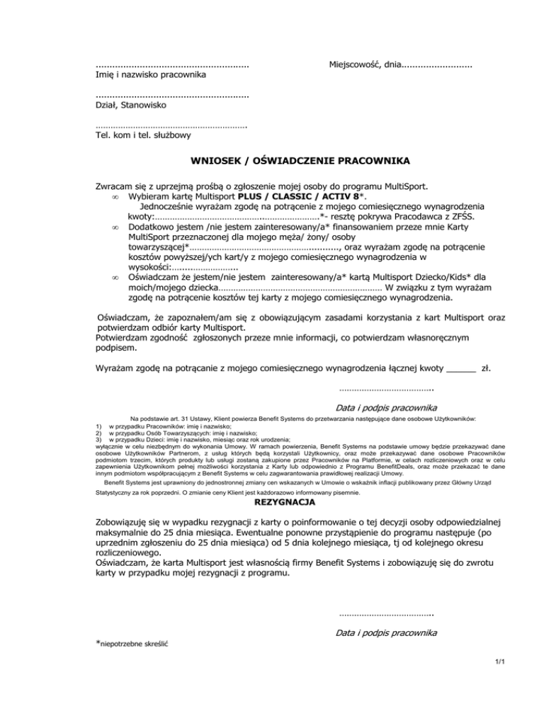........................................................ Imię i nazwisko pracownika Miejscowość, dnia.......................... ........................................................ Dział, Stanowisko ……………………………………………………. Tel. kom i tel. służbowy WNIOSEK / OŚWIADCZENIE PRACOWNIKA Zwracam się z uprzejmą prośbą o zgłoszenie mojej osoby do programu MultiSport. • Wybieram kartę Multisport PLUS / CLASSIC / ACTIV 8*. Jednocześnie wyrażam zgodę na potrącenie z mojego comiesięcznego wynagrodzenia kwoty:……………………………………..………………….*- resztę pokrywa Pracodawca z ZFŚS. • Dodatkowo jestem /nie jestem zainteresowany/a* finansowaniem przeze mnie Karty MultiSport przeznaczonej dla mojego męża/ żony/ osoby towarzyszącej*…………………………………………..........., oraz wyrażam zgodę na potrącenie kosztów powyższej/ych kart/y z mojego comiesięcznego wynagrodzenia w wysokości:….....……………... • Oświadczam że jestem/nie jestem zainteresowany/a* kartą Multisport Dziecko/Kids* dla moich/mojego dziecka………………………………………………………… W związku z tym wyrażam zgodę na potrącenie kosztów tej karty z mojego comiesięcznego wynagrodzenia. Oświadczam, że zapoznałem/am się z obowiązującym zasadami korzystania z kart Multisport oraz potwierdzam odbiór karty Multisport. Potwierdzam zgodność zgłoszonych przeze mnie informacji, co potwierdzam własnoręcznym podpisem. Wyrażam zgodę na potrącanie z mojego comiesięcznego wynagrodzenia łącznej kwoty ______ zł. ……………………………….. Data i podpis pracownika Na podstawie art. 31 Ustawy, Klient powierza Benefit Systems do przetwarzania następujące dane osobowe Użytkowników: 1) w przypadku Pracowników: imię i nazwisko; 2) w przypadku Osób Towarzyszących: imię i nazwisko; 3) w przypadku Dzieci: imię i nazwisko, miesiąc oraz rok urodzenia; wyłącznie w celu niezbędnym do wykonania Umowy. W ramach powierzenia, Benefit Systems na podstawie umowy będzie przekazywać dane osobowe Użytkowników Partnerom, z usług których będą korzystali Użytkownicy, oraz może przekazywać dane osobowe Pracowników podmiotom trzecim, których produkty lub usługi zostaną zakupione przez Pracowników na Platformie, w celach rozliczeniowych oraz w celu zapewnienia Użytkownikom pełnej możliwości korzystania z Karty lub odpowiednio z Programu BenefitDeals, oraz może przekazać te dane innym podmiotom współpracującym z Benefit Systems w celu zagwarantowania prawidłowej realizacji Umowy. Benefit Systems jest uprawniony do jednostronnej zmiany cen wskazanych w Umowie o wskaźnik inflacji publikowany przez Główny Urząd Statystyczny za rok poprzedni. O zmianie ceny Klient jest każdorazowo informowany pisemnie. REZYGNACJA Zobowiązuję się w wypadku rezygnacji z karty o poinformowanie o tej decyzji osoby odpowiedzialnej maksymalnie do 25 dnia miesiąca. Ewentualne ponowne przystąpienie do programu następuje (po uprzednim zgłoszeniu do 25 dnia miesiąca) od 5 dnia kolejnego miesiąca, tj od kolejnego okresu rozliczeniowego. Oświadczam, że karta Multisport jest własnością firmy Benefit Systems i zobowiązuję się do zwrotu karty w przypadku mojej rezygnacji z programu. ……………………………….. Data i podpis pracownika *niepotrzebne skreślić 1/1