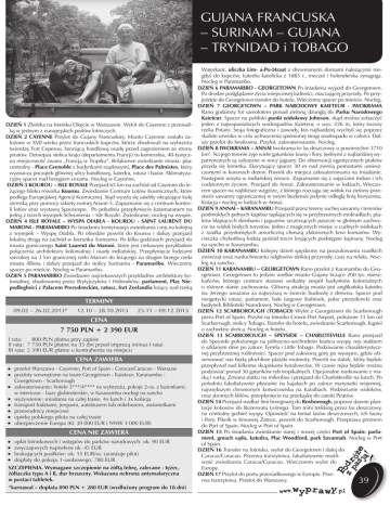 GUJANA FRANCUSKA – SURINAM – GUJANA – TRYNIDAD i TOBAGO DZIEŃ 1 Zbiórka na lotnisku Okęcie w Warszawie. Wylot do Cayenne z przesiadką w jednym z europejskich portów lotniczych. DZIEŃ 2 CAYENNE Przylot do Gujany Francuskiej. Miasto Cayenne zostało założone w XVII wieku przez francuskich kupców, którzy zbudowali na wybrzeżu twierdzę Fort Ceperou, broniącą handlową osadę przed zagrożeniem ze strony piratów. Dzisiejsza stolica kraju (departamentu Francji) to kameralna, 40-tysięczna miejscowość zwana „Francją w Tropiku”. Relaksowe zwiedzanie miasta: plac centralny - Place Grenoble z budynkami rządowymi, Place des Palmistes, który wyznacza początek głównej ulicy handlowej, katedra, ratusz i bazar. Aklimatyzacyjny spacer nad brzegiem oceanu. Nocleg w Cayenne. DZIEŃ 3 KOUROU – ISLE ROYALE Przejazd 65 km na zachód od Cayenne do leżącego blisko równika Kourou. Zwiedzanie Centrum Lotów Kosmicznych, które podlega Europejskiej Agencji Kosmicznej. Stąd wysyła się satelity okrążające kulę ziemską przy pomocy rakiety nośnej Ariane 5. Zapoznanie się z centrum kontroli lotów oraz wystawą Spaceexpo. Po południu przepłynięcie katamaranem na jedną z trzech wysepek Schronienia – Isle Royale. Zwiedzanie, nocleg na wyspie. DZIEŃ 4 ISLE ROYALE – WYSPA DIABŁA - KOUROU - SAINT LAURENT DU MARONI - PARAMARIBO Po śniadaniu kontynuacja zwiedzania i rejs na kolejną z wysepek – Wyspę Diabła. Po obiedzie powrót do Kourou i dalszy przejazd lokalną drogą na zachód w kierunku Surinamu. Po kilku godzinach przyjazd do miasta granicznego Saint Laurent du Maroni, które jest ciekawym przykładem połączenia architektury kolonialnej i osady indiańskiej. Przepłynięcie łodziami szerokiej na 3 km granicznej rzeki Maroni do leżącego na drugim brzegu rzeki miasta Albina i dalszy przejazd do stolicy Surinamu - Paramaribo. Wieczorny spacer po mieście. Nocleg w Paramaribo. DZIEŃ 5 PARAMARIBO Zwiedzanie najciekawszych przykładów architektury kolonialnej, zbudowanej przez Brytyjczyków i Holendrów: parlament, Plac Niepodległości z Pałacem Prezydenckim, ratusz, fort Zeelandia leżący nad rzeką TERMINY 09.02 – 26.02.2013* 12.10 – 28.10.2013 23.11 – 09.12.2013 CENA 7 750 PLN + 2 390 EUR I rata: 800 PLN płatna przy zapisie II rata: 7 750 PLN płatne na 35 dni przed imprezą (minus I rata) III rata: 2 390 EUR płatne u kontrahenta na miejscu CENA ZAWIERA ·przelot Warszawa - Cayenne; Port of Spain - Caracas/Curacao - Warszaw ·przeloty wewnętrzne na trasie Georgetown - Kaieteur; Karanambu Goergetown - Scarborough ·zakwaterowanie: hotele 3***/4**** na wybrzeżu, pokoje 2-os. z łazienkami; w interiorze - bazy globtroterskie, w Karanambu noclegi na rancho · wyżywienie: sniadania na całej trasie, 4x lunch i 3x kolacja · transport łodziami, jeepami, autobusem lub mikrbusem, awionetkami · przewodnicy miejscowi · opiekę polskiego pilota na całej trasie · ubezpieczenie Europa (KL 30 000 EUR i NNW 3 000 EUR) CENA NIE ZAWIERA · · · · opłat lotniskowych i wstępów do parków narodowych: ok. 90 EUR zwyczajowych napiwkow ok. 45 EUR brakujących posiłków: ok. 15 EUR/os. (aranżuje pilot) dopłaty do pokoju 1-osobowego: 780 EUR SZCZEPIENIA. Wymagane szczepienie na żółtą febrę, zalecane - tężec, żółtaczka typu A i B, dur brzuszny. Wskazana ochrona antymalaryczna w postaci tabletek. *karnawał – dopłata 890 PLN + 280 EUR (wydłużony program do 18 dni) Waterkant, uliczka Lim- a-Po-Straat z drewnianymi domami należącymi niegdyś do kupców, katedra katolicka z 1885 r., meczet i holenderska synagoga. Nocleg w Paramaribo. DZIEŃ 6 PARAMARIBO - GEORGETOWN Po śniadaniu wyjazd do Georgetown. Po drodze podglądanie życia miejscowej ludności, otaczającej przyrody. Po przyjeździe do Georgetown transfer do hotelu. Wieczorny spacer po mieście. Nocleg. DZIEŃ 7 GEORGETOWN – PARK NARODOWY KAIETEUR - IWOKRAMA Rano godzinny lot samolotem ponad zieloną dżunglą do Parku Narodowego Kaieteur. Spacer na pobliski punkt widokowy Johnson, skąd można zobaczyć jeden z najwspanialszych wodospadów Kaieteur, o wys. 226 m, który tworzy rzeka Potaro. Sesja fotograficzna i zawody, kto najbardziej wychyli się poprzez skaliste urwisko w celu uchwycenia spienionej strugi wodospadu w całości. Dalszy przelot do Iwokrama. Przylot, zakwaterowanie. Nocleg. DZIEŃ 8 IWOKRAMA – ANNAI Iwokrama to las deszczowy o powierzchni 3710 km2. Na jego terenie żyje wiele gatunków fauny i flory. Jednymi z najbardziej wypatrywanych są usłyszane w nocy jaguary. Do obserwacji egzotycznych ptaków przyda się lornetka. Ekscytujący spacer 30 m nad ziemią pomostami umieszczonymi w koronach drzew. Powrót do miejsca zakwaterowania na śniadanie. Następnie wizyta w indiańskiej wiosce. Zapoznanie się z zajęciami Indian i ich codziennym życiem. Przejazd do Annai. Zakwaterowanie w lodżach. Wieczorem spacer na najbliższe wzgórze, z którego rozciąga się widok na zielony przestwór sawanny ograniczonej w swym bezkresie jedynie odległą linią horyzontu. Kolacja i nocleg w lodżach w Annai. DZIEŃ 9 ANNAI – KARANAMBU Przejazd przez tereny suchej sawanny i terenów podmokłych pełnych kapibar taplających się w przybrzeżnych mokradłach, ptaków kłapiących dziobami i jaguarów szczerzących paszcze w głośnym zachwycie na widok białych turystów. Jedno z magicznych miejsc o cudnych widokach z rzadka przysłoniętych amorficzną chmurą złaknionych krwi komarów. Wycieczka chybotliwą łodzią pośród trzcin kryjących podstępne kajmany. Nocleg na rancho w Karanambu. DZIEŃ 10 KARANAMBU Kolejny dzień spędzony na poszukiwaniu rzadkich zwierząt oraz nasłuchiwaniu odgłosów dzikiej przyrody, czas na relaks. Nocleg na rancho. DZIEŃ 11 KARANAMBU – GEORGETOWN Rano przelot z Karanambu do Georgetown. Georgetown to jedyne wielkie miasto Gujany liczące 200 tys. mieszkańców, którego centrum stanowi unikalny zespół budynków kolonialnych o r