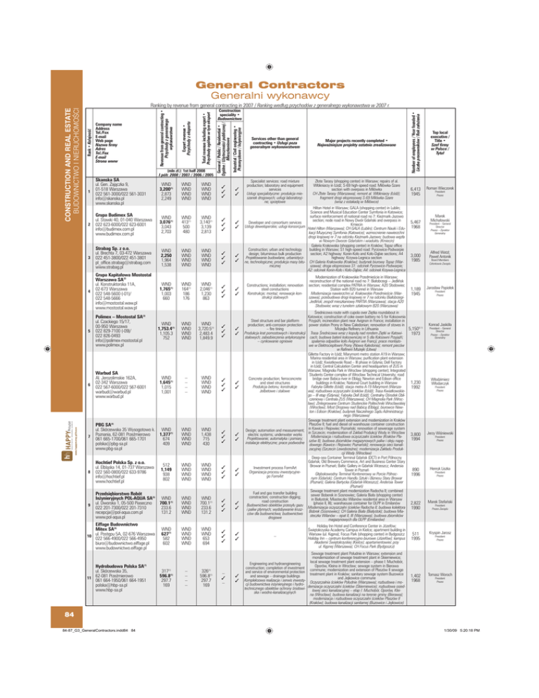 Services other than general contracting • Usługi poza generalnym wykonawstwem Major projects recently completed • Najważniejsze projekty ostatnio zrealizowane Number of employees / Year founded • Liczba pracowników / Rok założenia Industrial / Civil engineering • Przemysłowe / Inżynieryjne (mln zł.): 1st half 2008 I półr. 2008 / 2007 / 2006 / 2005 Construction speciality • Budownictwo General / Public / Residential • Ogólne / Użyteczności publicznej / Mieszkaniowe Total revenue including export • Przychody ogółem w tym eksport Export revenue • Przychody z eksportu Company name Address Tel./Fax E-mail Web page Nazwa firmy Adres Tel./Fax E-mail Strona www Revenue from general contracting • Przychody z generalnego wykonawstwa Ranking by revenue from general contracting in 2007 / Ranking według przychodów z generalnego wykonawstwa w 2007 r. Rank • Kolejność CONSTRUCTION AND REAL ESTATE BUDOWNICTWO I NIERUCHOMOŚCI General Contractors Generalni wykonawcy Specialist services: road mixture production; laboratory and equipment services Usługi specjalistyczne: produkcja mieszanek drogowych; usługi laboratoryjne; sprzętowe Złote Tarasy (shopping center) in Warsaw; repairs of al. Włókniarzy in Łódź; S-69 high-speed road: Milówka-Szare section with overpass in Milówka CH Złote Tarasy (Warszawa); remont al. Włókniarzy (Łódź); fragment drogi ekspresowej S-69 Milówka-Szare (wraz z estakadą w Milówce) 6,413 1945 1 Skanska SA ul. Gen. Zajączka 9, 01-518 Warszawa 022 561-3000/022 561-3031 [email protected] www.skanska.pl 2 Grupa Budimex SA ul. Stawki 40, 01-040 Warszawa 022 623-6000/022 623-6001 [email protected] www.budimex.com.pl WND 3,076(1) 3,043 2,703 WND 413(1) 500 480 WND 3,140(1) 3,139 2,813 ✓ ✓ ✓ ✓ ✓ 3 Strabag Sp. z o.o. ul. Brechta 7, 03-472 Warszawa 022 451-3800/022 451-3801 [email protected] www.strabag.pl WND 2,250 1,964 1,538 WND WND WND WND WND WND WND WND ✓ ✓ ✓ ✓ ✓ 4 Grupa Kapitałowa Mostostal Warszawa SA(2) ul. Konstruktorska 11A, 02-673 Warszawa 022 548-5600 (-01)/ 022 548-5666 [email protected] www.mostostal.waw.pl 5 Polimex – Mostostal SA(3) ul. Czackiego 15/17, 00-950 Warszawa 022 829-7100 (-09)/ 022 826-0493 [email protected] www.polimex.pl WND 1,753.4(1) 1,105.3 752 WND WND WND WND WND 3,720.5(1) 2,483.4 1,849.9 ✓ ✓ ✓ ✓ ✓ Steel structure and bar platform production; anti-corrosion protection – fire tining Produkcja krat pomostowych i konstrukcji stalowych; zabezbieczenia antykorozyjne – cynkowanie ogniowe 6 Warbud SA Al. Jerozolimskie 162A, 02-342 Warszawa 022 567-6000/022 567-6001 [email protected] www.warbud.pl WND 1,645(1) 1,015 1,001 – – – – WND WND WND WND ✓ ✓ ✓ ✓ ✓ Concrete production; ferroconcrete and steel structures Produkcja betonu; konstrukcje żelbetowe i stalowe 7 PBG SA(4) ul. Skórzewska 35 Wysogotowo k. WND Poznania, 62-081 Przeźmierowo 1,377(1) 061 665-1700/061 665-1701 674 [email protected] 409 www.pbg-sa.pl WND WND WND WND WND 1,438 715 430 ✓ ✓ ✓ ✓ ✓ Design; automation and measurement; electric systems; underwater works Projektowanie; automatyka i pomiary; instalacje elektryczne; prace podwodne 8 Hochtief Polska Sp. z o.o. ul. Elbląska 14, 01-737 Warszawa 022 560-0800/022 633-9786 [email protected] www.hochtief.pl 512 1,149 938 802 WND WND WND WND WND WND WND WND ✓ ✓ ✓ ✓ ✓ Investment process FormArt Organizacja procesu inwestycyjnego FormArt 9 Przedsiębiorstwo Robót Inżynieryjnych POL-AQUA SA(5) WND ul. Dworska 1, 05-500 Piaseczno 700.1(1) 022 201-7300/022 201-7310 233.6 [email protected] 131.2 www.pol-aqua.pl WND WND WND WND WND 700.1(1) 233.6 131.2 ✓ ✓ ✓ ✓ ✓ Fuel and gas transfer building constraction; construction digging; road construction Budownictwo obiektów przesyłu gazu i paliw płynnych; wydobywanie kruszców dla budownictwa; budownictwo drogowe WND WND WND WND WND WND 653 694 ✓ ✓ ✓ ✓ ✓ Eiffage Budownictwo Mitex SA(6) ul. Postępu 5A, 02-676 Warszawa 10 022 566-4900/022 566-4950 [email protected] www.budownictwo.eiffage.pl Hydrobudowa Polska SA(7) ul. Skórzewska 35, 62-081 Przeźmierowo 11 061 664-1950/061 664-1951 [email protected] www.hbp-sa.pl WND 3,200(1) 2,873 2,249 WND 1,765(1) 1,003 660 WND 627(1) 582 602 317(1) 596.8(1) 297.7 169 WND WND WND WND WND 164(1) 186 176 – – – – WND WND WND WND WND 2,046(1) 1,230 863 326(1) 596.8(1) 297.7 169 ✓ ✓ ✓ ✓ ✓ ✓ – ✓ – ✓ ✓ ✓ ✓ ✓ ✓ Hilton Hotel in Warsaw; GALA (shopping center) in Lublin; Science and Musical Education Center Symfonia in Katowice; surface reinforcement of national road no 7: Kieżmark-Jazowo section; node road in Nowy Dwór Gdański and overpass in Developer and consortium services Usługi deweloperskie; usługi konsorcjum Hotel Hilton (Warszawa); CHKmiecin GALA (Lublin); Centrum Nauki i Edukacji Muzycznej Symfonia (Katowice); wzmocnienie nawierzchni drogi krajowej nr 7 na odcinku Kieżmark-Jazowo; budowa węzła w Nowym Dworze Gdańskim i wiaduktu (Kmiecin) Galeria Krakowska (shopping center) in Kraków; Topaz office Construction; urban and technology building in Warsaw; S1 high-speed road: Pyrzowice-Podwarpie design; bituminous bulk production section; A2 highway: Konin-Koło and Koło-Dąbie sections; A4 Projektowanie budowlane, urbanistyczhighway: Krzywa-Legnica section ne, technologiczne; produkcja masy bitu- CH Galeria Krakowska (Kraków); budynek biurowy Topaz (Warmicznej szawa); droga ekspresowa S1: odcinek Pyrzowice-Podwarpie; A2: odcinek Konin-Koło i Koło-Dąbie; A4: odcinek Krzywa-Legnica Constructions; installation; renovation steel constuctions Konstrukcje; montaż; renowacje konstrukcji stalowych Modernization of Krakowskie Przedmieście in Warsaw; reconstruction of the national road no 7: Białobrzegi – Jedlińsk section; residential complex PATRIA in Warsaw; A20 Słodowiec Station with B20 tunnel in Warsaw Modernizacja nawierzchni ul. Krakowskie Przedmieście (Warszawa); przebudow