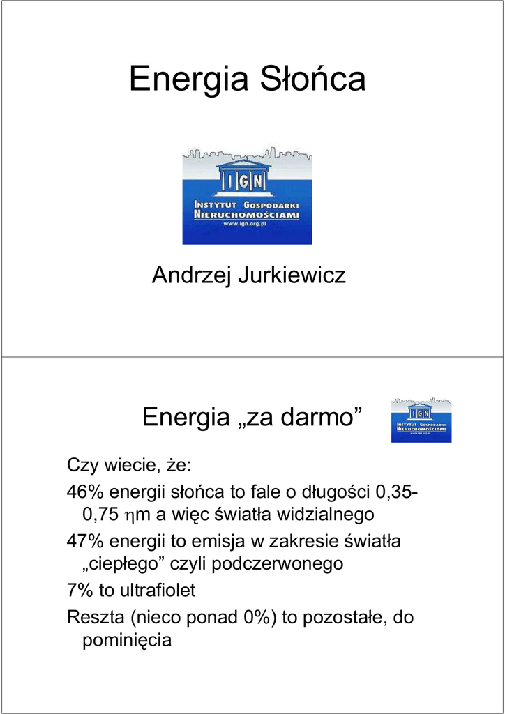 Energia Słońca Andrzej Jurkiewicz Energia „za darmo” Czy wiecie, Ŝe: 46% energii słońca to fale o długości 0,350,75 ηm a więc światła widzialnego 47% energii to emisja w zakresie światła „ciepłego” czyli podczerwonego 7% to ultrafiolet Reszta (nieco ponad 0%) to pozostałe, do pominięcia Moc promieniowania Słońca: 170*10^9 MW. Jest to 1,5 * 10^15 MWh w ciągu roku. Rocznie dla cywilizacji potrzebujemy: 300 * 10^9 MWh = 2 godziny „świecenia” Słońca Średni strumień energii słonecznej dostarczanej do zewnętrznej warstwy atmosfery i przeliczonej na 1m2 powierzchni Ziemi, wynosi: 1367 W/m2 nosi nazwę stałej słonecznej Promieniowanie gamma do 10-3 nm Promieniowanie rentgenowskie od 10-3 nm do 100 nm Promieniowanie optyczne UV (ultrafiolet) – 7% promieniowania Od 100 nm do 380 nm Światło widzialne - 46% promieniowania Od 380 nm do 780 nm Promieniowanie optyczne IR (podczerwień) – 47% promieniowania Mikrofale Od 780 nm do 1mm (106 nm) Fale radiowe UKF, FM, AM Od 1m do 3 km Od 1mm do 1m Zasoby energii słonecznej w Polsce W promieniowaniu słonecznym docierającym do powierzchni Ziemi wyróŜnia się trzy składowe promieniowania: •bezpośrednie pochodzi od widocznej tarczy słonecznej, •rozproszone powstaje w wyniku wielokrotnego załamania na składnikach atmosfery, •odbite powstaje w skutek odbić od elementów krajobrazu i otoczenia. Zasada działania kolektora słonecznego. Kolektory słoneczne słuŜą do odbioru energii cieplnej promieniowania słonecznego i przekazywania jej poprzez tzw. czynnik grzewczy i wymiennik ciepła znajdujący się w zbiorniku (bojlerze) do realizacji celów uŜytkowych, np. ogrzewania: •pomieszczeń, •basenów kąpielowych, •ciepłej wody uŜytkowej. Rodzaje kolektorów płaskich 1) Absorber z powłoką lakierową czarną 2) Absorber z powłoką selektywną (15-20%) 3) Absorber z powłoką selektywną w próŜni (brak strat konwekcji i przewodzenia) 4) Kolektor zasobnikowy (woda krąŜy w absorberze) Kolektory rurowe 1) PróŜniowo-rurowe z przepływem czynnika solarnego - Przepływ rura w rurze - Dwa kolektory (zasilajacy i powrotny) 2) Heat-Pipe (rurka cieplna) - Ciecz parująca (np. alkohol) - Pompa ciepła - Mała ilość czynnika solarnego PróŜniowy czy płaski Parametr Kolektor próŜniowy Kolektor płaski izolacja próŜnia Wełna mineralna sprawność 85% 70% (60%) naprawa 1 rura Cała szyba obiegi rozdzielone wspólne start Od razu Musi się nagrzać cena 2000 zł/m2 (?) 1500 zł/m2 Zestaw na 4-6 osób (7.000 zł) • PróŜniowe kolektory słoneczne rurowe (30rur), • Sterownik solarny • Zbiorniki 300 litrów z podwójną węŜownicą i grzałką elektryczną 1,5 kW, • Płyn solarny na bazie glikolu propylenowego około 20 litrów Typowy kolektor słoneczny do przygotowania ciepłej wody uŜytkowej 6 2 4 8 3 7 1 5 Efektywność kolektora słonecznego • wysoki współczynnik absorpcji krótkofalowego promieniowania słonecznego λ = ok. 0,95 • współczynnik emisji, który w jak najmniejszy np. ε = 0,1. •sprawność kolektorów moŜe sięgać nawet 85 % ale równie dobrze moŜe wynosić 10% (średniorocznie ok. 50%) Zalety kolektora słonecznego: • ogó ogólnodostę lnodostępna energia sł słoneczna • nieszkodliwy dla środowiska naturalnego • wysoka sprawność sprawność energetyczna • oszczę oszczędność dność tradycyjnych noś nośnikó ników energii, dla potrzeb ciepł ciepłej wody uŜ uŜytkowej rzę rzędu 65% w skali roku • oszczę oszczędność dność przy podgrzewaniu wody w otwartym basenie kąpielowym rzę rzędu 90% w okresie letnim, powodują powodującym wydł wydłuŜenie okresu uŜ uŜytkowania basenu o ok. 4 miesią miesiące • niewielkie zuŜ zuŜycie prą prądu przez ukł układ regulacyjnoregulacyjno-zabezpieczają zabezpieczający • automatyczna regulacja bez ingerencji czł człowiek • zwię zwiększenie sprawnoś sprawności poprzez ewentualne zastosowanie obrotowej konstrukcji kolektora Wady kolektora słonecznego • moŜliwość najefektywniejszego wykorzystania w miesiącach kwiecień-wrzesień • niŜsza temperatura wody w miesiącach październik-marzec oraz podczas dni pochmurnych • stosunkowo wysokie koszty inwestycji Dane charaktrystyczne • Wydajność cieplna – MJ/m2 (kWh/m2) (roczna, miesięczna, dobowa) - Stopień pokrycia zapotrzebowania (SPZ) % osiągniętych oszczędności - Sprawność konwersji energii słonecznej w energię cieplną - Pow. kolektora/obj. zbiornika (m2/dm3 powyŜej 40 dm3/m2) Cwu 40 czy 55 (5m2) 500 do 560 kWh/m2 I II 213 684 III IV V VI VII VIII IX X 1110 1182 1249 998 1005 1207 12 56 74 86 96 98 95 99 1071 XI 612 428 XII S 302 10,1GJ 90 62 47 30 69%