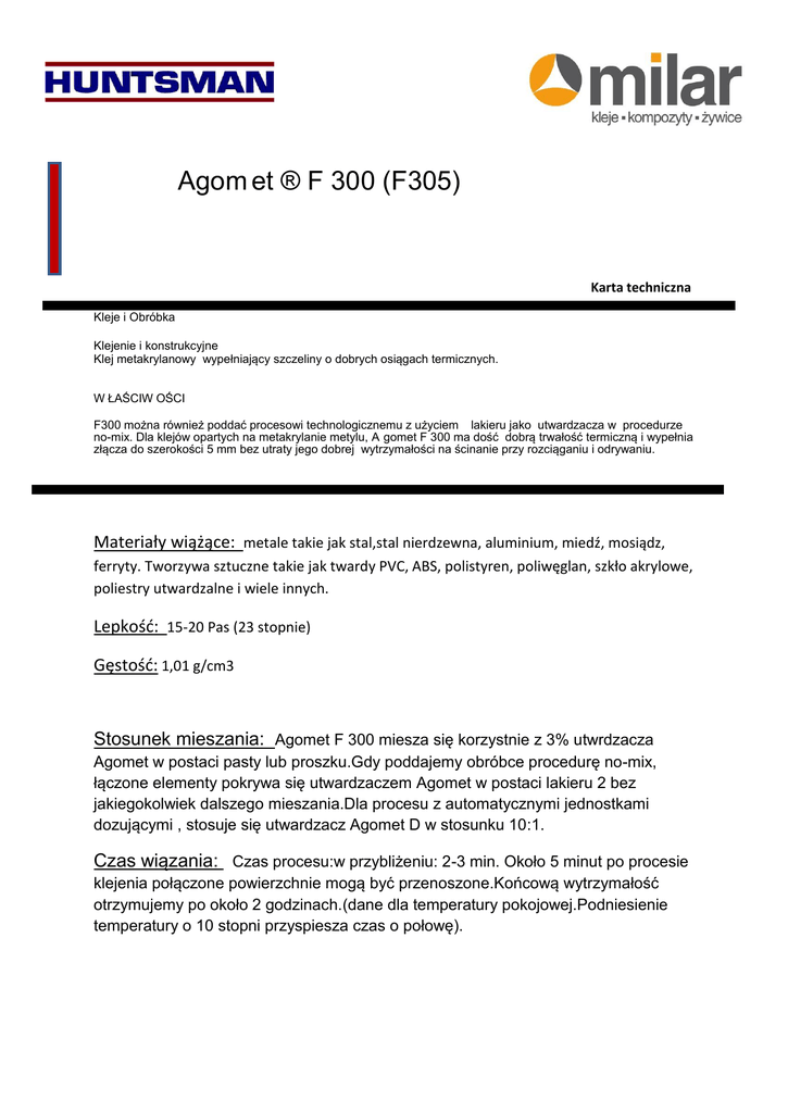 Agom et ® F 300 (F305) Karta techniczna Kleje i Obróbka Klejenie i konstrukcyjne Klej metakrylanowy wypełniający szczeliny o dobrych osiągach termicznych. W ŁAŚCIW OŚCI F300 można również poddać procesowi technologicznemu z użyciem lakieru jako utwardzacza w procedurze no-mix. Dla klejów opartych na metakrylanie metylu, A gomet F 300 ma dość dobrą trwałość termiczną i wypełnia złącza do szerokości 5 mm bez utraty jego dobrej wytrzymałości na ścinanie przy rozciąganiu i odrywaniu. Materiały wiążące: metale takie jak stal,stal nierdzewna, aluminium, miedź, mosiądz, ferryty. Tworzywa sztuczne takie jak twardy PVC, ABS, polistyren, poliwęglan, szkło akrylowe, poliestry utwardzalne i wiele innych. Lepkość: 15-20 Pas (23 stopnie) Gęstość: 1,01 g/cm3 Stosunek mieszania: Agomet F 300 miesza się korzystnie z 3% utwrdzacza Agomet w postaci pasty lub proszku.Gdy poddajemy obróbce procedurę no-mix, łączone elementy pokrywa się utwardzaczem Agomet w postaci lakieru 2 bez jakiegokolwiek dalszego mieszania.Dla procesu z automatycznymi jednostkami dozującymi , stosuje się utwardzacz Agomet D w stosunku 10:1. Czas wiązania: Czas procesu:w przybliżeniu: 2-3 min. Około 5 minut po procesie klejenia połączone powierzchnie mogą być przenoszone.Końcową wytrzymałość otrzymujemy po około 2 godzinach.(dane dla temperatury pokojowej.Podniesienie temperatury o 10 stopni przyspiesza czas o połowę). Przetwarzanie Przygotowanie powierzchni: Z użyciem F 300 , doskonałe wartości wytrzymałości można normalnie otrzymać nawet bez szczególnej obróbki wstępnej łączonych powierzchni.Normalne ślady oleju są kompatybilne z Agomet F300 i mogą pozostać na łączonych powierzchniach.Jak ze wszystkimi wiązaniami, jednakże wytrzymałość wiązania może być optymalizowana przez dodatkową wstępną obróbkę powierzchni: muszą być one wolne od zanieczyszczeń, takich jak pył, tlenki, smar, środki adhezyjne lub plastyfikatory.Proste starcie z użyciem rozpuszczalnika takiego jak octan etylu lub butanon- dla tworzyw sztucznych: alkohol – jest wystraczający. Spoina najbardziej korzystna ilość kleju do nanoszenia wynosi 150-250g/m2(0,150,25mm). Szerokość szczeliny Z użyciem Agomet Utwardzacz w postaci pasty. Proszku lub Agomet Utwardzacz D szerokość szczeliny/spoiny do 5mm są wypełniane i uszczelniane bez żadnych przeszkód.Stosowanie metody no-mix z użyciem Agomet lakieru jako utwardzacza lub lakieru do natrysku :dla szczelin poniżej 0,4mm wystarczające jest naniesienie kleju tylko na jedną powierzchnie. Dla szczelin 0,4 do 0,8mm klej musi być naniesiony na obydwie powierzchnie. Warunki : Agomet F 300 może być przetwarzany w temperaturach w zakresie od 15 do 30 stopni. Wyższe temperatury skracają proces wiązania.Można temu zapobiec zmniejszając ilość utwardzacza wykorzystanego w procesie klejenia. Klejenie: 1. Z użyciem utwardzacza w postaci pasty/proszku Ilość 2-5%, najkorzystniej 3%, utwardzacza w postaci pasty harter paste lub harter pulver miesza się w kleju.Proces klejenia musi być prowadzony bezpośrednio po zmieszaniu utwardzacza w kleju (żywotność w 23 stopniach : około 13 minut).Proces jest nieodpowiedni dla maszyn dozujących. 2.Maszyny dozujące : z użyciem utwardzacza Agomet D Przygotowanie utwardzacza odkryto szczególnie dla przetwarzania sposobem dwuskładnikowego mieszania z użyciem sprzętu dozującego.Wymagana ilość utwardzacza D: 10%.Żywotność w 23 stopniach około 9 minut. 3.Procedury no-mix : z użyciem Harter Lack 2. W zależności od obszaru nanoszenia, Lakier 2 jako utwardzacz Agomet nanosi się (poprzez rozpylenie, malowanie pędzlem, nanoszenie za pomocą wałka, zanurzenie) na jedną lub dwie powierzchnie w miejsce zespojenia, gdzie zastyga po około 4 minutach.Po wyschnięciu części nadaja się do transportu lub przechowywania.Powierzchnie powleczone lakierem jako utwardzaczem mogą być przechowywane w temperaturze pokojowej przez kilka tygodni bez zmniejszenia aktywności utwardzacza.Po wysuszeniu lakieru jako utwardzacza Agomet F 300 nanosi się na jedną z powierzchni zespojenia. Następnie części sklejane są dopasowywane i muszą zostać poddane ściskowi.Polimeryzacja zaczyna się bezpośrednio po zetknięciu kleju z lakierem jako utwardzaczem. Charakterystyka wiązania Wytrzymałość na ścinanie przy rozciąganiu. Z utwardzaczem w postaci pasty, zgodnie z DIN 53283. Wytrzymałość spoiny na odrywanie: arkusz aluminiowy 0,5mm ok.6N/mm. Wytrzymałość temperaturowa: Agomet F 300(305) cechuje się wysokimi wartościami wytrzymałości pomiędzy 40°C a +100°C.Krótkie obciążenie cieplne do 140 stopni może być tolerowane bez znaczącego spadku właściwości wytrzymałościowych. Wytrzymałość chemiczna : Agomet F 300(305) ma bardzo dobra wytrzymałość przeciw rozcieńczonym kwasom mineralnym i dobrą wytrzymałość przeciw alkaliom, benzynie i olejom napędowym. Wiązania wytworzone z F 300 również pokazują dobra wytrzymałość w warunkach działania wilgoci i ciepła (klimat tropikalny), jak równie_ pod wpływem wodnych roztworów. Przechowywanie Dopuszczalny okres magazynowania. Proszę patrzeć na etykietę: 3-6 miesięcy w oryginalnym nie otwartym pojemniku. Po otwarciu należy zużyć składnik A w ciągu 1miesiaca. Składnik utwardzający jest stabilny(nadający się do użytku) po otwarciu 3-6 miesięcy. Środki Ostrożności: PRZEPISY BHP Obowiązkowe i zalecane przepisy higieny przemysłowej powinny być przestrzegane, kiedykolwiek reaktywne zestawy żywiczne są przenoszone i przetwarzane. Dodatkowych informacji nale_y szukac w broszurze: „Hygenic precautions for handling plastics products of Ciba - Geigy” (Publikacja nr 24264/e). HIGIENA PRZEMYSŁOWA Warunki bezpieczeństwa w miejscu pracy: ubranie ochronne ogólne rękawice niezbędne zabezpieczenie ramion zalecane gdy istnieje możliwość kontaktu ze skórą tak - gogle/ okulary ochr