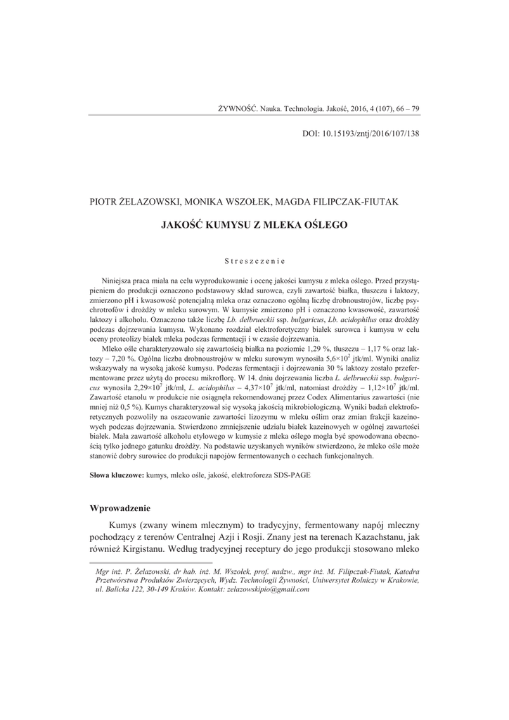 ŻYWNOŚĆ. Nauka. Technologia. Jakość, 2016, 4 (107), 66 – 79 DOI: 10.15193/zntj/2016/107/138 PIOTR ŻELAZOWSKI, MONIKA WSZOŁEK, MAGDA FILIPCZAK-FIUTAK JAKOŚĆ KUMYSU Z MLEKA OŚLEGO Streszczenie Niniejsza praca miała na celu wyprodukowanie i ocenę jakości kumysu z mleka oślego. Przed przystąpieniem do produkcji oznaczono podstawowy skład surowca, czyli zawartość białka, tłuszczu i laktozy, zmierzono pH i kwasowość potencjalną mleka oraz oznaczono ogólną liczbę drobnoustrojów, liczbę psychrotrofów i drożdży w mleku surowym. W kumysie zmierzono pH i oznaczono kwasowość, zawartość laktozy i alkoholu. Oznaczono także liczbę Lb. delbrueckii ssp. bulgaricus, Lb. acidophilus oraz drożdży podczas dojrzewania kumysu. Wykonano rozdział elektroforetyczny białek surowca i kumysu w celu oceny proteolizy białek mleka podczas fermentacji i w czasie dojrzewania. Mleko ośle charakteryzowało się zawartością białka na poziomie 1,29 %, tłuszczu – 1,17 % oraz laktozy – 7,20 %. Ogólna liczba drobnoustrojów w mleku surowym wynosiła 5,6×102 jtk/ml. Wyniki analiz wskazywały na wysoką jakość kumysu. Podczas fermentacji i dojrzewania 30 % laktozy zostało przefermentowane przez użytą do procesu mikroflorę. W 14. dniu dojrzewania liczba L. delbrueckii ssp. bulgaricus wynosiła 2,29×107 jtk/ml, L. acidophilus – 4,37×107 jtk/ml, natomiast drożdży – 1,12×107 jtk/ml. Zawartość etanolu w produkcie nie osiągnęła rekomendowanej przez Codex Alimentarius zawartości (nie mniej niż 0,5 %). Kumys charakteryzował się wysoką jakością mikrobiologiczną. Wyniki badań elektroforetycznych pozwoliły na oszacowanie zawartości lizozymu w mleku oślim oraz zmian frakcji kazeinowych podczas dojrzewania. Stwierdzono zmniejszenie udziału białek kazeinowych w ogólnej zawartości białek. Mała zawartość alkoholu etylowego w kumysie z mleka oślego mogła być spowodowana obecnością tylko jednego gatunku drożdży. Na podstawie uzyskanych wyników stwierdzono, że mleko ośle może stanowić dobry surowiec do produkcji napojów fermentowanych o cechach funkcjonalnych. Słowa kluczowe: kumys, mleko ośle, jakość, elektroforeza SDS-PAGE Wprowadzenie Kumys (zwany winem mlecznym) to tradycyjny, fermentowany napój mleczny pochodzący z terenów Centralnej Azji i Rosji. Znany jest na terenach Kazachstanu, jak również Kirgistanu. Według tradycyjnej receptury do jego produkcji stosowano mleko Mgr inż. P. Żelazowski, dr hab. inż. M. Wszołek, prof. nadzw., mgr inż. M. Filipczak-Fiutak, Katedra Przetwórstwa Produktów Zwierzęcych, Wydz. Technologii Żywności, Uniwersytet Rolniczy w Krakowie, ul. Balicka 122, 30-149 Kraków. Kontakt: [email protected] JAKOŚĆ KUMYSU Z MLEKA OŚLEGO 67 klaczy zaszczepiane kumysem. Ostateczny skład, a także charakterystyczny smak tego napoju kształtował się na skutek działalności bakterii fermentacji mlekowej i drożdży. Spożycie kumysu jest w znacznej mierze ograniczone przez czynniki geograficzne i nie zostało spopularyzowane w Europie. W regionie Azji Środkowej kumysowi przypisuje się właściwości prozdrowotne, poprawiające metabolizm, usprawniające prace systemu nerwowego i nerek. Ze względu na surowiec (mleko klaczy), z którego jest produkowany, kumys o małej zawartości alkoholu stanowi bezpieczny produkt spożywczy dla dzieci obarczonych alergiami pokarmowymi. Istnieje możliwość wykorzystania do produkcji kumysu mleka oślego i wielbłądziego, jak również mleka krowiego o zmodyfikowanym składzie [10]. Kumys to rodzaj mleka fermentowanego, którego walory sensoryczne, skład chemiczny i właściwości są wynikiem działania bakterii fermentacji mlekowej oraz prowadzonej przez drożdże fermentacji alkoholowej [4]. Według Codex Alimentarius [29] mleko fermentowane powinno zawierać nie więcej niż 10 % tłuszczu mlecznego, minimum 0,7 % kwasu mlekowego oraz, tylko w odniesieniu do kumysu, 0,5 % (v/m) etanolu. Standard ten wskazuje również, że w składzie charakterystycznej mikroflory kumysu powinny znajdować się pałeczki Lactobacillus delbrueckii ssp. bulgaricus oraz drożdże Kluyveromyces marxianus. Inni autorzy [26, 31] podają szerszą grupę drobnoustrojów wchodzących w skład tego napoju: − bakterie z rodzaju Lactobacillus (Lb. delbrueckii subsp. bulgaricus, Lb. acidophilus), − drożdże fermentujące laktozę z rodzaju Saccharomyces spp., Kluyveromyces marxianus var. marxianus i Candida koumiss, − drożdże niefermentujące laktozy, m.in. z gatunku Saccharomyces cartilaginosus, − drożdże niefermentujące cukrów z rodzaju Mycoderma spp. W ciągu ostatnich lat wzrosło zainteresowanie poszukiwaniem mleka, które mogłoby stanowić alternatywę dla mleka kobiecego, a jednocześnie charakteryzowałoby się podobnym składem chemicznym i właściwościami. Spośród różnych gatunków mleka duże zainteresowanie wzbudza mleko ośle ze względu na wyjątkowe właściwości immunologiczne oraz skład chemiczny najbardziej zbliżony do mleka kobiecego. Skład mleka oślego znacząco odbiega od mleka krowiego. Mleko to zawiera mniej suchej masy, białka i tłuszczu. Ponadto charakteryzuje się większą zawartością laktozy. Cechy tego mleka wpływają na jego właściwości i zastosowanie [30]. Niniejsza praca miała na celu wyprodukowanie i ocenę jakości kumysu z mleka oślego. 68 Piotr Żelazowski, Monika Wszołek, Magda Filipczak-Fiutak Materiał i metody badań Materiał doświadczalny stanowiło mleko ośle pochodzące od oślic z hodowli z okolic Wrocławia. Do produkcji kumysu przeznaczono mleko pasteryzowane w temp. 72 ºC przez 15 s, które schładzano i zaszczepiano trzema gatunkami drobnoustrojów: drożdżami Kluyveromyces marxianus, kulturą liofilizowaną LaF 4, zgodnie z zaleceniami producenta (10 U na 1000 litrów mleka), pałeczkami mlekowymi Lactobacillus acidophilus z termofilnej szczepionki LA-5, w której liczba komórek odpowiadała 1×101