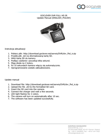 GOCLEVER DVR FULL HD IR Update Manual (ENGLISH_POLISH) Instrukcja aktualizacji 1. 2. 3. 4. 5. 6. 7. Pobierz plik: http://download.goclever.net/serwis/DVR/dvr_fhd_ir.zip Prześlij plik .bin na sformatowaną kartę SD. Włóż kartę SD do kamery. Podłącz zasilanie i poczekaj kilka sekund. Miga dioda na 2 kolory. Po 10 sekundach kamera włączy się automatycznie. Oprogramowanie zostało zaktualizowane. Update manual 1. 2. 3. 4. 5. 6. 7. Download file: http://download.goclever.net/serwis/DVR/dvr_fhd_ir.zip Upload the file .bin to the formatted SD card. Insert the SD card into the camera. Connect the charger and wait a few seconds. LED light flashes for 2 colors. The camera will turn on automatically after 10 sec. The software has been updated successfully. EUROPEAN HEADQUARTER GOCLEVER Sp. z o.o. 4A Sianowska Street, 60-431 Poznan, Poland Tel: +48 61 6460800, Fax: +48 61 6417422 [email protected]
