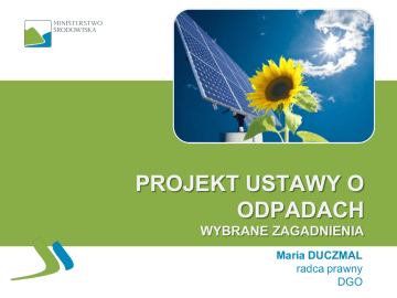 PROJEKT USTAWY O ODPADACH WYBRANE ZAGADNIENIA Maria DUCZMAL radca prawny DGO 1. Nowe pojęcia 2. Nowe decyzje w zakresie gospodarki odpadami 3. Zmiana klasyfikacji odpadu niebezpiecznego na inny niż niebezpieczny 4. Uznanie produktu lub substancji za produkt uboczny 5. Utrata statusu odpadu NOWE POJĘCIA Nowe pojęcia bioodpady odpady zielone ponowne użycie przetwarzanie przygotowanie do ponownego użycia selektywne zbieranie Pojęcia te zostały wprowadzone z dniem 1 stycznia 2012 r. wskutek zmian wprowadzonych w ustawie z dnia 27 kwietnia 2001 r. o odpadach przez art. 4 ustawy z dnia 1 lipca 2011 r. o zmianie ustawy o utrzymaniu czystości i porządku w gminach oraz niektórych innych ustaw (Dz. U. Nr 152, poz. 897) 4 Odpady „bio” odpady zielone - rozumie się przez to odpady komunalne stanowiące części roślin z pielęgnacji terenów zielonych, ogrodów, parków i cmentarzy, a także z targowisk, z wyłączeniem odpadów z czyszczenia ulic i placów bioodpady – rozumie się przez to ulegające biodegradacji odpady z ogrodów i parków, odpady spożywcze i kuchenne z gospodarstw domowych, gastronomii, zakładów zbiorowego żywienia, jednostek handlu detalicznego, a także porównywalne odpady z zakładów produkujących lub wprowadzających do obrotu żywność odpady ulegające biodegradacji – rozumie się przez to odpady, które ulegają rozkładowi tlenowemu lub beztlenowemu przy udziale mikroorganizmów 5 Odpady zielone odpady zielone – obligatoryjne selektywne zbieranie przez właścicieli nieruchomości – zagospodarowanie na obszarze regionu g.o.k. w r.i.p.o.k. 6 Bioodpady bioodpady – zawartość p.g.o.- kierunki działań: „ w tym środki zachęcające do selektywnego zbierania bioodpadów w celu ich kompostowania i uzyskiwania z nich sfermentowanej biomasy, przetwarzania bioodpadów w sposób, który zapewnia wysoki poziom ochrony środowiska, stosowania bezpiecznych dla środowiska materiałów wyprodukowanych z bioodpadów przy zachowaniu wysokiego poziomu ochrony życia i zdrowia ludzi oraz środowiska” – przetwarzanie selektywnie zebranych odpadów zielonych i innych bioodpadów oraz wytwarzanie z nich produktu o właściwościach nawozowych lub środków wspomagających uprawę roślin, spełniającego wymagania określone w przepisach odrębnych 7 Odpady ulegające biodegradacji Plany gospodarki odpadami –dotyczą odpadów wytworzonych na obszarze, dla którego jest sporządzany plan, oraz przywożonych na ten obszar, w tym odpadów komunalnych, odpadów ulegających biodegradacji, odpadów opakowaniowych i odpadów niebezpiecznych – wskazują przyjęte cele w zakresie gospodarki odpadami z podaniem terminów ich osiągania, w tym cele dotyczące zapobiegania powstawaniu odpadów i ograniczania ilości odpadów komunalnych ulegających biodegradacji kierowanych na składowisko odpadów BDO – informacje o podmiotach odbierających odpady komunalne od właścicieli nieruchomości wraz z informacjami o ilości odebranych odpadów komunalnych, z podziałem na odbierane selektywnie i zmieszane, z wyodrębnieniem odpadów komunalnych ulegających biodegradacji Poziomy redukcji odpadów ulegających biodegradacji kierowanych do składowania – u.u.cz.p.g. 8 Przetwarzanie Odzysk” i przeciwne pojęcie „unieszkodliwiania” (negatywnie zdefiniowane jako proces niebędący odzyskiem) tworzą razem „przetwarzanie odpadów”. Wszelkie przetwarzanie odpadów jest tylko albo procesem odzysku, albo procesem unieszkodliwiania. TSUE wyraźnie stwierdził, że żadna operacja nie może zostać zakwalifikowana jednocześnie jako odzysk i unieszkodliwianie 9 Definicje zmieniane: gospodarowanie odpadami; magazynowanie odpadów; odpady; odzysk; oleje odpadowe; PCB; posiadacz odpadów; recykling; stosowanie komunalnych osadów ściekowych; unieszkodliwianie odpadów; zbieranie odpadów. Gospodarowanie odpadami gospodarowanie odpadami oznacza zbieranie, transport, przetwarzanie odpadów, w tym działania wykonywane w charakterze sprzedawcy odpadów i pośrednika w obrocie odpadami, wraz z nadzorem nad takimi działaniami oraz nad miejscami unieszkodliwiania odpadów Odzysk ODZYSK – rozumie się przez to proces, którego głównym wynikiem jest to, że odpady służą użytecznemu zastosowaniu, przez zastąpienie materiałów, które zostałyby zastosowane, lub w wyniku którego odpady są przygotowywane do takiego zastosowania – w danym zakładzie lub ogólnie w gospodarce Projekt wytycznych KE do dyrektywy 2008/98/WE Definicja ta uwzględnia orzecznictwo TSUE, w którym w orzeczeniach w sprawach ASA (C-6/00 ASA (2002)) i Cement kiln (C-228/00 Komisja przeciwko Niemcom (2002)) rozwinięto podejście substytucji jako wstępnego warunku dla odzysku. 12 Odzysk Odpady, które mają służyć pożytecznym celom „jako główny wynik” procesu odzyskania, stanowią istotny aspekt rozróżnienia operacji odzysku od unieszkodliwiania. Kryterium zostało wprowadzone, aby zapobiec nadużyciom i fikcyjnemu odzyskiwaniu, włączając orzecznictwo TSUE, które odnosi do „głównych celów”. Przykład: TSUE stwierdził w odniesieniu do spalania odpadów w piecach cementowych, że „wynika to z ogólnie stosowanego pojęcia (…), że odpady muszą być używane głównie jako paliwa lub inne środki wytwarzania energii, co oznacza, że większa część odpadów musi zostać zużyta w czasie operacji, a większa część energii musi zostać wytworzona i wykorzystana.” (sprawa C228/00). 13 Odzysk Należy zauważyć, że zgodnie z definicją zawartą w art. 3 ust. 15 dyrektywy 2008/98 nie sam proces produkcyjny, w którym odpady zastępują pierwotny surowiec, ale także procesy w górnej części łańcucha zarządzania materiałami, w których odpady są przygotowywane do wypełniania tych funkcji, można uważać za operacje odzysku. Załącznik II do dyrektywy 2008/98 ustanawia niepełny wykaz operacji odzysku. Operacja może być operacją odzysku nawet 