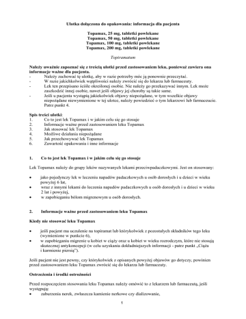 Ulotka dołączona do opakowania: informacja dla pacjenta Topamax, 25 mg, tabletki powlekane Topamax, 50 mg, tabletki powlekane Topamax, 100 mg, tabletki powlekane Topamax, 200 mg, tabletki powlekane Topiramatum Należy uważnie zapoznać się z treścią ulotki przed zastosowaniem leku, ponieważ zawiera ona informacje ważne dla pacjenta. Należy zachować tę ulotkę, aby w razie potrzeby móc ją ponownie przeczytać. W razie jakichkolwiek wątpliwości należy zwrócić się do lekarza lub farmaceuty. Lek ten przepisano ściśle określonej osobie. Nie należy go przekazywać innym. Lek może zaszkodzić innej osobie, nawet jeśli objawy jej choroby są takie same. Jeśli u pacjenta wystąpią jakiekolwiek objawy niepożądane, w tym wszelkie objawy niepożądane niewymienione w tej ulotce, należy powiedzieć o tym lekarzowi lub farmaceucie. Patrz punkt 4. Spis treści ulotki: 1. Co to jest lek Topamax i w jakim celu się go stosuje 2. Informacje ważne przed zastosowaniem leku Topamax 3. Jak stosować lek Topamax 4. Możliwe działania niepożądane 5. Jak przechowywać lek Topamax 6. Zawartość opakowania i inne informacje 1. Co to jest lek Topamax i w jakim celu się go stosuje Lek Topamax należy do grupy leków nazywanych lekami przeciwpadaczkowymi. Jest on stosowany: • jako pojedynczy lek w leczeniu napadów padaczkowych u osób dorosłych i u dzieci w wieku powyżej 6 lat, wraz z innymi lekami do leczenia napadów padaczkowych u osób dorosłych i u dzieci w wieku 2 lat i powyżej, w zapobieganiu bólom migrenowym u osób dorosłych. 2. Informacje ważne przed zastosowaniem leku Topamax • • Kiedy nie stosować leku Topamax • • jeśli pacjent ma uczulenie na topiramat lub którykolwiek z pozostałych składników tego leku (wymienione w punkcie 6), w zapobieganiu migrenie u kobiet w ciąży oraz u kobiet w wieku rozrodczym, które nie stosują skutecznej antykoncepcji (w celu uzyskania dokładniejszych informacji - patrz punkt „Ciąża i karmienie piersią”). Jeśli pacjent nie jest pewny, czy którykolwiek z opisanych powyżej objawów go dotyczy, powinien przed zastosowaniem leku Topamax zwrócić się do lekarza lub farmaceuty. Ostrzeżenia i środki ostrożności Przed rozpoczęciem stosowania leku Topamax należy omówić to z lekarzem lub farmaceutą, jeśli występują: • zaburzenia nerek, zwłaszcza kamienie nerkowe czy dializowanie, 1 • • • • • • nieprawidłowości we krwi i płynach ustrojowych (kwasica metaboliczna), zaburzenia wątroby, zaburzenia wzroku, zwłaszcza jaskra, zaburzenia wzrostu jeśli stosowana jest dieta wysokotłuszczowa (dieta ketogenna) jeśli pacjentka jest w ciąży lub podejrzewa, że może być w ciąży (dodatkowe informacje patrz punkt „Ciąża i karmienie piersią”). Jeśli pacjent nie jest pewny, czy którykolwiek z opisanych powyżej objawów go dotyczy, powinien przed rozpoczęciem stosowania leku Topamax zwrócić się do lekarza lub farmaceuty. Ważne jest, aby pacjent nie zaprzestał przyjmowania leku bez uprzedniej konsultacji z lekarzem prowadzącym. Pacjent powinien skonsultować się z lekarzem prowadzącym przed przyjęciem jakiegokolwiek leku zawierającego topiramat, wydanego mu jako zamiennik leku Topamax. W trakcie stosowania leku Topamax pacjent może stracić na wadze, dlatego w trakcie leczenia tym lekiem należy regularnie kontrolować masę ciała. Jeśli pacjent traci zbyt dużo na wadze lub gdy dziecko przyjmujące ten lek nie przybiera wystarczająco na wadze, należy skonsultować się z lekarzem prowadzącym. U niewielkiej liczby osób, u których stosowano leki przeciwpadaczkowe, takie jak lek Topamax, występowały myśli o zrobieniu sobie krzywdy lub popełnieniu samobójstwa. Jeśli kiedykolwiek wystąpią takie myśli, należy bezzwłocznie skontaktować się z lekarzem. Lek Topamax a inne leki Należy powiedzieć lekarzowi lub farmaceucie o wszystkich lekach stosowanych przez pacjenta obecnie lub ostatnio, a także o lekach, które pacjent planuje stosować. Lek Topamax może wchodzić w interakcje z innymi lekami. W związku z tym niekiedy należy dostosować dawkę przyjmowanych przez pacjenta leków lub odpowiednio zmienić dawkę leku Topamax. W szczególności należy poinformować lekarza lub farmaceutę w razie stosowania: • • innych leków, które mają szkodliwy wpływ lub obniżają proces myślenia, koncentrację lub koordynację mięśniową (na przykład: leki hamujące ośrodkowy układ nerwowy, takie jak leki rozkurczające mięśnie i leki uspokajające), środków antykoncepcyjnych. Lek Topamax może zmniejszyć skuteczność działania środków antykoncepcyjnych. Należy powiadomić lekarza, jeśli podczas stosowania środków antykoncepcyjnych razem z lekiem Topamax nastąpiła zmiana w przebiegu krwawień miesięcznych. Należy zachować listę wszystkich przyjmowanych leków. Podczas rozpoczynania terapii nowym lekiem należy tę listę pokazać lekarzowi i farmaceucie. Stosowanie innych leków, takich jak leki przeciwpadaczkowe, rysperydon, lit, hydrochlorotiazyd, metformina, pioglitazon, gliburyd, amitryptylina, propranolol, diltiazem, wenlafaksyna, flunarazyna, ziele dziurawca (Hypericum perforatum) (stosowane w leczeniu depresji) należy przedyskutować z lekarzem lub farmaceutą. Jeśli pacjent nie jest pewny, czy powyższy tekst go dotyczy, powinien przed zastosowaniem leku Topamax zwrócić się do lekarza lub farmaceuty. 2 Stosowanie leku Topamax z jedzeniem, piciem i alkoholem Można przyjmować lek Topamax z pokarmem lub bez. Należy pić dużo płynów w czasie dnia, aby zapobiec tworzeniu się kamieni nerkowych podczas stosowania leku Topamax. W trakcie stosowania leku Topamax należy unikać spożywania alkoholu. Ciąża, karmienie piersią i wpływ na płodność W ciąży i w okresie karmienia piersią lub gdy istnieje podejrzenie, że kobieta jest w ciąży, lub gdy planuje ciążę, przed zastosowaniem tego leku należy poradzić si