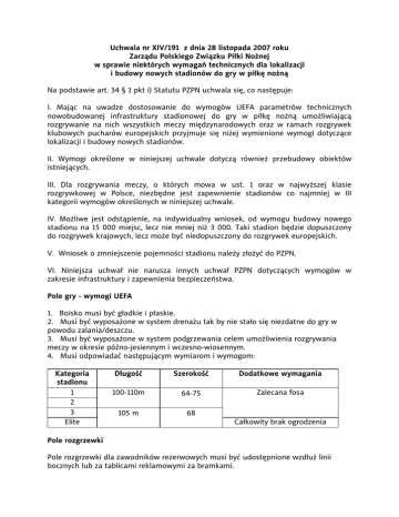 Uchwala nr XIV/191 z dnia 28 listopada 2007 roku Zarządu Polskiego Związku Piłki Nożnej w sprawie niektórych wymagań technicznych dla lokalizacji i budowy nowych stadionów do gry w piłkę nożną Na podstawie art. 34 § 1 pkt i) Statutu PZPN uchwala się, co następuje: I. Mając na uwadze dostosowanie do wymogów UEFA parametrów technicznych nowobudowanej infrastruktury stadionowej do gry w piłkę nożną umożliwiającą rozgrywanie na nich wszystkich meczy międzynarodowych oraz w ramach rozgrywek klubowych pucharów europejskich przyjmuje się niżej wymienione wymogi dotyczące lokalizacji i budowy nowych stadionów. II. Wymogi określone w niniejszej uchwale dotyczą również przebudowy obiektów istniejących. III. Dla rozgrywania meczy, o których mowa w ust. 1 oraz w najwyższej klasie rozgrywkowej w Polsce, niezbędne jest zapewnienie stadionów co najmniej w III kategorii wymogów określonych w niniejszej uchwale. IV. Możliwe jest odstąpienie, na indywidualny wniosek, od wymogu budowy nowego stadionu na 15 000 miejsc, lecz nie mniej niż 3 000. Taki stadion będzie dopuszczony do rozgrywek krajowych, lecz może być niedopuszczony do rozgrywek europejskich. V. Wniosek o zmniejszenie pojemności stadionu należy złożyć do PZPN. VI. Niniejsza uchwał nie narusza innych uchwał PZPN dotyczących wymogów w zakresie infrastruktury i zapewnienia bezpieczeństwa. Pole gry - wymogi UEFA 1. Boisko musi być gładkie i płaskie. 2. Musi być wyposażone w system drenażu tak by nie stało się niezdatne do gry w powodu zalania/deszczu. 3. Musi być wyposażone w system podgrzewania celem umożliwienia rozgrywania meczy w okresie późno-jesiennym i wczesno-wiosennym. 4. Musi odpowiadać następującym wymiarom i wymogom: Kategoria stadionu 1 2 3 Elite Długość Szerokość Dodatkowe wymagania 100-110m 64-75 Zalecana fosa 105 m 68 Całkowity brak ogrodzenia Pole rozgrzewki Pole rozgrzewki dla zawodników rezerwowych musi być udostępnione wzdłuż linii bocznych lub za tablicami reklamowymi za bramkami. Bramki i bramki rezerwowe 1. Słupki oraz poprzeczka muszą być wykonane z aluminium lub podobnego materiału i musza mieć kształt okrągły lub eliptyczny. Ponadto, muszą być zgodne z przepisami gry ogłoszonymi przez (IFAB), co oznacza w szczególności, że: a) Odległość między słupkami musi wynosić 7.32m; b) Odległość od dolnej krawędzi poprzeczki do ziemi musi wynosić 2,44m; c) Słupki bramek i poprzeczka musza być koloru białego; d) Nie mogą stwarzać żadnego zagrożenia dla zawodników. 2. Bramka zapasowa, którą będzie można łatwo zainstalować w razie zaistnienia takiej konieczności, musi być dostępna na terenie stadionu. Nawierzchnia 1. Stadion musi być wyposażony w nawierzchnię naturalną lub nawierzchnię sztuczną. 2. Nawierzchnia sztuczna musi spełnić wszystkie poniższe warunki: a) Musi posiadać wymagana licencję FIFA, która może być udzielona wyłącznie w razie przetestowania nawierzchni przez laboratorium akredytowane przez FIFA i stwierdzenia, że spełnia ona normy jakości FIFA dotyczące nawierzchni sztucznych; b) Musi spełniać wszystkie wymagania zawarte w obowiązujących przepisach krajowych; c) Jej powierzchnia musi być zielona. 3. Dopuszczenie sztucznej nawierzchni wymaga odrębnej zgody PZPN. Ławki rezerwowych Stadion musi być wyposażony w dwie zakryte ławki rezerwowych na poziomie boiska, z których każda będzie mogła pomieścić minimum 13 osób, ustawione w odległości co najmniej pięć metrów od linii bocznej w sposób nie zasłaniający widoczności. Flagi, maszty flagowe Stadion musi być wyposażony w co najmniej pięć masztów flagowych lub innych elementów, na których będzie można zawiesić flagi na stadionie. Szatnie Stadion musi być wyposażony w: 1. Szatnie dla każdego zespołu o zalecanej ogólnej powierzchni co najmniej 100 m2 z nie mniej niż 5 prysznicami, trzema oddzielnymi toaletami z sedesami, pomieszczeniem, w którym może usiąść 25 osób, jednym stołem do masażu i jedną tablicą do rozwiązań taktycznych; 2. Szatnia sędziów z minimum jednym prysznicem, jedna toaleta z sedesem, pięcioma siedzeniami i stołem. Stadion musi gwarantować bezpośrednie, prywatne i zabezpieczone wyjście z szatni na boisko dla obu zespołów i sędziów, a także musi gwarantować bezpieczny dojazd do stadionu i bezpieczne jego opuszczenie. Pokój delegata Stadion musi być wyposażony w pomieszczenie dla delegatów, które zapewniać będzie dostęp do środków komunikacji, takich jak telefon i telefaks, znajdujących się w pobliżu, a także zapewniać łatwy dostęp do szatni zawodników i sędziów oraz internet. Pierwsza pomoc i opieka medyczna dla zawodników i oficjeli Stadion musi być wyposażony w specjalne pomieszczenie, służące do udzielenia pierwszej pomocy i opieki medycznej zawodnikom i oficjelom. Pokój kontroli antydopingowej 1. Stadion musi być wyposażony w specjalny pokój antydopingowy, który będzie spełniać kryteria wyszczególnione w Załączniku I do niniejszych przepisów. 2. Pokój kontroli antydopingowej musi znajdować się blisko szatni dla zawodników i musi być niedostępny dla publiczności i mediów. 3. Powierzchnia pokoju winna wynosić minimum 20 m2 i składać się z poczekalni, pomieszczenia kontroli i toalety, a wszystkie te pomieszczenia powinny do siebie przylegać. 4. Poczekalnia powinna stanowić część pomieszczenia kontroli lub bezpośrednio do niego przylegać (możliwe jest również postawienie ścianki działowej lub innego przepierzenia pomiędzy tymi dwoma obszarami). Poczekalnia winna zapewnić miejsce do siedzenia dla ośmiu osób. Powinna także zapewniać możliwość powieszenia ubrań lub schowania ich do szafek. Powinna być również wyposażona w lodówkę. 5. Pomieszczenie kontroli powinno być wyposażone w: jeden stół, cztery krzesła, umywalkę z bieżącą wodą, zamykaną szafkę i toaletę (przyle