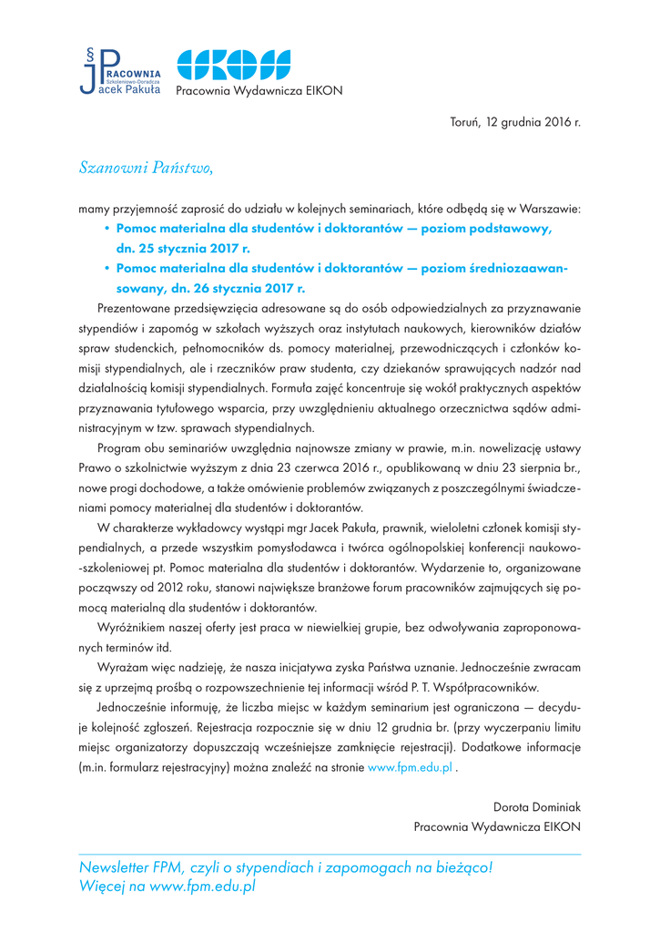 § J racownia Szkoleniowo-Doradcza acek Pakuła Pracownia Wydawnicza EIKON Toruń, 12 grudnia 2016 r. Szanowni Państwo, mamy przyjemność zaprosić do udziału w kolejnych seminariach, które odbędą się w Warszawie: •Pomoc materialna dla studentów i doktorantów — poziom podstawowy, dn. 25 stycznia 2017 r. •Pomoc materialna dla studentów i doktorantów — poziom średniozaawansowany, dn. 26 stycznia 2017 r. Prezentowane przedsięwzięcia adresowane są do osób odpowiedzialnych za przyznawanie stypendiów i zapomóg w szkołach wyższych oraz instytutach naukowych, kierowników działów spraw studenckich, pełnomocników ds. pomocy materialnej, przewodniczących i członków komisji stypendialnych, ale i rzeczników praw studenta, czy dziekanów sprawujących nadzór nad działalnością komisji stypendialnych. Formuła zajęć koncentruje się wokół praktycznych aspektów przyznawania tytułowego wsparcia, przy uwzględnieniu aktualnego orzecznictwa sądów administracyjnym w tzw. sprawach stypendialnych. Program obu seminariów uwzględnia najnowsze zmiany w prawie, m.in. nowelizację ustawy Prawo o szkolnictwie wyższym z dnia 23 czerwca 2016 r., opublikowaną w dniu 23 sierpnia br., nowe progi dochodowe, a także omówienie problemów związanych z poszczególnymi świadczeniami pomocy materialnej dla studentów i doktorantów. W charakterze wykładowcy wystąpi mgr Jacek Pakuła, prawnik, wieloletni członek komisji stypendialnych, a przede wszystkim pomysłodawca i twórca ogólnopolskiej konferencji naukowo-szkoleniowej pt. Pomoc materialna dla studentów i doktorantów. Wydarzenie to, organizowane począwszy od 2012 roku, stanowi największe branżowe forum pracowników zajmujących się pomocą materialną dla studentów i doktorantów. Wyróżnikiem naszej oferty jest praca w niewielkiej grupie, bez odwoływania zaproponowanych terminów itd. Wyrażam więc nadzieję, że nasza inicjatywa zyska Państwa uznanie. Jednocześnie zwracam się z uprzejmą prośbą o rozpowszechnienie tej informacji wśród P. T. Współpracowników. Jednocześnie informuję, że liczba miejsc w każdym seminarium jest ograniczona — decyduje kolejność zgłoszeń. Rejestracja rozpocznie się w dniu 12 grudnia br. (przy wyczerpaniu limitu miejsc organizatorzy dopuszczają wcześniejsze zamknięcie rejestracji). Dodatkowe informacje (m.in. formularz rejestracyjny) można znaleźć na stronie www.fpm.edu.pl . Dorota Dominiak Pracownia Wydawnicza EIKON Newsletter FPM, czyli o stypendiach i zapomogach na bieżąco! Więcej na www.fpm.edu.pl Seminarium Pomoc materialna dla studentów i doktorantów – poziom podstawowy Data: 25 stycznia 2017 r., godz. 9.30-15.30 Miejsce: As-Bud Centrum Konferencyjne, Aleje Jerozolimskie 81, Warszawa Adresatami seminarium są osoby zajmujące się przyznawaniem pomocy materialnej dla studentów i doktorantów: pracownicy szkół wyższych i instytutów naukowych PAN, czy członkowie komisji stypendialnych. Chodzi tu o osoby, które dopiero rozpoczynają pracę związaną z przyznawaniem stypendiów i zapomóg, jak również te, których staż pracy jest niewielki, czy też np. po urlopie wracają do pracy i w zakresie ich zadań będzie przyznawanie tytułowej pomocy. Celem seminarium jest wprowadzenie do pomocy materialnej, zaprezentowanie najnowszych zmian oraz uporządkowanie posiadanej wiedzy. Prezentowane treści wsparte są przykładami z praktyki oraz orzecznictwem sądów administracyjnych. Program seminarium I. Zagadnienia wprowadzające •postawy prawne, w tym regulaminy i zarządzenia •status studenta i doktoranta a prawo do pomocy materialnej •organy przyznające pomocy materialną II. Przesłanki przyznawania świadczeń pomocy materialnej: •stypendium socjalne, ewentualnie zwiększone o tzw. dopłatę mieszkaniową •stypendium specjalne dla osób niepełnosprawnych •zapomoga III. Zasady obliczania dochodu w rodzinie studenta •pojęcie rodziny •dochód i sposób jego dokumentowania •dochód utracony i dochód uzyskany •samodzielność finansowa •gospodarstwo rolne a dzierżawa •alimenty otrzymywane i wypłacane •nietypowe dochody i inne trudności IV. Postępowanie administracyjne w przedmiocie przyznania pomocy materialnej: •odpowiednie stosowanie Kodeksu postępowania administracyjnego •wszczęcie i przebieg postępowania •elementy decyzji Newsletter FPM, czyli o stypendiach i zapomogach na bieżąco! Więcej na www.fpm.edu.pl Wykładowca JACEK PAKUŁA — prawnik, absolwent Wydziału Prawa i Administracji UMK w Toruniu, pomysłodawca ogólnopolskiej konferencji szkoleniowej pt. Pomoc materialna dla studentów i doktorantów. Autor opinii prawnych, artykułów prasowych („Dziennik Gazeta Prawna”, „Rzeczpospolita”, „Forum Akademickie”) i publikacji naukowo-szkoleniowych z zakresu pomocy materialnej, m.in. Pomoc materialna dla studentów. Podręczny komentarz. Przegląd orzecznictwa. Wzory pism (Toruń 2014); redaktor naukowy i współautor publikacji pt. Prawo o szkolnictwie wyższym. Nowe prawo — aktualne problemy (Toruń 2012), Współczesne problemy nauki i szkolnictwa wyższego (Toruń 2013), Współczesne problemy nauki i szkolnictwa wyższego. Continuum (Toruń 2015). Udział w seminarium wiąże się z opłatnością w kwocie: »» rejestracja do dnia 30 grudnia br. — 390 zł; »» rejestracja po 30 grudnia br. — 520 zł; Dla uczestników V Ogólnopolskiej Konferencji pt. Pomoc materialna dla studentów i doktorantów (Toruń, 6-8 czerwca 2016 r.) przewidziano opłatę w kwocie 250 zł; rejestracja po 30 grudnia br. — 300 zł. Uwaga, dodatkowa promocja dla osób otrzymujących Newsletter FPM (bezpłatna subskrypcja: http://fpm.edu.pl/pl/newsletter-fpm) : »» rejestracja do 30 grudnia br. — 320 zł; »» rejestracja po 30 grudnia br. — 450 zł. Do ww. opłaty należy doliczyć VAT (23%); uczelnie publiczne i instytuty naukowe PAN = VAT zw. Cena obejmuje: »» udział w seminariu