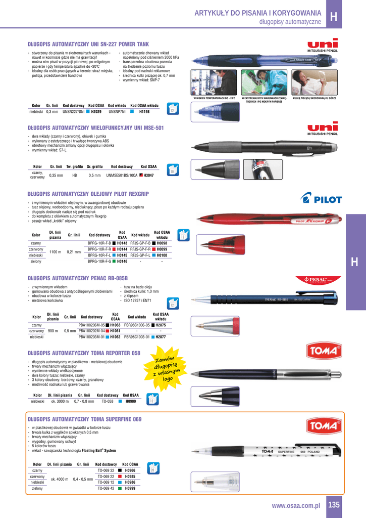 ARTYKUŁY DO PISANIA I KORYGOWANIA długopisy automatyczne H DŁUGOPIS AUTOMATYCZNY UNI SN-227 POWER TANK - stworzony do pisania w ekstremalnych warunkach nawet w kosmosie gdzie nie ma grawitacji! - można nim pisać w pozycji pionowej, po wilgotnym papierze i gdy temperatura spadnie do -20oC - idealny dla osób pracujących w terenie: straż miejska, policja, przedstawiciele handlowi - automatycznie chowany wkład napełniony pod ciśnieniem 3000 hPa - transparentna obudowa pozwala na śledzenie poziomu tuszu - idealny pod nadruki reklamowe - średnica kulki piszącej ok. 0,7 mm - wymienny wkład: SNP-7 W NISKICH TEMPERATURACH DO - 20oC Kolor Gr. linii Kod dostawcy niebieski 0,3 mm UNSN227/DNI Kod OSAA Kod wkładu H2029 W EKSTREMALNYCH WARUNKACH ZEWNĘTRZNYCH I PO MOKRYM PAPIERZE KULKĄ PISZĄCĄ SKIEROWANĄ KU GÓRZE Kod OSAA wkładu 12 H1198 UNSNP7NI DŁUGOPIS AUTOMATYCZNY WIELOFUNKCYJNY UNI MSE-501 - dwa wkłady (czarny i czerwony), ołówek i gumka wykonany z estetycznego i trwałego tworzywa ABS obrotowy mechanizm zmiany opcji długopisu i ołówka wymienny wkład: S7-L Kolor Gr. linii czarny, czerwony 0,35 mm Tw. grafitu Gr. grafitu HB 0,5 mm Kod dostawcy Kod OSAA UNMSE501BS/10CA H3047 10 DŁUGOPIS AUTOMATYCZNY OLEJOWY PILOT REXGRIP - z wymiennym wkładem olejowym, w awangardowej obudowie tusz olejowy, wodoodporny, nieblaknący, pisze po każdym rodzaju papieru długopis doskonale nadaje się pod nadruk do kompletu z ołówkiem automatycznym Rexgrip pasuje wkład „krótki” olejowy Kolor Dł. linii pisania Gr. linii czarny czerwony niebieski 1100 m 0,21 mm zielony Kod dostawcy Kod OSAA Kod OSAA wkładu BPRG-10R-F-B H0143 RFJS-GP-F-B Kod wkładu 12 H0098 BPRG-10R-F-R H0144 RFJS-GP-F-R H0099 BPRG-10R-F-L H0145 RFJS-GP-F-L H0100 BPRG-10R-F-G H0146 H - - DŁUGOPIS AUTOMATYCZNY PENAC RB-085B - z wymiennym wkładem gumowana obudowa z antypoślizgowymi żłobieniami obudowa w kolorze tuszu metalowa końcówka - tusz na bazie oleju średnica kulki: 1,0 mm z klipsem ISO 12757 i EN71 12 Kolor Dł. linii pisania Gr. linii czarny czerwony Kod dostawcy PBA100206M-05 900 m 0,5 mm PBA100202M-04 niebieski PBA100203M-01 Kod OSAA Kod wkładu Kod OSAA wkładu H1063 PBR98C1006-05 H1061 H2875 - - H1062 PBR98C1003-01 H2877 DŁUGOPIS AUTOMATYCZNY TOMA REPORTER 058 - Zamów isy długop ym z własn logo długopis automatyczny w plastikowo - metalowej obudowie trwały mechanizm włączający wymienne wkłady wielkopojemne dwa kolory tuszu: niebieski, czarny 3 kolory obudowy: bordowy, czarny, granatowy możliwość nadruku lub grawerowania Kolor Dł. linii pisania Gr. linii Kod dostawcy Kod OSAA niebieski ok. 3000 m 0,7 - 0,8 mm TO-058 H0909 12 DŁUGOPIS AUTOMATYCZNY TOMA SUPERFINE 069 - w plastikowej obudowie w gwiazdki w kolorze tuszu trwała kulka z węglików spiekanych 0,5 mm trwały mechanizm włączający wygodny, gumowany uchwyt 5 kolorów tuszu wkład - szwajcarska technologia Floating Ball® System Kolor Dł. linii pisania Gr. linii Kod dostawcy Kod OSAA czarny TO-069 32 H0966 czerwony TO-069 22 H0985 TO-069 12 H0986 TO-069 42 H0999 niebieski zielony ok. 4000 m 0,4 - 0,5 mm 20 www.osaa.com.pl 135