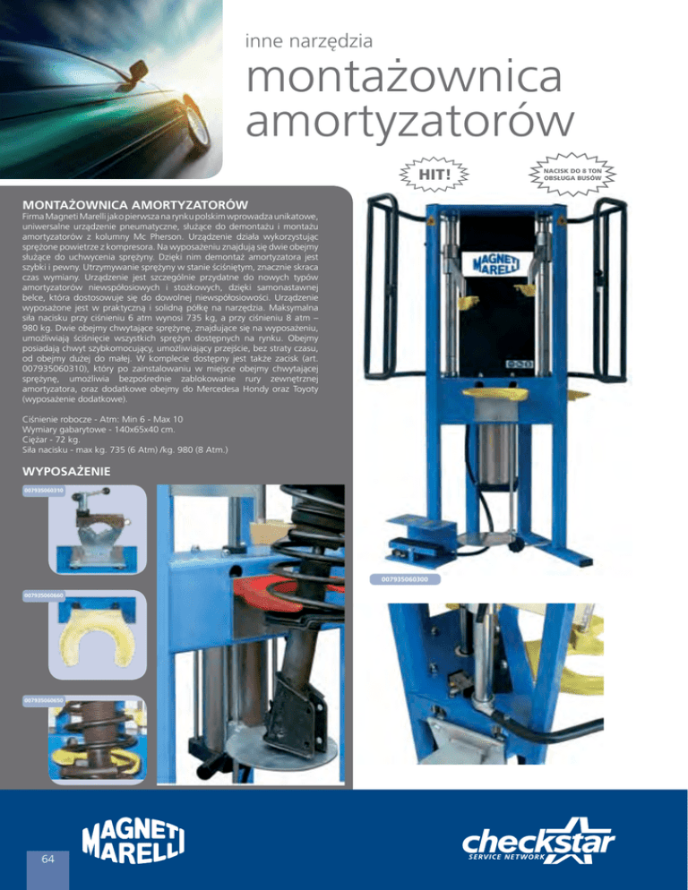 inne narzędzia montażownica amortyzatorów HIT! MONTAŻOWNICA AMORTYZATORÓW Firma Magneti Marelli jako pierwsza na rynku polskim wprowadza unikatowe, uniwersalne urządzenie pneumatyczne, służące do demontażu i montażu amortyzatorów z kolumny Mc Pherson. Urządzenie działa wykorzystując sprężone powietrze z kompresora. Na wyposażeniu znajdują się dwie obejmy służące do uchwycenia sprężyny. Dzięki nim demontaż amortyzatora jest szybki i pewny. Utrzymywanie sprężyny w stanie ściśniętym, znacznie skraca czas wymiany. Urządzenie jest szczególnie przydatne do nowych typów amortyzatorów niewspółosiowych i stożkowych, dzięki samonastawnej belce, która dostosowuje się do dowolnej niewspółosiowości. Urządzenie wyposażone jest w praktyczną i solidną półkę na narzędzia. Maksymalna siła nacisku przy ciśnieniu 6 atm wynosi 735 kg, a przy ciśnieniu 8 atm – 980 kg. Dwie obejmy chwytające sprężynę, znajdujące się na wyposażeniu, umożliwiają ściśnięcie wszystkich sprężyn dostępnych na rynku. Obejmy posiadają chwyt szybkomocujący, umożliwiający przejście, bez straty czasu, od obejmy dużej do małej. W komplecie dostępny jest także zacisk (art. 007935060310), który po zainstalowaniu w miejsce obejmy chwytającej sprężynę, umożliwia bezpośrednie zablokowanie rury zewnętrznej amortyzatora, oraz dodatkowe obejmy do Mercedesa Hondy oraz Toyoty (wyposażenie dodatkowe). Ciśnienie robocze - Atm: Min 6 - Max 10 Wymiary gabarytowe - 140x65x40 cm. Ciężar - 72 kg. Siła nacisku - max kg. 735 (6 Atm) /kg. 980 (8 Atm.) WYPOSAŻENIE 007935060310 007935060300 007935060660 007935060650 64 NACISK DO 8 TON OBSŁUGA BUSÓW