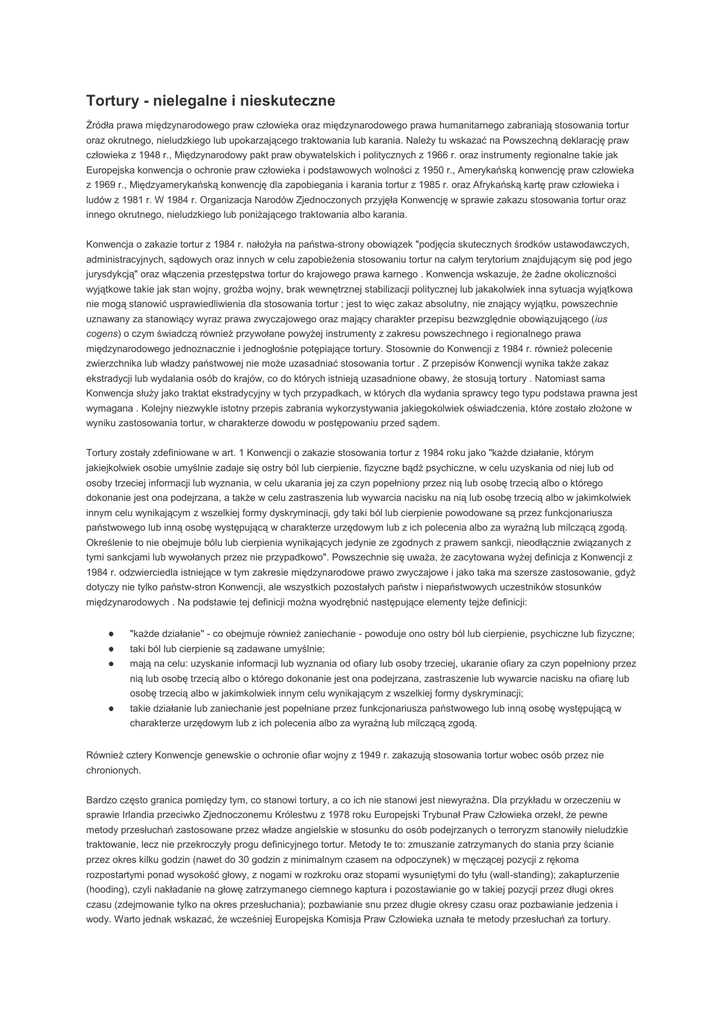 Tortury - nielegalne i nieskuteczne Źródła prawa międzynarodowego praw człowieka oraz międzynarodowego prawa humanitarnego zabraniają stosowania tortur oraz okrutnego, nieludzkiego lub upokarzającego traktowania lub karania. Należy tu wskazać na Powszechną deklarację praw człowieka z 1948 r., Międzynarodowy pakt praw obywatelskich i politycznych z 1966 r. oraz instrumenty regionalne takie jak Europejska konwencja o ochronie praw człowieka i podstawowych wolności z 1950 r., Amerykańską konwencję praw człowieka z 1969 r., Międzyamerykańską konwencję dla zapobiegania i karania tortur z 1985 r. oraz Afrykańską kartę praw człowieka i ludów z 1981 r. W 1984 r. Organizacja Narodów Zjednoczonych przyjęła Konwencję w sprawie zakazu stosowania tortur oraz innego okrutnego, nieludzkiego lub poniżającego traktowania albo karania. Konwencja o zakazie tortur z 1984 r. nałożyła na państwa-strony obowiązek "podjęcia skutecznych środków ustawodawczych, administracyjnych, sądowych oraz innych w celu zapobieżenia stosowaniu tortur na całym terytorium znajdującym się pod jego jurysdykcją" oraz włączenia przestępstwa tortur do krajowego prawa karnego . Konwencja wskazuje, że żadne okoliczności wyjątkowe takie jak stan wojny, groźba wojny, brak wewnętrznej stabilizacji politycznej lub jakakolwiek inna sytuacja wyjątkowa nie mogą stanowić usprawiedliwienia dla stosowania tortur ; jest to więc zakaz absolutny, nie znający wyjątku, powszechnie uznawany za stanowiący wyraz prawa zwyczajowego oraz mający charakter przepisu bezwzględnie obowiązującego (ius cogens) o czym świadczą również przywołane powyżej instrumenty z zakresu powszechnego i regionalnego prawa międzynarodowego jednoznacznie i jednogłośnie potępiające tortury. Stosownie do Konwencji z 1984 r. również polecenie zwierzchnika lub władzy państwowej nie może uzasadniać stosowania tortur . Z przepisów Konwencji wynika także zakaz ekstradycji lub wydalania osób do krajów, co do których istnieją uzasadnione obawy, że stosują tortury . Natomiast sama Konwencja służy jako traktat ekstradycyjny w tych przypadkach, w których dla wydania sprawcy tego typu podstawa prawna jest wymagana . Kolejny niezwykle istotny przepis zabrania wykorzystywania jakiegokolwiek oświadczenia, które zostało złożone w wyniku zastosowania tortur, w charakterze dowodu w postępowaniu przed sądem. Tortury zostały zdefiniowane w art. 1 Konwencji o zakazie stosowania tortur z 1984 roku jako "każde działanie, którym jakiejkolwiek osobie umyślnie zadaje się ostry ból lub cierpienie, fizyczne bądź psychiczne, w celu uzyskania od niej lub od osoby trzeciej informacji lub wyznania, w celu ukarania jej za czyn popełniony przez nią lub osobę trzecią albo o którego dokonanie jest ona podejrzana, a także w celu zastraszenia lub wywarcia nacisku na nią lub osobę trzecią albo w jakimkolwiek innym celu wynikającym z wszelkiej formy dyskryminacji, gdy taki ból lub cierpienie powodowane są przez funkcjonariusza państwowego lub inną osobę występującą w charakterze urzędowym lub z ich polecenia albo za wyraźną lub milczącą zgodą. Określenie to nie obejmuje bólu lub cierpienia wynikających jedynie ze zgodnych z prawem sankcji, nieodłącznie związanych z tymi sankcjami lub wywołanych przez nie przypadkowo". Powszechnie się uważa, że zacytowana wyżej definicja z Konwencji z 1984 r. odzwierciedla istniejące w tym zakresie międzynarodowe prawo zwyczajowe i jako taka ma szersze zastosowanie, gdyż dotyczy nie tylko państw-stron Konwencji, ale wszystkich pozostałych państw i niepaństwowych uczestników stosunków międzynarodowych . Na podstawie tej definicji można wyodrębnić następujące elementy tejże definicji: "każde działanie" - co obejmuje również zaniechanie - powoduje ono ostry ból lub cierpienie, psychiczne lub fizyczne; taki ból lub cierpienie są zadawane umyślnie; mają na celu: uzyskanie informacji lub wyznania od ofiary lub osoby trzeciej, ukaranie ofiary za czyn popełniony przez nią lub osobę trzecią albo o którego dokonanie jest ona podejrzana, zastraszenie lub wywarcie nacisku na ofiarę lub osobę trzecią albo w jakimkolwiek innym celu wynikającym z wszelkiej formy dyskryminacji; takie działanie lub zaniechanie jest popełniane przez funkcjonariusza państwowego lub inną osobę występującą w charakterze urzędowym lub z ich polecenia albo za wyraźną lub milczącą zgodą. Również cztery Konwencje genewskie o ochronie ofiar wojny z 1949 r. zakazują stosowania tortur wobec osób przez nie chronionych. Bardzo często granica pomiędzy tym, co stanowi tortury, a co ich nie stanowi jest niewyraźna. Dla przykładu w orzeczeniu w sprawie Irlandia przeciwko Zjednoczonemu Królestwu z 1978 roku Europejski Trybunał Praw Człowieka orzekł, że pewne metody przesłuchań zastosowane przez władze angielskie w stosunku do osób podejrzanych o terroryzm stanowiły nieludzkie traktowanie, lecz nie przekroczyły progu definicyjnego tortur. Metody te to: zmuszanie zatrzymanych do stania przy ścianie przez okres kilku godzin (nawet do 30 godzin z minimalnym czasem na odpoczynek) w męczącej pozycji z rękoma rozpostartymi ponad wysokość głowy, z nogami w rozkroku oraz stopami wysuniętymi do tyłu (wall-standing); zakapturzenie (hooding), czyli nakładanie na głowę zatrzymanego ciemnego kaptura i pozostawianie go w takiej pozycji przez długi okres czasu (zdejmowanie tylko na okres przesłuchania); pozbawianie snu przez długie okresy czasu oraz pozbawianie jedzenia i wody. Warto jednak wskazać, że wcześniej Europejska Komisja Praw Człowieka uznała te metody przesłuchań za tortury. Ponadto w swojej późniejszej decyzji Trybunał podkreślił, że "pewne czyny, które w przeszłości były uznawane za "nieludzkie i upokarzające traktowanie" [...] mogą być inaczej klasyfikowane w przyszłości... przy coraz wyższ