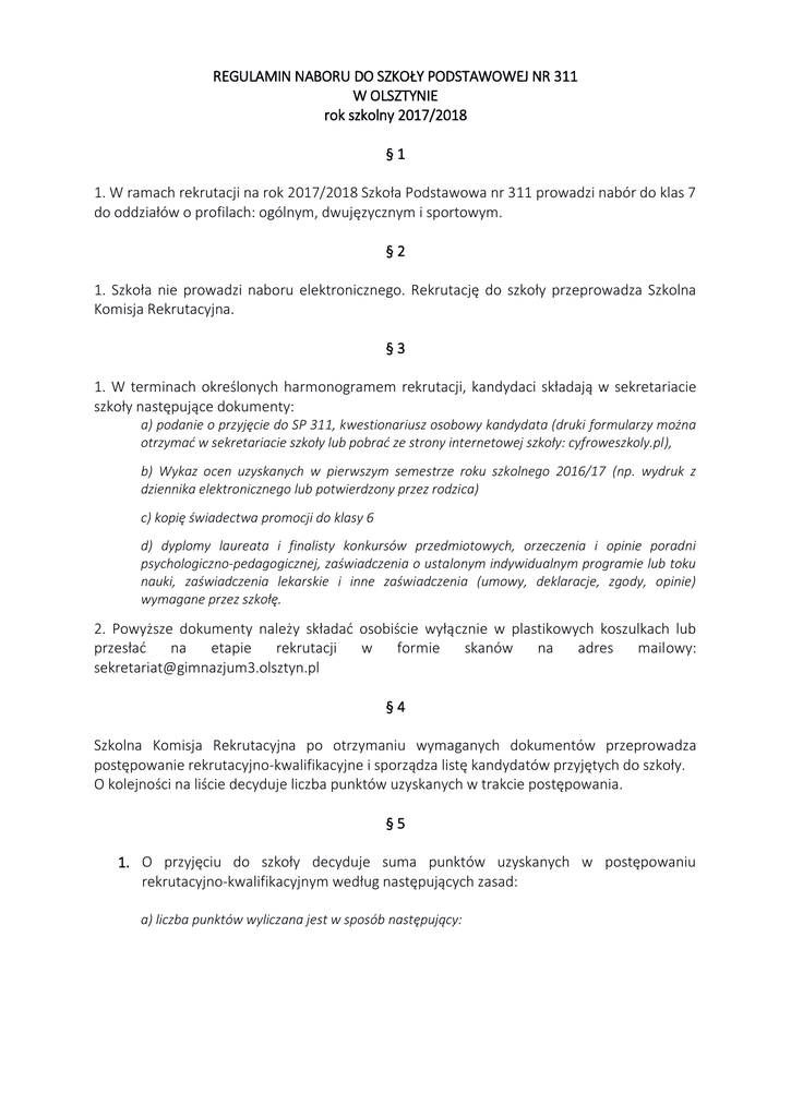 REGULAMIN NABORU DO SZKOŁY PODSTAWOWEJ NR 311 W OLSZTYNIE rok szkolny 2017/2018 §1 1. W ramach rekrutacji na rok 2017/2018 Szkoła Podstawowa nr 311 prowadzi nabór do klas 7 do oddziałów o profilach: ogólnym, dwujęzycznym i sportowym. §2 1. Szkoła nie prowadzi naboru elektronicznego. Rekrutację do szkoły przeprowadza Szkolna Komisja Rekrutacyjna. §3 1. W terminach określonych harmonogramem rekrutacji, kandydaci składają w sekretariacie szkoły następujące dokumenty: a) podanie o przyjęcie do SP 311, kwestionariusz osobowy kandydata (druki formularzy można otrzymać w sekretariacie szkoły lub pobrać ze strony internetowej szkoły: cyfroweszkoly.pl), b) Wykaz ocen uzyskanych w pierwszym semestrze roku szkolnego 2016/17 (np. wydruk z dziennika elektronicznego lub potwierdzony przez rodzica) c) kopię świadectwa promocji do klasy 6 d) dyplomy laureata i finalisty konkursów przedmiotowych, orzeczenia i opinie poradni psychologiczno-pedagogicznej, zaświadczenia o ustalonym indywidualnym programie lub toku nauki, zaświadczenia lekarskie i inne zaświadczenia (umowy, deklaracje, zgody, opinie) wymagane przez szkołę. 2. Powyższe dokumenty należy składać osobiście wyłącznie w plastikowych koszulkach lub przesłać na etapie rekrutacji w formie skanów na adres mailowy: [email protected] §4 Szkolna Komisja Rekrutacyjna po otrzymaniu wymaganych dokumentów przeprowadza postępowanie rekrutacyjno-kwalifikacyjne i sporządza listę kandydatów przyjętych do szkoły. O kolejności na liście decyduje liczba punktów uzyskanych w trakcie postępowania. §5 1. O przyjęciu do szkoły decyduje suma punktów uzyskanych w postępowaniu rekrutacyjno-kwalifikacyjnym według następujących zasad: a) liczba punktów wyliczana jest w sposób następujący: Maksymalne punkty za osiągnięcia kandydata Punktowane osiągnięcia kandydata 4 2 Maksymalna liczba punktów do zdobycia: 110 Kandydaci do oddziałów dwujęzycznych 18 18 18 18 18 2 2 Kandydaci do oddziałów ogólnych i sportowych a) ocena (na 1 sem. w kl. 6) z języka polskiego x 3 b) ocena (na 1 sem. w kl. 6) z języka obcego x 3 c) ocena (na 1 sem. w kl. 6) z matematyki x 3 d) ocena (na 1 sem. w kl. 6) z historii x 3 e) ocena (na 1 sem. w kl. 6) z przyrody x 3 f) świadectwo ukończenia kl. 5-tej z wyróżnieniem g) zachowanie wzorowe h) szczególne osiągnięcia (jeden wpis) - 2 punkty (dwa i więcej wpisów) – 4 punkty i) tytuł finalisty z konkursów organizowanych przez kuratorium j) test kwalifikacyjny z j. angielskiego (tylko kandydaci do oddziałów dwujęzycznych) Maksymalna liczba punktów do zdobycia: 100 10 b) Kandydaci, którzy zdobyli tytuł Laureata w konkursach organizowanych przez Kuratorium Oświaty w postępowaniu rekrutacyjnym otrzymują maksymalną liczbę punktów; c) maksymalna liczba punktów, które może uzyskać kandydat wynosi 100 dla oddziałów ogólnych i sportowych oraz 110 dla oddziałów dwujęzycznych; d) Szkolna Komisja Rekrutacyjna nie ustala minimalnej liczby punktów decydującej o przyjęciu kandydata do szkoły. §6 W pierwszej kolejności do danego oddziału przyjmowani są uczniowie, którzy uzyskali największą liczbę punktów. §7 Kandydaci do klas dwujęzycznych zobowiązani są do napisania testu kwalifikacyjnego. Termin zostanie podany na stronie internetowej (cyfroweszkoly.pl) oraz każdy kandydat zostanie powiadomiony o terminie mailowo. Test kwalifikacyjny do klasy dwujęzycznej to sprawdzian umiejętności językowych oparty na podstawie programowej z języka angielskiego obowiązującej w obecnych szkołach podstawowych. Test ten będzie się składał z trzech części: Słuchanie ze zrozumieniem Czytanie ze zrozumieniem Leksyka, gramatyka i funkcje językowe (zadania sprawdzające słownictwo i gramatykę oraz wyrażenia komunikacyjne) Z testu zwolnieni będą uczniowie posiadający tytuł laureata lub finalisty konkursu z języka angielskiego organizowanego przez Kuratorium Oświaty w Olsztynie. §8 Kandydaci do oddziałów Sportowych zobowiązani są do dostarczenia odpowiedniego zaświadczenia lekarskiego o stanie zdrowia oraz do przejścia testów sprawnościowych, które odbędą się w wyznaczonym terminie. Informacja na stronie: (cyfroweszkoly.pl) oraz każdy kandydat zostanie powiadomiony o terminie mailowo. §9 1) Nabór do klas VII prowadzony będzie zgodnie z poniższym harmonogramem: a) od 15 lutego 2017 r.– składanie dokumentów w sekretariacie szkoły: − Podanie o przyjęcie kandydata do szkoły − Kwestionariusz kandydata − świadectwo ukończenia V klasy szkoły podstawowej, − wykaz ocen uzyskanych na zakończenie I semestru VI klasy szkoły podstawowej, − opinia z poradni psychologiczno-pedagogicznej (jeżeli uczeń taką posiada), - zaświadczenie o stanie zdrowia (tylko kandydaci do oddziałów sportowych) b) 31 maja 2017 - ogłoszenie listy uczniów przyjętych do klas VII na rok szkolny 2017/2018, c) 8 czerwca 2017 r. – zebranie informacyjne dla rodziców uczniów przyjętych do klas VII na rok szkolny 2017/2018 z Dyrektorem szkoły, d) do 29 czerwca 2017 r. – dostarczenie świadectwa ukończenia VI klasy szkoły podstawowej oraz karty zdrowia. 2) Kandydaci umieszczeni na listach przyjętych do szkoły zobowiązani są do potwierdzenia woli podjęcia nauki w danej szkole poprzez dostarczenie oryginalnych dokumentów: świadectwa promocji i zaświadczenia o stanie zdrowia (oddziały sportowe) w terminie określonym w harmonogramie. § 10 W przypadku, gdy w wyniku przeprowadzonej rekrutacji pozostaną w oddziałach wolne miejsca, przeprowadzona zostanie rekrutacja uzupełniająca na zasadach obowiązujących w pierwszym terminie postępowania rekrutacyjnego. § 11 1. Odwołania związane wyłącznie z dostrzeżonymi błędami proceduralnymi (np.: w obliczaniu liczby punktów) należy składać do dyrektora szkoły w ciągu trzech dni od ogłoszenia ostatecznej listy przyjętych. Odwołania zostaną rozpatrzone w ciągu siedmi