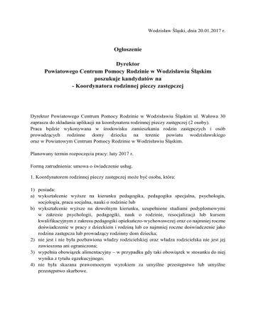 Wodzisław Śląski, dnia 20.01.2017 r. Ogłoszenie Dyrektor Powiatowego Centrum Pomocy Rodzinie w Wodzisławiu Śląskim poszukuje kandydatów na - Koordynatora rodzinnej pieczy zastępczej Dyrektor Powiatowego Centrum Pomocy Rodzinie w Wodzisławiu Śląskim ul. Wałowa 30 zaprasza do składania aplikacji na koordynatora rodzinnej pieczy zastępczej (2 osoby). Praca będzie wykonywana w środowisku zamieszkania rodzin zastępczych i osób prowadzących rodzinne domy dziecka na terenie powiatu wodzisławskiego oraz w Powiatowym Centrum Pomocy Rodzinie w Wodzisławiu Śląskim. Planowany termin rozpoczęcia pracy: luty 2017 r. Formą zatrudnienia: umowa o świadczenie usług. 1. Koordynatorem rodzinnej pieczy zastępczej może być osoba, która: 1) posiada: a) wykształcenie wyższe na kierunku pedagogika, pedagogika specjalna, psychologia, socjologia, praca socjalna, nauki o rodzinie lub b) wykształcenie wyższe na dowolnym kierunku, uzupełnione studiami podyplomowymi w zakresie psychologii, pedagogiki, nauk o rodzinie, resocjalizacji lub kursem kwalifikacyjnym z zakresu pedagogiki opiekuńczo-wychowawczej oraz co najmniej roczne doświadczenie w pracy z dzieckiem i rodziną lub co najmniej roczne doświadczenie jako rodzina zastępcza lub prowadzący rodzinny dom dziecka; 2) nie jest i nie była pozbawiona władzy rodzicielskiej oraz władza rodzicielska nie jest jej zawieszona ani ograniczona; 3) wypełnia obowiązek alimentacyjny – w przypadku gdy taki obowiązek w stosunku do niej wynika z tytułu egzekucyjnego; 4) nie była skazana prawomocnym wyrokiem za umyślne przestępstwo lub umyślne przestępstwo skarbowe. 2. Zakres wykonywanej pracy obejmuje: 1) udzielanie pomocy rodzinom zastępczym (wskazanym przez organizatora rodzinnej pieczy zastępczej) w realizacji zadań wynikających z ustawy o wspieraniu rodziny i systemie pieczy zastępczej, 2) przygotowanie we współpracy z rodziną zastępczą planu pomocy dziecku, 3) pomoc rodzinom zastępczym w nawiązaniu wzajemnego kontaktu, 4) zapewnienie rodzinom zastępczym dostępu do specjalistycznej pomocy dla dzieci, w tym psychologicznej, reedukacyjnej i rehabilitacyjnej, 5) zgłaszanie do ośrodków adopcyjnych informacji o dzieciach z uregulowaną sytuacją prawną, w celu poszukiwania dla nich rodzin przysposabiających, 6) udzielanie wsparcia pełnoletnim wychowankom rodzinnych form pieczy zastępczej, 7) przedstawianie corocznego sprawozdania z efektów pracy organizatorowi rodzinnej pieczy zastępczej, 8) współpraca z pracownikami Sekcji Wparcia Rodzin w zakresie promowania rodzicielstwa zastępczego, 9) współpraca z wydziałami rodzinnymi sądów, kuratorami sądowymi i społecznymi, ośrodkami adopcyjnymi, ośrodkami pomocy społecznej, powiatowymi centrami pomocy rodzinie, poradniami psychologiczno- pedagogicznymi rodzinnymi ośrodkami, diagnostyczno-konsultacyjnymi, instytucjami oświatowymi, zakładami opieki zdrowotnej, kościołami i związkami wyznaniowymi, organizacjami pozarządowymi, stowarzyszeniami działającymi na rzecz dziecka i rodziny, 10) uczestnictwo w posiedzeniach zespołu ds. oceny sytuacji dziecka umieszczonego w pieczy zastępczej i oceny rodzin zastępczych, 11) uczestnictwo w spotkaniach dzieci przebywających w rodzinnych formach opieki zastępczej z rodzicami naturalnymi oraz sporządzanie notatek z przebiegu spotkań. Osoby zainteresowane pracą koordynatora rodzinnej pieczy zastępczej proszone są o dostarczenie następującej dokumentacji: 1) list motywacyjny, 2) życiorys - Curriculum Vitae, 3) kserokopie świadectw pracy, zaświadczenia potwierdzające odbyte staże lub zaświadczenie potwierdzające obecne zatrudnienie, 4) kserokopie dyplomów potwierdzających wykształcenie, 5) kserokopie zaświadczeń o ukończonych kursach, szkoleniach, referencje, 6) oświadczenie, że nie jest i nie była pozbawiona władzy rodzicielskiej oraz władza rodzicielska nie jest jej zawieszona ani ograniczona; 7) oświadczenia, że wypełnia obowiązek alimentacyjny – w przypadku gdy taki obowiązek w stosunku do niej wynika z tytułu egzekucyjnego; 8) oświadczenia, nie była skazana prawomocnym wyrokiem za umyślne przestępstwo lub umyślne przestępstwo skarbowe 9) oświadczenie o posiadaniu pełnej zdolności do czynności prawnych oraz korzystaniu z pełni praw publicznych, 10) oświadczenie o niekaralności za przestępstwo popełnione umyślnie ścigane z oskarżenia publicznego lub umyślne przestępstwo skarbowe, albo dokumenty zawierające dane w tym zakresie, 11) oświadczenie o wyrażeniu zgody na przetwarzanie danych osobowych zawartych w ofercie pracy, dla potrzeb niezbędnych do realizacji procesu rekrutacji. 3. Wskazane prawo jazdy oraz własny samochód. Powyższe dokumenty aplikacyjne należy składać osobiście w siedzibie Powiatowego Centrum Pomocy Rodzinie w Wodzisławiu Śląskim przy ul. Wałowej 30 w Sekcji Organizacyjnej, Kadr i Kontroli pok. nr 10 w godzinach 730 - 1530 lub drogą pocztową, w zamkniętych kopertach opisanych imieniem i nazwiskiem, adresem osoby aplikującej z adnotacją: „Koordynator rodzinnej pieczy zastępczej”, w terminie do dnia 20.02.2017 r.