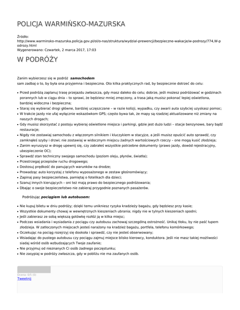 POLICJA WARMIŃSKO-MAZURSKA Źródło: http://www.warminsko-mazurska.policja.gov.pl/ol/o-nas/struktura/wydzial-prewencji/bezpieczne-wakacje/w-podrozy/774,W-p odrozy.html Wygenerowano: Czwartek, 2 marca 2017, 17:03 W PODRÓŻY Zanim wybierzesz się w podróż samochodem sam zadbaj o to, by była ona przyjemna i bezpieczna. Oto kilka praktycznych rad, by bezpiecznie dotrzeć do celu: ● Przed podróżą zaplanuj trasę przejazdu zwłaszcza, gdy masz daleko do celu; dobrze, jeśli możesz podróżować w godzinach porannych lub w ciągu dnia – to sprawi, że będziesz mniej zmęczony, a trasa jaką musisz pokonać lepiej oświetlona, bardziej widoczna i bezpieczna; ● Staraj się wybierać drogi główne, bardziej uczęszczane – w razie kolizji, wypadku, czy awarii auta szybciej uzyskasz pomoc; ● W trakcie jazdy nie ufaj wyłącznie wskazówkom GPS; często bywa tak, że mapy są rzadziej aktualizowane niż zmiany na naszych drogach; ● Gdy musisz skorzystać z postoju wybieraj oświetlone miejsca i parkingi, gdzie jest dużo ludzi – stacje benzynowe, bary bądź restauracje; ● Nigdy nie zostawiaj samochodu z włączonym silnikiem i kluczykiem w stacyjce, a jeśli musisz opuścić auto sprawdź, czy zamknąłeś szyby i drzwi; nie zostawiaj w widocznym miejscu żadnych wartościowych rzeczy – one mogą kusić złodzieja; ● Zanim wyruszysz w drogę upewnij się, czy zabrałeś wszystkie potrzebne dokumenty (prawo jazdy, dowód rejestracyjny, ubezpieczenie OC); ● Sprawdź stan techniczny swojego samochodu (poziom oleju, płynów, światła); ● Przestrzegaj przepisów ruchu drogowego; ● Dostosuj prędkość do panujących warunków na drodze; ● Prowadząc auto korzystaj z telefonu wyposażonego w zestaw głośnomówiący; ● Zapinaj pasy bezpieczeństwa, pamiętaj o fotelikach dla dzieci; ● Szanuj innych kierujących – oni też mają prawo do bezpiecznego podróżowania; ● Dbając o swoje bezpieczeństwo nie zabieraj przygodnie poznanych pasażerów. Podróżując pociągiem lub autobusem: ● Nie kupuj biletu w dniu podróży; dzięki temu unikniesz ryzyka kradzieży bagażu, gdy będziesz przy kasie; ● Wszystkie dokumenty chowaj w wewnętrznych kieszeniach ubrania; nigdy nie w tylnych kieszeniach spodni; ● Jeśli zabierasz ze sobą większą gotówkę rozłóż ją w kilka miejsc; ● Podczas wsiadania i wysiadania z pociągu czy autobusu zachowaj szczególną ostrożność. Unikaj tłoku, by nie paść łupem złodzieja. W zatłoczonych miejscach jesteś narażony na kradzież bagażu, portfela, telefonu komórkowego; ● Oczekując na pociąg rozejrzyj się dookoła i sprawdź, czy nie jesteś obserwowany; ● Wsiadając do pustego autobusu czy pociągu zajmuj miejsce blisko kierowcy, konduktora. Jeśli nie masz takiej możliwości siadaj wśród osób wzbudzających Twoje zaufanie; ● Nie przyjmuj od nieznanych Ci osób żadnego poczęstunku; ● Nie zasypiaj w podróży zwłaszcza, gdy w pobliżu nie ma zaufanych osób. Ocena: 0/5 (0) Tweetnij