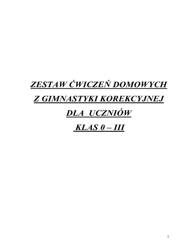 ZESTAW ĆWICZEŃ DOMOWYCH Z GIMNASTYKI KOREKCYJNEJ DLA UCZNIÓW KLAS 0 – III 1 WSTĘP Zdrowe i proste dziecko to marzenie i dążenie wszystkich rodziców i wychowawców . Czy takie będzie Wasze dziecko? W dużym stopniu zależy to od Was – Rodziców. Postęp cywilizacji ma ogromny wpływ na organizm dziecka. Rosnące zanieczyszczenie środowiska, mniejsza ilość ruchu spowodowana zbyt długim przesiadywaniem przed telewizorem czy komputerem, nieprawidłowe odżywianie powodują, że nasze dzieci nie zawsze rosną i rozwijają się prawidłowo. Mała aktywność ruchowa, sprawia ze mięśnie są słabsze, a układ krążenia i układ oddechowy mniej wydajne. Organizm dziecka staje się przez to bardziej podatny na niekorzystne zmiany środowiska zewnętrznego np. choroby . Okres przedszkolny i wczesno szkolny jest szczególnie ważny dla kształtowania postawy i motoryki dziecka. W tymże okresie rozwoju dziecko nabiera pewnych umiejętności i wzorców ruchowych, które w późniejszym życiu jedynie doskonali. Największy wpływ na prawidłowy rozwój dziecka mają Rodzice. Rodzice są dla dziecka źródłem wzorów, przekazują wiadomości, umiejętności i nawyki, tak społeczne i również ruchowe. Niektóre dzieci wymagają jednak szczególnej troski i większej ilości ćwiczeń . Jest to związane z występującą u nich tendencją do wad postawy. Ćwiczenia – zaprezentowane przeze mnie w dalszej części mają charakter zarówno profilaktyczny jak i korekcyjny. Celem ćwiczeń jest dążenie do osiągnięcia prawidłowego fizycznego i psychicznego rozwoju dziecka, by było zdrowe, sprawne, miało prawidłową sylwetkę . Nie bez znaczenia jest również korzystny wpływ ćwiczeń na sprawność i kondycję samych rodziców. Dobra , poprawna postawa ciała ma ogromne znaczenie dla zdrowia dziecka. Istnieje związek między zdrowiem a postawą ciała. Jeżeli dziecko zażywa dużo ruchu, przebywa w higienicznych warunkach i prawidłowo się odżywia, to jego postawa ciała kształtuje się i rozwija w sposób prawidłowy. Zapewne każdy Rodzic jest przekonany ,że nieprawidłowa postawa ciała nie dotyczy jego dziecka. Z badań, jednak wynika że blisko 70% dzieci w wieku szkolnym 2 ma wady postawy. W przypadku 30% dzieci są to już wady utrwalone czyli trudne do leczenia. Można tego uniknąć rozpoczynając systematyczną obserwację i ćwiczenia z dziećmi już w wieku przedszkolnym i wczesno szkolnym . Zaprezentowane Państwu ćwiczenia służą jako przewodnik do pracy waszymi dziećmi w domu . ćwiczenia te należy stosować w profilaktyce i leczeniu poszczególnych wad postawy. Jak ćwiczyć z dzieckiem w domu? Drogi Rodzicu! Pamiętaj ,że ćwiczenia z dzieckiem przedszkolnym i wczesno szkolnym powinny: uwzględniać wadę postawy, być dostosowane do możliwości dziecka, mieć charakter zabawy. Jeżeli my Rodzice również wykażemy zainteresowanie ćwiczeniami, dziecko będzie się mobilizowało do ćwiczeń, zechce nam dowieść , że potrafi je wykonać. Ćwicząc razem z dzieckiem w sposób zabawowy, odkrywczy, nawiązujemy jednocześnie większą więź z naszą Pociechą. 3 ZESTAW ĆWICZEŃ DOMOWYCH PLECY WKLĘSŁE Ćwiczenia rozciągające mięśnie biodrowo – lędźwiowe i proste uda – biernie 1. Poz. wyj: Półszpagat (siad klęczny na jednej N, druga N wyprostowana w tył), T pochylony w przód, RR w pozycji „skrzydełek”. Ruch: Rozluźnianie zginaczy stawu biodrowego. Zmiana NN . 2. Poz. wyj: Wypad (jedna N ugięta w wykroku, druga prosta w zakroku) , T wyprostowany pochylony w przód, RR w pozycji „skrzydełek”. Ruch: Pogłębianie wypadu ciężarem ciała. Zmiana NN. Ćwiczenia rozciągające mięśnie biodrowo – lędźwiowe i proste uda – czynnie 1. Poz. wyj: Leżenie tyłem. Jedna N wyprostowana leży na podłodze, druga ugięta, kolano przy klatce piersiowej. Dłonie ułożone na kolanie N ugiętej. Ruch: Przyciąganie rękoma kolana N ugiętej do klatki piersiowej, z jednoczesnym przyciskaniem N wyprostowanej do podłogi. W czasie ćwiczenia barki przylegają do podłogi. 2. Poz. wyj: Klęk podparty na jednej N, druga N wyprostowana w tył. Ruch: Przejście do pozycji niskiej Klappa bez odrywania rąk od podłogi z maksymalnym wyciągnięciem N wyprostowanej w tył. 3. Poz. wyj: Wypad z oparciem kolana N zakrocznej na podłodze, T wyprostowany pochylony w przód, RR w pozycji „skrzydełek”. Ruch: Pogłębianie wypadu poprzez ugięcie N wykrocznej (N ustawionej z przodu) i opuszczenie bioder. 4 Ćwiczenia rozciągające mięśnie prostownika grzbietu odcinka lędźwiowego i czworobocznego lędźwi – czynnie 1. Poz. wyj: Stanie w rozkroku. RR wyprostne, wyciągnięte w górę. Ciężar ciała umieszczony na zewnętrznych krawędziach stóp. Ruch: Skłon T w przód, dotknięcie dłońmi do podłogi między stopami, można ugiąć NN w kolanach. 2. Poz. wyj: Stanie na czworakach, NN ugięte w stawach, RR wyprostowane, wyciągnięte w górę . Ruch: Marsz na czworakach bez uginania NN. 3. Poz. wyj: Siad rozkroczny, NN ugięte w stawach, RR wyprostowane, wyciągnięte w górę . Ruch: Skłon T w przód z położeniem dłoni na podłodze i wysuwanie ich jak najdalej w przód. 4. Poz. wyj: Klęk podparty. Ruch: Przejście do pozycji niskiej Klappa, bez oderwania dłoni od podłogi. Wzrok cały czas skierowany na podłogę. Ćwiczenia wzmacniające mięśnie brzucha 1. Poz. wyj: Leżenie tyłem , NN ugięte, oparte na podłodze. RR w pozycji „skrzydełek” leżą na podłodze . Ruch: Wyprost NN w stawach kolanowych, bez ruchu w stawach biodrowych ( NN unieść do kąta ok.45 ˚) i powrót do pozycji wyjściowej. 2. Poz. wyj: Leżenie tyłem, NN nisko uniesione nad podłogą 20 – 30 cm, Jedna N ugięta, kolano przy klatce piersiowej, druga N wyprostowana . Ruch: Zmiana ułożenia NN . 3. Poz. wyj: Leżenie tyłem, NN ugięte, stopy oparte na podłodze, RR w pozycji „skrzydełek” . Ruch: Uniesienie głowy i barków nad podło