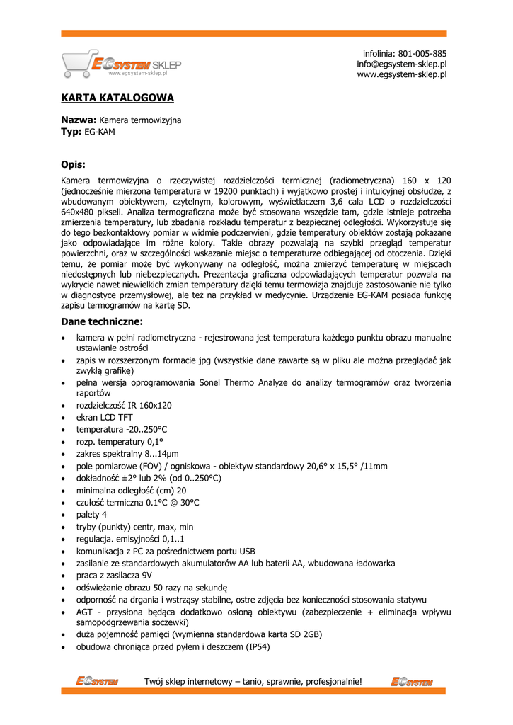 infolinia: 801-005-885 [email protected] www.egsystem-sklep.pl KARTA KATALOGOWA Nazwa: Kamera termowizyjna Typ: EG-KAM Opis: Kamera termowizyjna o rzeczywistej rozdzielczości termicznej (radiometryczna) 160 x 120 (jednocześnie mierzona temperatura w 19200 punktach) i wyjątkowo prostej i intuicyjnej obsłudze, z wbudowanym obiektywem, czytelnym, kolorowym, wyświetlaczem 3,6 cala LCD o rozdzielczości 640x480 pikseli. Analiza termograficzna może być stosowana wszędzie tam, gdzie istnieje potrzeba zmierzenia temperatury, lub zbadania rozkładu temperatur z bezpiecznej odległości. Wykorzystuje się do tego bezkontaktowy pomiar w widmie podczerwieni, gdzie temperatury obiektów zostają pokazane jako odpowiadające im różne kolory. Takie obrazy pozwalają na szybki przegląd temperatur powierzchni, oraz w szczególności wskazanie miejsc o temperaturze odbiegającej od otoczenia. Dzięki temu, że pomiar może być wykonywany na odległość, można zmierzyć temperaturę w miejscach niedostępnych lub niebezpiecznych. Prezentacja graficzna odpowiadających temperatur pozwala na wykrycie nawet niewielkich zmian temperatury dzięki temu termowizja znajduje zastosowanie nie tylko w diagnostyce przemysłowej, ale też na przykład w medycynie. Urządzenie EG-KAM posiada funkcję zapisu termogramów na kartę SD. Dane techniczne: kamera w pełni radiometryczna - rejestrowana jest temperatura każdego punktu obrazu manualne ustawianie ostrości zapis w rozszerzonym formacie jpg (wszystkie dane zawarte są w pliku ale można przeglądać jak zwykłą grafikę) pełna wersja oprogramowania Sonel Thermo Analyze do analizy termogramów oraz tworzenia raportów rozdzielczość IR 160x120 ekran LCD TFT temperatura -20..250°C rozp. temperatury 0,1° zakres spektralny 8...14μm pole pomiarowe (FOV) / ogniskowa - obiektyw standardowy 20,6° x 15,5° /11mm dokładność ±2° lub 2% (od 0..250°C) minimalna odległość (cm) 20 czułość termiczna 0.1°C @ 30°C palety 4 tryby (punkty) centr, max, min regulacja. emisyjności 0,1..1 komunikacja z PC za pośrednictwem portu USB zasilanie ze standardowych akumulatorów AA lub baterii AA, wbudowana ładowarka praca z zasilacza 9V odświeżanie obrazu 50 razy na sekundę odporność na drgania i wstrząsy stabilne, ostre zdjęcia bez konieczności stosowania statywu AGT - przysłona będąca dodatkowo osłoną obiektywu (zabezpieczenie + eliminacja wpływu samopodgrzewania soczewki) duża pojemność pamięci (wymienna standardowa karta SD 2GB) obudowa chroniąca przed pyłem i deszczem (IP54) Twój sklep internetowy – tanio, sprawnie, profesjonalnie! infolinia: 801-005-885 [email protected] www.egsystem-sklep.pl oprogramowanie PC do analizy. pełne darmowe (j. angielski, polski, niemiecki, hiszpański, rosyjski) wygodna aktualizacja przez stronę www temperatura pracy -10°C to 50°C temperatura przechowywania -20°C to 60°C wilgotność 10% to 95%, bez kondensacji certyfikaty CE Mark (Europe) wibracje 2G, IEC 68-2-6 wstrząsy 25G, IEC 68-2-29 wymiary 240mm x 124mm x 111mm waga 0.73kg (z bateriami) zgodność kamery termowizyjnej ze standardem EN61326-1:2006 menu w języku polskim w zestawie zewnętrzny czytnik kart SD kolor pomarańczowo-szary 24 miesiące gwarancji Twój sklep internetowy – tanio, sprawnie, profesjonalnie!
