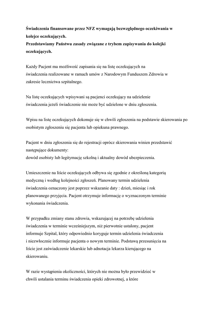 Świadczenia finansowane przez NFZ wymagają bezwzględnego oczekiwania w kolejce oczekujących. Przedstawiamy Państwu zasady związane z trybem zapisywania do kolejki oczekujących. Każdy Pacjent ma możliwość zapisania się na listę oczekujących na świadczenia realizowane w ramach umów z Narodowym Funduszem Zdrowia w zakresie lecznictwa szpitalnego. Na listę oczekujących wpisywani są pacjenci oczekujący na udzielenie świadczenia jeżeli świadczenie nie może być udzielone w dniu zgłoszenia. Wpisu na listę oczekujących dokonuje się w chwili zgłoszenia na podstawie skierowania po osobistym zgłoszeniu się pacjenta lub opiekuna prawnego. Pacjent w dniu zgłoszenia się do rejestracji oprócz skierowania winien przedstawić następujące dokumenty: dowód osobisty lub legitymację szkolną i aktualny dowód ubezpieczenia. Umieszczenie na liście oczekujących odbywa się zgodnie z określoną kategorią medyczną i według kolejności zgłoszeń. Planowany termin udzielenia świadczenia oznaczony jest poprzez wskazanie daty : dzień, miesiąc i rok planowanego przyjęcia. Pacjent otrzymuje informację o wyznaczonym terminie wykonania świadczenia. W przypadku zmiany stanu zdrowia, wskazującej na potrzebę udzielenia świadczenia w terminie wcześniejszym, niż pierwotnie ustalony, pacjent informuje Szpital, który odpowiednio koryguje termin udzielenia świadczenia i niezwłocznie informuje pacjenta o nowym terminie. Podstawą przesunięcia na liście jest zaświadczenie lekarskie lub adnotacja lekarza kierującego na skierowaniu. W razie wystąpienia okoliczności, których nie można było przewidzieć w chwili ustalania terminu świadczenia opieki zdrowotnej, a które uniemożliwiają zachowanie terminu wynikającego z listy oczekujących, Centrum poinformuje o tym fakcie pacjenta podając nowy termin. Dotyczy to również przesunięcia terminu na okres wcześniejszy. Jeżeli pacjent odwoła wizytę, ponieważ w wyznaczonym terminie nie może się stawić z powodów osobistych /np. urlop, pobyt w sanatorium/ lub medycznych / np. konieczność wykonania innych procedur, szczepień lub choroby Centrum dokona zmiany planowanego terminu udzielenia świadczenia. Pacjent ma obowiązek niezwłocznego powiadomienia Szpitala w przypadku rezygnacji z zaplanowanego świadczenia. W przypadku kiedy pacjent nie stawi się w wyznaczonym terminie bez powiadomienia, zostaje skreślony z listy oczekujących na to świadczenie.