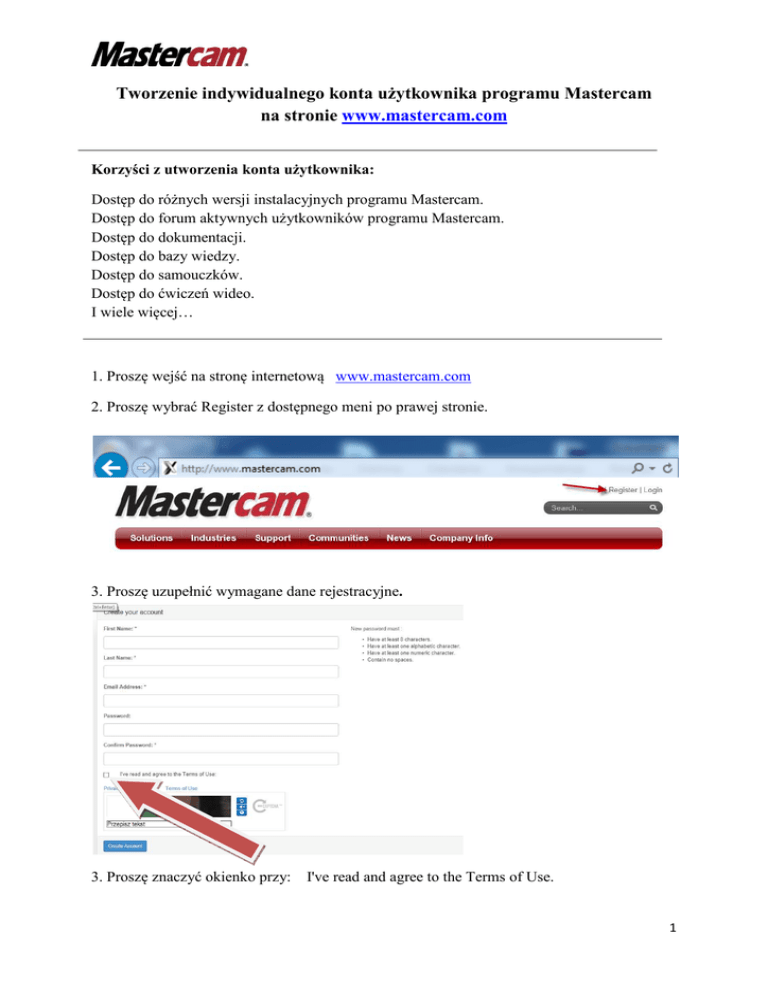 Tworzenie indywidualnego konta użytkownika programu Mastercam na stronie www.mastercam.com Korzyści z utworzenia konta użytkownika: Dostęp do różnych wersji instalacyjnych programu Mastercam. Dostęp do forum aktywnych użytkowników programu Mastercam. Dostęp do dokumentacji. Dostęp do bazy wiedzy. Dostęp do samouczków. Dostęp do ćwiczeń wideo. I wiele więcej… 1. Proszę wejść na stronę internetową www.mastercam.com 2. Proszę wybrać Register z dostępnego meni po prawej stronie. 3. Proszę uzupełnić wymagane dane rejestracyjne. 3. Proszę znaczyć okienko przy: I've read and agree to the Terms of Use. 1 4. Proszę przepisać tekst z wyświetlonego obrazka. 5. Proszę kliknąć niebieski przycisk Create Acconunt. 6. Konto zostanie utworzone. 7. Na podany adres e-mail użyty podczas rejestracji zostaną przesłane dane służące aktywacji konta (proszę sprawdzić również folder SPAM). 8. Proszę kliknąć w podany link aktywacyjny otrzymany na e-mial. Wyświetli się następujący komunikat: 9.Po udanej aktywacji proszę się zalogować na swoje konto na stronie www.mastercam.com zakładka Login lub kliknąć w przycisk Proceed to Login. 2 Pobieranie wersji instalacyjnych programu Mastercam W celu pobierania wersji instalacyjnych programu Mastercam nasze konto użytkownika na stronie internetowej musi być połączone z licencją programu Mastercam. W celu polaczenia konta użytkownika z licencją proszę pobrać program generujący hasło i uruchomić go na komputerze, gdzie zainstalowany jest program Mastercam oraz włożony jest klucz zabezpieczający. Link do programu generującego kod (dla wersji starszych niż X8) https://www.mastercam.com/Portals/0/files/support/downloads/drivers/MastercamDotComLinking.exe W wersji Mastercam X9/X8 możliwe jest wygenerowanie kodu połączeniowego z meni Help- Link on Mastercam.com W wersji Mastercam X9/X8 postępować zgodnie z instrukcjami wyświetlonymi przez program. 3 Po uruchomieniu programu zostanie wygenerowane indywidualne hasło, które należy skopiować do formularza dostępnego po zalogowaniu na swoje konto użytkownika. Formularz jest dostępny po kliknięciu w nazwę użytkownika po zalogowaniu. Następnie klikamy Link my account. Konta zostaną połączone. 4 Po poprawnym połączeniu konta użytkownika z licencja programu wybieramy Support -Downloads Klikamy w link Mastercam Z dostępnego meni wybieramy interesująca nas wersje instalacją programu i rozpoczynamy pobieranie. 5 Komunikat podczas instalacji programu Mastercam X9/X8. Jeśli podczas próby instalacji programu Mastercam X9/X8 otrzymamy komunikat "The program can’t start because WIBUCM32.dll is missing…" proszę pobrać i zainstalować odpowiednia wersje programu CodeMeter 4.5c zgodną z posiadaną wersja Windows (32 lub 64 bit) z lokalizacji: www.mastercam.com/en-us/Support-Downloads-Drivers-and-Applets 6 Wymagania systemowe programu Mastercam X9: Wymagany system Windows: - Windows 10 64-bit - Windows 8/8.1 64-bit - Windows 7 64-bit Wymagania systemowe dla starszych wersji program: Wymagania sprzętowe programu Mastercam X9: W przypadku problemów prosimy o kontakt. Generalny dealer systemu Mastercam. tel.: 22/ 894 55 00 e-mail: [email protected] 7
