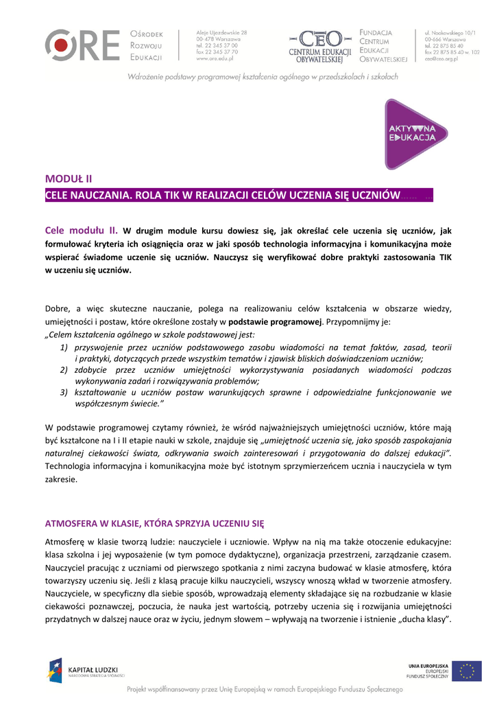 MODUŁ II CELE NAUCZANIA. ROLA TIK W REALIZACJI CELÓW UCZENIA SIĘ UCZNIÓW…… … Cele modułu II. W drugim module kursu dowiesz się, jak określać cele uczenia się uczniów, jak formułować kryteria ich osiągnięcia oraz w jaki sposób technologia informacyjna i komunikacyjna może wspierać świadome uczenie się uczniów. Nauczysz się weryfikować dobre praktyki zastosowania TIK w uczeniu się uczniów. Dobre, a więc skuteczne nauczanie, polega na realizowaniu celów kształcenia w obszarze wiedzy, umiejętności i postaw, które określone zostały w podstawie programowej. Przypomnijmy je: „Celem kształcenia ogólnego w szkole podstawowej jest: 1) przyswojenie przez uczniów podstawowego zasobu wiadomości na temat faktów, zasad, teorii i praktyki, dotyczących przede wszystkim tematów i zjawisk bliskich doświadczeniom uczniów; 2) zdobycie przez uczniów umiejętności wykorzystywania posiadanych wiadomości podczas wykonywania zadań i rozwiązywania problemów; 3) kształtowanie u uczniów postaw warunkujących sprawne i odpowiedzialne funkcjonowanie we współczesnym świecie.” W podstawie programowej czytamy również, że wśród najważniejszych umiejętności uczniów, które mają być kształcone na I i II etapie nauki w szkole, znajduje się „umiejętność uczenia się, jako sposób zaspokajania naturalnej ciekawości świata, odkrywania swoich zainteresowań i przygotowania do dalszej edukacji”. Technologia informacyjna i komunikacyjna może być istotnym sprzymierzeńcem ucznia i nauczyciela w tym zakresie. ATMOSFERA W KLASIE, KTÓRA SPRZYJA UCZENIU SIĘ Atmosferę w klasie tworzą ludzie: nauczyciele i uczniowie. Wpływ na nią ma także otoczenie edukacyjne: klasa szkolna i jej wyposażenie (w tym pomoce dydaktyczne), organizacja przestrzeni, zarządzanie czasem. Nauczyciel pracując z uczniami od pierwszego spotkania z nimi zaczyna budować w klasie atmosferę, która towarzyszy uczeniu się. Jeśli z klasą pracuje kilku nauczycieli, wszyscy wnoszą wkład w tworzenie atmosfery. Nauczyciele, w specyficzny dla siebie sposób, wprowadzają elementy składające się na rozbudzanie w klasie ciekawości poznawczej, poczucia, że nauka jest wartością, potrzeby uczenia się i rozwijania umiejętności przydatnych w dalszej nauce oraz w życiu, jednym słowem – wpływają na tworzenie i istnienie „ducha klasy”. Od nich w znacznej mierze zależy, jak uczniowie będą podchodzili do uczenia się, na ile będą aktywni w tym procesie oraz w jakim stopniu wezmą odpowiedzialność za naukę. W poprzednim module wypracowane zostały w szkole reguły korzystania z TIK – kodeks TIK. Teraz zajmiemy się zasadami planowania dobrej lekcji, angażującej uczniów w odkrywanie i poznawanie otaczającego ich świata. Dobra lekcja to taka, w czasie której każdy uczeń się uczy. Zanim wprowadzimy do lekcji technologię informacyjną, warto uświadomić sobie, że nie ma dobrego nauczania bez pokazywania uczniom sensu uczenia się i użyteczności wiedzy, którą zdobywają na konkretnej lekcji, bez monitorowania postępów uczniów oraz podsumowania tego, czego się nauczyli. Chodzi o to, by uczniowie znali cele lekcji, by wiedzieli, po czym rozpoznać, że je osiągają i po co mają zastosować technologię informacyjną, w czym ona poprawi proces uczenia się uczniów? Dla nauczyciela istotne będzie, jak TIK może ułatwić i przyspieszyć uczenie się uczniów, do czego może się przydać i czy technologia będzie bardziej skuteczna dydaktycznie niż inne narzędzia wykorzystywane do tej pory. Trzeba przyglądać się wnikliwie, czy nie jest stosowana tylko dla niej samej, a inne, tradycyjne metody nie byłyby skuteczniejsze. OKREŚLENIE I PRZEDSTAWIENIE UCZNIOM CELÓW UCZENIA SIĘ Jeśli uczniowie znają tylko temat lekcji, to często nie domyślają się, co mają poznać, zrozumieć i co nowego będą potrafili, nie dostrzegają sensu uczenia się i tym samym mają mniejszą ochotę do wysiłku, jaki włożą w naukę oraz na osobistą aktywność. Dlatego nauczyciel zastanawia się nad celami przed lekcją i przekazuje je uczniom tak, aby każdy z nich mógł je zrozumieć. W trakcie lekcji uczniowie są w stanie osiągnąć jeden, najwyżej dwa cele uczenia się. Na więcej najczęściej nie wystarcza czasu. Niejednokrotnie cele mylone są przez nas, nauczycieli, z aktywnościami uczniów, działaniami, zadaniami do wykonania. Aby trafnie sformułować cele uczenia się, warto trzymać się zasady: określam to, co chciałabym/ chciałbym, aby moi uczniowie wiedzieli i potrafili po lekcji Aby cele stały się dla uczniów osobistymi celami uczenia się, warto podać je w formach: W czasie dzisiejszej lekcji zrozumiecie… Będziecie potrafili… Należy zadbać o to, aby cele uczenia się były całkowicie jasne dla uczniów i posługiwać się możliwie prostym i zrozumiałym dla dzieci językiem. Jeśli chcemy, aby wszyscy uczniowie w klasie osiągali te cele, muszą najpierw wiedzieć, o co w nich chodzi. Często my, nauczyciele, nie przywiązujemy uwagi do uświadamiania uczniom celów uczenia się. Jesteśmy skupieni na przerobieniu jak największej partii materiału i przekazywaniu maksymalnie dużej porcji informacji, czasem takich, które znacząco wybiegają poza ramy określone podstawą programową. Zazwyczaj spieszymy się z realizacją programu nauczania, gdyż uważamy, że uczniowie wciąż za mało wiedzą, aby osiągnąć wysoki wynik na sprawdzianie zewnętrznym. Taka praktyka nie przynosi zamierzonych efektów i grozi tym, że uczniowie nie nadążą za naszymi wymaganiami. Aby uczniowie mogli ocenić, czy osiągnęli cele, trzeba najpierw ustalić, po czym będzie można to poznać – określić kryteria sukcesu, szukać dowodów świadczących, że uczniowie w czasie lekcji zrozumieli to, co mieli zrozumieć oraz mają umiejętności, które mieli wypracować. Dowodów na to, że uczenie się ma miejsce oraz że przyby
