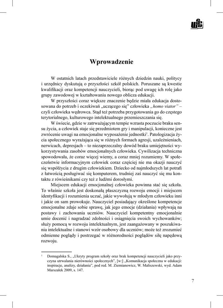 Wprowadzenie W ostatnich latach przedstawiciele różnych dziedzin nauki, politycy i urzędnicy dyskutują o przyszłości szkół polskich. Poruszane są kwestie kwalifikacji oraz kompetencji nauczycieli, biorąc pod uwagę ich rolę jako grupy zawodowej w kształtowaniu nowego oblicza edukacji. W przyszłości coraz większe znaczenie będzie miała edukacja dostosowana do potrzeb i oczekiwań „uczącego się” człowieka „homo viator” – czyli człowieka wędrowca. Stąd też potrzeba przygotowania go do częstego terytorialnego, kulturowego intelektualnego przemieszczania się. W świecie, gdzie w zatrważającym tempie wzrasta poczucie braku sensu życia, a człowiek staje się przedmiotem gry i manipulacji, konieczne jest zwrócenie uwagi na emocjonalne wyposażenie jednostki1. Patologizacja życia społecznego wyrażająca się w różnych formach agresji, uzależnieniach, nerwicach, depresjach – to niezaprzeczalny dowód braku umiejętności wykorzystywania zasobów emocjonalnych człowieka. Cywilizacja techniczna spowodowała, że coraz więcej wiemy, a coraz mniej rozumiemy. W społeczeństwie informacyjnym człowiek coraz częściej nie ma okazji nauczyć się współżycia z drugim człowiekiem. Dziecko od najmłodszych lat potrafi z łatwością posługiwać się komputerem, trudniej zaś nauczyć się mu kontaktu z rówieśnikami czy też z ludźmi dorosłymi. Miejscem edukacji emocjonalnej człowieka powinna stać się szkoła. To właśnie szkoła jest doskonałą płaszczyzną rozwoju emocji i miejscem identyfikacji i rozumienia uczuć, jakie wywołują w młodym człowieku inni i jakie on sam prowokuje. Nauczyciel posiadający określone kompetencje emocjonalne zdaje sobie sprawę, jak jego emocje (działania) wpływają na postawy i zachowania uczniów. Nauczyciel kompetentny emocjonalnie umie docenić i nagradzać zdolności i osiągnięcia swoich wychowanków; służy pomocą w rozwoju intelektualnym, jest zaangażowany w poszukiwania intelektualne i stanowi wzór osobowy dla uczniów; może też zrozumieć odmienne poglądy i postrzegać w różnorodności poglądów siłę napędową rozwoju. 1 Domagalska S., „Ukryty program szkoły oraz brak kompetencji nauczycieli jako przyczyna utrwalania nierówności społecznych”, [w:] „Komunikacja społeczna w edukacji: inspiracje, analizy, działania”, pod red. M. Ziemianowicz, W. Maliszewski, wyd. Adam Marszałek 2009, s. 147. 7 Wstęp Nauka w szkole jest wciąż swoistym dodawaniem informacji do znajdujących się w korze mózgowej „banków” pamięci. Kształtowanie kompetencji emocjonalnych wymaga zmiany nawyków unikania ludzi na rzecz kontaktu z nimi, nie kamuflowania naszych opinii, lecz wyrażania własnego zdania o sobie i drugim człowieku. Są to o wiele trudniejsze zadania od dodawania nowych faktów do starych. Emocjonalne uczenie się wymaga głębszej zmiany – osłabienia istniejącego nawyku i zastąpienia go lepszym. Te umiejętności muszą pozyskać współcześni nauczyciele, aby w cywilizacji zwanej „techniczną” wprowadzić dzieci i młodzież do życia wśród ludzi. Edukacja w tak wielu krajach upowszechniona, dostępna, oferująca równe szanse – zdemokratyzowana na przestrzeni XX wieku, wciąż pełni swe funkcje charakterystyczne dla nieegalitarnych społeczeństw i jest, z samej swej istoty instrumentem – odtwarzania dotychczasowej struktury społecznej, będąc strażniczką zastanego ładu2. To edukacja i jej główna instytucja – szkoła, poprzez procesy selekcyjne rozdysponowuje jednostki na różnych szczeblach „drabiny społecznej”. Zawsze inspirująca koncepcja M.IN. Pierre’a Bourdieu ukazuje, jak szkoła, wśród innych instytucji społecznych, czynnie „przenosi” nierówności społeczne pomiędzy kolejnymi generacjami, podtrzymując i utrwalając pierwotne habitusy wytworzone w z różnicowanych warunkach socjalizacji wewnątrzrodzinnej3. Anthony Giddens przywołuje zdanie badaczy, według, których wśród znaczących czynników nierówności panujących w systemie oświatowym silniejszymi niż płeć okazują się przynależność klasowa i etniczność; [...] z porównań osiągnięć szkolnych uczniów z różnych klas społecznych wynika, ze aż 70% dzieci rodziców pracujących w zawodach inteligenckich najwyższego szczebla, a tylko 14% dzieci robotniczych uzyskuje pięć i więcej ocen pozytywnych4. R. Boudon opracował model tzw. Efektów stratyfikacyjnych, który umożliwia symulację generowania nierówności społecznych. Autor ustalił, ze na wyjściu z poziomu kształcenia obowiązkowego, absolwent ma przyswojone cechy ucznia, a stanowią je głównie wyniki w nauce i inne osiągnięcia szkolne. Poziom tych osiągnięć w dużej mierze pokrywa się ze zróżnicowaniem społecznym. Pierwotny efekt stratyfikacyjny polega na tym, że „osiągnięcia szkolne absolwentów” szkół podstawowych w dużym stopniu przenoszą i odzwierciedlają pozaszkolne zróżnicowania społeczne”5. 2 3 4 5 8 Kwieciński Z., „Socjopatologia edukacji”, Warszawa 1995, s. 134. Bourdieu P., Passeron, J-C, „Reprodukcja.Elementy teorii systemu nauczania”, tłum. E. Neyman, Warszawa PWN, 1990. Giddens A., „Socjologia”, Warszawa 2004, s. 543. Szymański M.J., „Studia i szkice z socjologii edukacji”, Warszawa 2000, s. 30, Instytut Badań Edukacyjnych. Rola i zadania nauczyciela w świetle doradztwa zawodowego Również kolejne decyzje o następnych etapach edukacji są silnie zdeterminowane przez kontekst społeczny. Młodzież kieruje się w swych wyborach wcześniejszymi wynikami w nauce – ocenami, które bardzo istotnie różnią się w poszczególnych grupach społecznych. Im wyższy jest status społeczny określonej klasy lub warstwy społecznej, tym wyższą rangę przypisuje ona celom edukacyjnym. Dlatego też nawet przy jednakowych wynikach w nauce, młodzież pochodząca z klas wyższych podejmuje bardziej ambitne decyzje edukacyjn