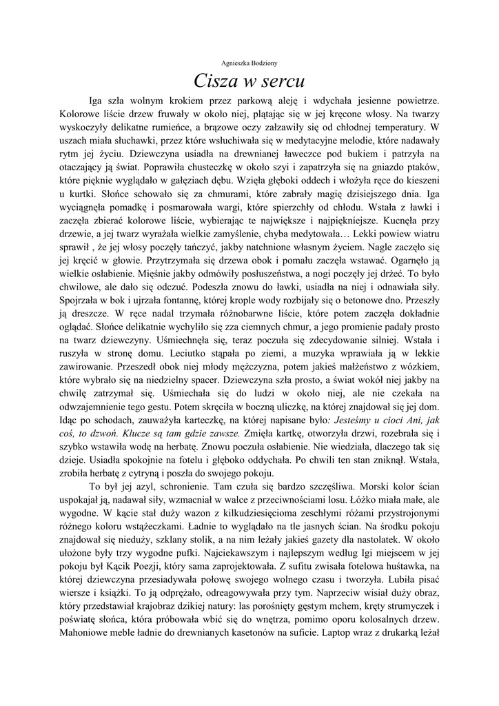 Agnieszka Bodziony Cisza w sercu Iga szła wolnym krokiem przez parkową aleję i wdychała jesienne powietrze. Kolorowe liście drzew fruwały w około niej, plątając się w jej kręcone włosy. Na twarzy wyskoczyły delikatne rumieńce, a brązowe oczy załzawiły się od chłodnej temperatury. W uszach miała słuchawki, przez które wsłuchiwała się w medytacyjne melodie, które nadawały rytm jej życiu. Dziewczyna usiadła na drewnianej ławeczce pod bukiem i patrzyła na otaczający ją świat. Poprawiła chusteczkę w około szyi i zapatrzyła się na gniazdo ptaków, które pięknie wyglądało w gałęziach dębu. Wzięła głęboki oddech i włożyła ręce do kieszeni u kurtki. Słońce schowało się za chmurami, które zabrały magię dzisiejszego dnia. Iga wyciągnęła pomadkę i posmarowała wargi, które spierzchły od chłodu. Wstała z ławki i zaczęła zbierać kolorowe liście, wybierając te największe i najpiękniejsze. Kucnęła przy drzewie, a jej twarz wyrażała wielkie zamyślenie, chyba medytowała… Lekki powiew wiatru sprawił , że jej włosy poczęły tańczyć, jakby natchnione własnym życiem. Nagle zaczęło się jej kręcić w głowie. Przytrzymała się drzewa obok i pomału zaczęła wstawać. Ogarnęło ją wielkie osłabienie. Mięśnie jakby odmówiły posłuszeństwa, a nogi poczęły jej drżeć. To było chwilowe, ale dało się odczuć. Podeszła znowu do ławki, usiadła na niej i odnawiała siły. Spojrzała w bok i ujrzała fontannę, której krople wody rozbijały się o betonowe dno. Przeszły ją dreszcze. W ręce nadal trzymała różnobarwne liście, które potem zaczęła dokładnie oglądać. Słońce delikatnie wychyliło się zza ciemnych chmur, a jego promienie padały prosto na twarz dziewczyny. Uśmiechnęła się, teraz poczuła się zdecydowanie silniej. Wstała i ruszyła w stronę domu. Leciutko stąpała po ziemi, a muzyka wprawiała ją w lekkie zawirowanie. Przeszedł obok niej młody mężczyzna, potem jakieś małżeństwo z wózkiem, które wybrało się na niedzielny spacer. Dziewczyna szła prosto, a świat wokół niej jakby na chwilę zatrzymał się. Uśmiechała się do ludzi w około niej, ale nie czekała na odwzajemnienie tego gestu. Potem skręciła w boczną uliczkę, na której znajdował się jej dom. Idąc po schodach, zauważyła karteczkę, na której napisane było: Jesteśmy u cioci Ani, jak coś, to dzwoń. Klucze są tam gdzie zawsze. Zmięła kartkę, otworzyła drzwi, rozebrała się i szybko wstawiła wodę na herbatę. Znowu poczuła osłabienie. Nie wiedziała, dlaczego tak się dzieje. Usiadła spokojnie na fotelu i głęboko oddychała. Po chwili ten stan zniknął. Wstała, zrobiła herbatę z cytryną i poszła do swojego pokoju. To był jej azyl, schronienie. Tam czuła się bardzo szczęśliwa. Morski kolor ścian uspokajał ją, nadawał siły, wzmacniał w walce z przeciwnościami losu. Łóżko miała małe, ale wygodne. W kącie stał duży wazon z kilkudziesięcioma zeschłymi różami przystrojonymi różnego koloru wstążeczkami. Ładnie to wyglądało na tle jasnych ścian. Na środku pokoju znajdował się nieduży, szklany stolik, a na nim leżały jakieś gazety dla nastolatek. W około ułożone były trzy wygodne pufki. Najciekawszym i najlepszym według Igi miejscem w jej pokoju był Kącik Poezji, który sama zaprojektowała. Z sufitu zwisała fotelowa huśtawka, na której dziewczyna przesiadywała połowę swojego wolnego czasu i tworzyła. Lubiła pisać wiersze i książki. To ją odprężało, odreagowywała przy tym. Naprzeciw wisiał duży obraz, który przedstawiał krajobraz dzikiej natury: las porośnięty gęstym mchem, kręty strumyczek i poświatę słońca, która próbowała wbić się do wnętrza, pomimo oporu kolosalnych drzew. Mahoniowe meble ładnie do drewnianych kasetonów na suficie. Laptop wraz z drukarką leżał na biurku obok olbrzymiego lustra na pół ściany. Iga kochała tańczyć. Jej kręcenia bioderkami były niepowtarzalne, fascynujące. Drugą połowę swojego wolnego czasu poświęcała właśnie tańcu. W przyszłości chciałaby wykonywać „belly dance”. Muzyka – to dla niej najbardziej uzależniający narkotyk. Przy tym żadne leczenia, odtrutki nie pomagały. To właśnie muzyka była odtrutka na cały ból tego świata. Pozwalała jej odpłynąć… frunąć po niebie, nie bać się tego, co się miało wydarzyć. I jak baletnica wirowała wśród obłoków, mając uśmiech na twarzy. Odlatywała z ptakami, biegła z wiatrem, tańczyła z marzeniami… i już nic nie było w stanie tego przerwać. Zamykała oczy, ale widziała przez nie dużo więcej – raj, jej królestwo, jej świat. Iga była niezwykłą nastolatką. Potrafiła znaleźć piękno w zwykłych rzeczach. Świat był dla niej tajemnicą, wielką niewiadomą. Uwielbiała smakować nowych wyzwań, przygód. Często wpadała w stany zamyślenia, wywołane nowymi odkryciami lub chodziła z wisielczym humorem. Do szczęścia potrzebna była jej kartka i jakieś pióro. Wyniki w szkole miała wysokie, choć nie przesiadywała nad książkami. Jej grono koleżanek wynosiło pięć dziewczyn, które zawsze sobie pomagały, bez względu na konsekwencje. Iga wcale nie była fanką telewizji. Nie interesowały ją jakiś love story, w których zawsze był happy end. To nie trafiało w jej gusta. Dziewczyna wyrastała na mądrego filozofa. Jej głębokie patrzenie na wszystko w około wyróżniało ją z tłumu. Była raczej poukładana, choć czasem wybuchała jak wulkan. Miła, sympatyczna, odpowiedzialna, kulturalna, a przede wszystkim szczera. Wiedziała, że kłamstwo do niczego dobrego nie prowadzi, a jedynie może tylko pogorszyć daną sytuację. Zawsze miała odwagę przyznać się do popełnionego błędu. Wpatrywała się w głąb siebie samej, wyszukując wad i podejmując się próby zmiany na lepsze. Żałowała błędów, które popełniła, gdy by