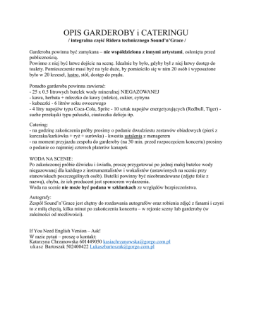 OPIS GARDEROBY i CATERINGU / integralna część Ridera technicznego Sound’n’Grace / Garderoba powinna być zamykana – nie współdzielona z innymi artystami, osłonięta przed publicznością. Powinno z niej być łatwe dojście na scenę. Idealnie by było, gdyby był z niej łatwy dostęp do toalety. Pomieszczenie musi być na tyle duże, by pomieściło się w nim 20 osób i wyposażone było w 20 krzeseł, lustro, stół, dostęp do prądu. Ponadto garderoba powinna zawierać: - 25 x 0.5 litrowych butelek wody mineralnej NIEGAZOWANEJ - kawa, herbata + mleczko do kawy (mleko), cukier, cytryna - kubeczki - 6 litrów soku owocowego - 4 litry napojów typu Coca-Cola, Sprite - 10 sztuk napojów energetyzujących (Redbull, Tiger) suche przekąski typu paluszki, ciasteczka delicja itp. Catering: - na godzinę zakończenia próby prosimy o podanie dwudziestu zestawów obiadowych (pierś z kurczaka/karkówka + ryż + surówka) - kwestia ustalenia z menagerem - na moment przyjazdu zespołu do garderoby (na 30 min. przed rozpoczęciem koncertu) prosimy o podanie co najmniej czterech platerów kanapek WODA NA SCENIE: Po zakończonej próbie dźwieku i światła, proszę przygotować po jednej małej butelce wody niegazowanej dla każdego z instrumentalistów i wokalistów (ustawionych na scenie przy stanowiskach poszczególnych osób). Butelki powinny być nieobrandowane (zdjęte folie z nazwą), chyba, że ich producent jest sponsorem wydarzenia. Woda na scenie nie może być podana w szklankach ze względów bezpieczeństwa. Autografy: Zespół Sound’n’Grace jest chętny do rozdawania autografów oraz robienia zdjęć z fanami i czyni to z miłą chęcią, kilka minut po zakończeniu koncertu – w rejonie sceny lub garderoby (w zależności od możliwości). If You Need English Version – Ask! W razie pytań – proszę o kontakt: Katarzyna Chrzanowska 601449050 [email protected] u kasz Bartoszak 502400422 [email protected]