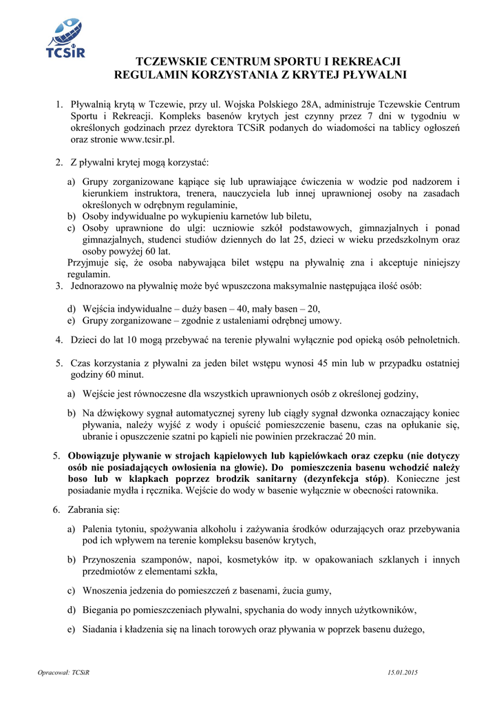 TCZEWSKIE CENTRUM SPORTU I REKREACJI REGULAMIN KORZYSTANIA Z KRYTEJ PŁYWALNI 1. Pływalnią krytą w Tczewie, przy ul. Wojska Polskiego 28A, administruje Tczewskie Centrum Sportu i Rekreacji. Kompleks basenów krytych jest czynny przez 7 dni w tygodniu w określonych godzinach przez dyrektora TCSiR podanych do wiadomości na tablicy ogłoszeń oraz stronie www.tcsir.pl. 2. Z pływalni krytej mogą korzystać: a) Grupy zorganizowane kąpiące się lub uprawiające ćwiczenia w wodzie pod nadzorem i kierunkiem instruktora, trenera, nauczyciela lub innej uprawnionej osoby na zasadach określonych w odrębnym regulaminie, b) Osoby indywidualne po wykupieniu karnetów lub biletu, c) Osoby uprawnione do ulgi: uczniowie szkół podstawowych, gimnazjalnych i ponad gimnazjalnych, studenci studiów dziennych do lat 25, dzieci w wieku przedszkolnym oraz osoby powyżej 60 lat. Przyjmuje się, że osoba nabywająca bilet wstępu na pływalnię zna i akceptuje niniejszy regulamin. 3. Jednorazowo na pływalnię może być wpuszczona maksymalnie następująca ilość osób: d) Wejścia indywidualne – duży basen – 40, mały basen – 20, e) Grupy zorganizowane – zgodnie z ustaleniami odrębnej umowy. 4. Dzieci do lat 10 mogą przebywać na terenie pływalni wyłącznie pod opieką osób pełnoletnich. 5. Czas korzystania z pływalni za jeden bilet wstępu wynosi 45 min lub w przypadku ostatniej godziny 60 minut. a) Wejście jest równoczesne dla wszystkich uprawnionych osób z określonej godziny, b) Na dźwiękowy sygnał automatycznej syreny lub ciągły sygnał dzwonka oznaczający koniec pływania, należy wyjść z wody i opuścić pomieszczenie basenu, czas na opłukanie się, ubranie i opuszczenie szatni po kąpieli nie powinien przekraczać 20 min. 5. Obowiązuje pływanie w strojach kąpielowych lub kąpielówkach oraz czepku (nie dotyczy osób nie posiadających owłosienia na głowie). Do pomieszczenia basenu wchodzić należy boso lub w klapkach poprzez brodzik sanitarny (dezynfekcja stóp). Konieczne jest posiadanie mydła i ręcznika. Wejście do wody w basenie wyłącznie w obecności ratownika. 6. Zabrania się: a) Palenia tytoniu, spożywania alkoholu i zażywania środków odurzających oraz przebywania pod ich wpływem na terenie kompleksu basenów krytych, b) Przynoszenia szamponów, napoi, kosmetyków itp. w opakowaniach szklanych i innych przedmiotów z elementami szkła, c) Wnoszenia jedzenia do pomieszczeń z basenami, żucia gumy, d) Biegania po pomieszczeniach pływalni, spychania do wody innych użytkowników, e) Siadania i kładzenia się na linach torowych oraz pływania w poprzek basenu dużego, Opracował: TCSiR 15.01.2015 TCZEWSKIE CENTRUM SPORTU I REKREACJI REGULAMIN KORZYSTANIA Z KRYTEJ PŁYWALNI f) Skakania do wody z innych miejsc niż słupki startowe (skoki wyłącznie bez rozbiegu i robienia salt), g) Stwarzania innych sytuacji zagrażających bezpieczeństwu swojemu i innych osób, h) Fotografowania i filmowania bez zezwolenia. 7. Przed wejściem do basenu należy dokładnie umyć mydłem całe ciało /nago/ i opłukać stopy płynem dezynfekującym znajdującym się w nieckach sanitarnych między prysznicami a pływalnią . Po wyjściu z basenu zaleca się opłukać ciało ciepłą wodą celem zmycia resztek chloru. 8. Uczestnicy grup zorganizowanych wchodzą do przebieralni, pod prysznice i na basen pod nadzorem opiekuna grupy. Klucz do szatni pobiera i zdaje opiekun grupy. 9. Za bezpieczeństwo wszystkich osób pływających (będących w wodzie) odpowiada ratownik pełniący dyżur. Ratownik odpowiada też za bezpieczeństwo użytkowników indywidualnych oraz sprawuje ogólny nadzór nad osobami przebywającymi w pomieszczeniach basenowych. Ratownik pełni dyżur ubrany w koszulkę oznaczoną elementami WOPR z napisem ratownik. 10. Z kąpieli nie mogą korzystać osoby chore, stwarzające niebezpieczeństwo utonięcia /padaczka/ lub stanowiące zagrożenia dla innych /np. osoby posiadające rany, choroby skóry, choroby zakaźne/. 11. Osoby korzystające z pływalni są zobowiązane do zmiany obuwia w holu głównym obiektu na obuwie typu basenowego. 12. Osoby indywidualne przebierając się w szatniach wskazanych przez obsługę pływalni pozostawiając ubrania i inne przedmioty (za wyjątkiem rzeczy wartościowych) w szafkach indywidualnych zamykanych na kluczyk. 13. Przedmioty wartościowe oraz pieniądze można złożyć do szafek depozytowych po wpłaceniu kaucji w wysokości 5zł u obsługi pływalni. 14. Za wszelkie szkody wynikłe z winy użytkowników odpowiada materialnie najemca godziny na basenie lub osoba winna (przy wejściach indywidualnych). 15. Na kompleksie basenów prowadzony jest całodobowy monitoring wizyjny. 16. Zabrania się prowadzenia jakiejkolwiek działalności gospodarczej, nauk pływania oraz innych czynności zarobkowych na terenie TCSiR bez zgody Dyrektora. 17. Ratownicy i personel obsługi pełniący dyżur na pływalni sprawują nadzór nad przestrzeganiem niniejszego regulaminu. Wszystkie osoby przebywające na terenie pływalni zobowiązane są podporządkować się ich nakazom. Osoby naruszające porządek publiczny lub przepisy niniejszego regulaminu będą usuwane z terenu pływalni. 18. Kwestie sporne związane z korzystaniem z pływalni rozstrzyga dyrektor TCSiR lub kierownik obiektu. Dyrektor TCSiR Opracował: TCSiR 15.01.2015