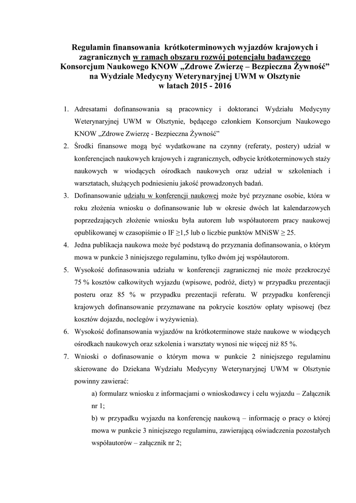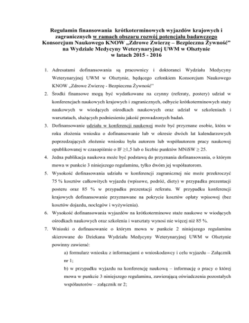 Regulamin finansowania krótkoterminowych wyjazdów krajowych i zagranicznych w ramach obszaru rozwój potencjału badawczego Konsorcjum Naukowego KNOW „Zdrowe Zwierzę – Bezpieczna Żywność” na Wydziale Medycyny Weterynaryjnej UWM w Olsztynie w latach 2015 - 2016 1. Adresatami dofinansowania są pracownicy i doktoranci Wydziału Medycyny Weterynaryjnej UWM w Olsztynie, będącego członkiem Konsorcjum Naukowego KNOW „Zdrowe Zwierzę - Bezpieczna Żywność” 2. Środki finansowe mogą być wydatkowane na czynny (referaty, postery) udział w konferencjach naukowych krajowych i zagranicznych, odbycie krótkoterminowych staży naukowych w wiodących ośrodkach naukowych oraz udział w szkoleniach i warsztatach, służących podniesieniu jakość prowadzonych badań. 3. Dofinansowanie udziału w konferencji naukowej może być przyznane osobie, która w roku złożenia wniosku o dofinansowanie lub w okresie dwóch lat kalendarzowych poprzedzających złożenie wniosku była autorem lub współautorem pracy naukowej opublikowanej w czasopiśmie o IF ≥1,5 lub o liczbie punktów MNiSW ≥ 25. 4. Jedna publikacja naukowa może być podstawą do przyznania dofinansowania, o którym mowa w punkcie 3 niniejszego regulaminu, tylko dwóm jej współautorom. 5. Wysokość dofinasowania udziału w konferencji zagranicznej nie może przekroczyć 75 % kosztów całkowitych wyjazdu (wpisowe, podróż, diety) w przypadku prezentacji posteru oraz 85 % w przypadku prezentacji referatu. W przypadku konferencji krajowych dofinansowanie przyznawane na pokrycie kosztów opłaty wpisowej (bez kosztów dojazdu, noclegów i wyżywienia). 6. Wysokość dofinansowania wyjazdów na krótkoterminowe staże naukowe w wiodących ośrodkach naukowych oraz szkolenia i warsztaty wynosi nie więcej niż 85 %. 7. Wnioski o dofinasowanie o którym mowa w punkcie 2 niniejszego regulaminu skierowane do Dziekana Wydziału Medycyny Weterynaryjnej UWM w Olsztynie powinny zawierać: a) formularz wniosku z informacjami o wnioskodawcy i celu wyjazdu – Załącznik nr 1; b) w przypadku wyjazdu na konferencję naukową – informację o pracy o której mowa w punkcie 3 niniejszego regulaminu, zawierającą oświadczenia pozostałych współautorów – załącznik nr 2; c) listę 10 najlepszych prac wnioskodawcy opublikowanych w trakcie ostatnich 5 lat d) informację o wpływie dofinansowania wyjazdu na jakość prowadzonych badań naukowych (max 1 strona A4); e) załączniki w postaci zaproszenia do udziału w konferencji, stażu naukowym itp. 8. Wnioski o których mowa w punkcie 7 przyjmowane są w sposób ciągły w Biurze KNOW „Zdrowe Zwierzę – Bezpieczna Żywność„ Wydziału Medycyny Weterynaryjnej UWM w Olsztynie, mającym swoją siedzibę w Dziekanacie Wydziału. 9. Wnioski są rozpatrywane dofinansowania na jakość w trybie konkursowym, prowadzonych badań uwzględniającym naukowych oraz wpływ dorobek wnioskodawcy. W przypadku zbliżonej oceny merytorycznej wniosków pierwszeństwo będą miały osoby, które dotychczas nie korzystały z dofinansowania o którym mowa w punkcie 2 niniejszego regulaminu. 10. Ocenę wniosków przeprowadza Rada Naukowa KNOW „Zdrowe Zwierzę – Bezpieczna Żywność” Wydziału Medycyny Weterynaryjnej UMW w Olsztynie. 11. Ocena wniosków odbywa się kwartalnie. Jej wyniki będą ogłaszane do 10 października 2015 roku w przypadku wniosków złożonych w III kwartale 2015 roku, do 10 stycznia 2016 w przypadku wniosków złożonych w IV kwartale 2015 roku, do 10 kwietnia 2016 w przypadku wniosków złożonych w I kwartale 2016, do 10 lipca 2016 w przypadku wniosków złożonych w II kwartale 2016, do 10 października 2016 roku w przypadku wniosków złożonych w III kwartale 2016 roku, do 10 stycznia 2017 roku w przypadku wniosków złożonych w IV kwartale 2016 roku. 12. W szczególnie uzasadnionych przypadkach wniosek może być rozpatrzony przez komisję indywidualnie, w trybie nadzwyczajnym. 13. Decyzję o przyznaniu dofinansowania podejmuje Dziekan w oparciu w rekomendację komisji. Decyzja jest ostateczna i nie przysługuje od niej odwołanie. 14.Sposobem rozliczenia dofinansowania jest sprawozdanie merytoryczne i finansowe wnioskodawcy z wyjazdu, które należy złożyć w ciągu 30 dni od dnia jego zakończenia w Biurze KNOW „Zdrowe Zwierzę – Bezpieczna Żywność” Wydziału Medycyny Weterynaryjnej UWM w Olsztynie. W przypadku konferencji sprawozdanie musi zawierać załączniki dokumentujące formę (referat, poster) prezentacji wyników badań (program, kopie streszczenia, itp.). 15.Na zakończenie każdego roku rozliczeniowego (do 31 stycznia roku następnego) Biuro KNOW Wydziału Medycyny Weterynaryjnej UWM w Olsztynie przekazuje do Centralnego Biura KNOW sprawozdania merytoryczne i finansowe z wykorzystania środków na dofinansowanie krótkoterminowych wyjazdów krajowych i zagranicznych w ramach obszaru rozwój potencjału badawczego. 16.Wszystkie dzieła (rozprawy doktorskie, publikacje, patenty, itd.) zrealizowane ze środków dotacji KNOW Konsorcjum Naukowego "Zdrowe Zwierzę - Bezpieczna Żywność" muszą zawierać informację o źródle finansowania (Sfinansowano ze środków dotacji KNOW Konsorcjum "Zdrowe Zwierzę - Bezpieczna Żywność", Ministerstwo Nauki i Szkolnictwa Wyższego decyzja nr 05-1/KNOW2/2015). Prof. dr hab. Andrzej Koncicki Dziekan Wydziału Medycyny Weterynaryjnej Olsztyn, 27.07.2015r. Załącznik 1 Dziekan Wydziału Medycyny Weterynaryjnej Uniwersytetu Warmińsko-Mazurskiego w Olsztynie Wniosek o finasowanie krótkoterminowego wyjazdu krajowego lub zagranicznego w ramach obszaru rozwój potencjału badawczego Konsorcjum Naukowego KNOW „Zdrowe Zwierzę – Bezpieczna Żywność” Imię i nazwisko Wnioskodawcy Miejsce pracy i stanowisko Wnioskodawcy Cel wyjazdu (właściwe - udział w konferencji krajowej podkreślić) - udział w konferencji zagranicznej - staż naukowy - udział w warsztatach lub szkoleniu W przypadku ko