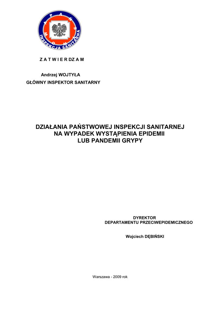 Z A T W I E R DZ A M Andrzej WOJTYŁA GŁÓWNY INSPEKTOR SANITARNY DZIAŁANIA PAŃSTWOWEJ INSPEKCJI SANITARNEJ NA WYPADEK WYSTĄPIENIA EPIDEMII LUB PANDEMII GRYPY DYREKTOR DEPARTAMENTU PRZECIWEPIDEMICZNEGO Wojciech DĘBIŃSKI Warszawa - 2009 rok I. Grypa i nadzór nad nią Grypa (influenza) - choroba wirusowa wywołana przez RNA - Myxovirusy (Typy A, B, C, liczne podtypy), jest jednym z najpoważniejszych problemów zdrowotnych świata z uwagi na: • szerzenie się drogą kropelkową, • ogromną zmienność wirusów w wyniku ich zmian antygenowych, co powoduje brak trwałej odporności u człowieka po przechorowaniu oraz skutkuje koniecznością corocznego opracowywania szczepionki przeciwko nowopojawiającym się szczepom, • możliwość przełamania bariery gatunkowej przez szczepy wirusa, które dotychczas występowały wyłącznie u zwierząt i nie istniało ryzyko przeniesienia ich na człowieka lub było ono bardzo niskie. Powyższe właściwości powodują wystąpienie corocznych epidemii o różnej skali, a co kilkanaście – kilkadziesiąt lat zmiany antygenowe prowadzące do uzjadliwiania wirusa mogą powodować pandemię z wysoką śmiertelnością. Nie można wykluczyć, że w najbliższym czasie może dojść do takiej pandemii, wywołanej nowym wirusem powstałym z „wymieszania” się wirusów ludzkich i zwierzęcych. Światowa Organizacja Zdrowia (WHO) opracowała w 1999 roku plan działań na wypadek pandemii grypy (Influenza Pandemic Prepardness Plan), który jest stale aktualizowany, oraz poleciła sporządzenie planów krajowych. Biorąc to pod uwagę, zarządzeniem Ministra Zdrowia z dnia 25.03.2005 r., powołano Krajowy Komitet do Spraw Pandemii Grypy, w którego składzie znaleźli się przedstawiciele szeregu ministerstw i instytucji, zaangażowanych w realizację zadań związanych z ochroną ludności przed skutkami pandemii grypy. Zadaniem Krajowego Komitetu ds. Pandemii Grypy jest w szczególności: • monitorowanie światowej i krajowej sytuacji epidemicznej grypy, zarówno w okresie międzypandemicznym, jak i w sytuacji pandemii grypy - we współpracy z organizacjami międzynarodowymi i Narodowym Instytutem Zdrowia Publicznego Państwowym Zakładem Higieny (Krajowym Ośrodkiem ds. Grypy); • opracowywanie standardów i procedur dla podejmowanych działań profilaktycznych, diagnostycznych, leczniczych i organizacyjnych; • koordynowanie działań w razie zagrożenia pandemią i po jej wystąpieniu w tym: dokonywanie oceny zagrożenia, określanie zadań dla poszczególnych jednostek i służb oraz zakresu ich odpowiedzialności, przy maksymalnym wykorzystaniu istniejących struktur działających w sytuacjach kryzysowych; spełnianie roli krajowego centrum konsultacyjnego i decyzyjnego odnośnie wszystkich zagadnień związanych z grypą. 2 Komitet opracował, zgodnie z wymogami WHO, Polski Plan Pandemiczny, na wypadek wystąpienia pandemii grypy, który zatwierdzony został przez Ministra Zdrowia. Dokument ten jest narzędziem, które określa działania niezbędne do przygotowania kraju na wystąpienie kolejnej pandemii grypy, jak również działania w okresie międzypandemicznym, alarmu pandemicznego, pandemii i okresu postpandemicznego i będzie modyfikowany zgodnie z postępem wiedzy oraz zaleceniami WHO i Komisji Europejskiej. Sytuacja epidemiologiczna w Polsce w ostatnich latach była stabilna, nie występowała transmisja na człowieka zjadliwych wirusów odzwierzęcych (np. H5N1). Dane dotyczące zachorowań na grypę publikowane są i dostępne na stronach internetowych Narodowego Instytutu Zdrowia Publicznego – PZH. Państwowa Inspekcja Sanitarna w ramach swoich kompetencji przewidzianych w ustawie z dnia 5 grudnia 2008 r. o zapobieganiu oraz zwalczaniu zakażeń oraz chorób zakaźnych u ludzi (Dz. U. Nr 234, poz. 1570) oraz ustawie z dnia 14 marca 1985 r. o Państwowej Inspekcji Sanitarnej (Dz. U. z 2006 r., Nr 122, poz. 851 z późn. zm.) sprawuje nadzór epidemiologiczny nad zachorowaniami na choroby zakaźne, w tym nad grypą. Zgłoszenia przypadków zachorowań na grypę przesyłane są przez zakłady opieki zdrowotnej lub lekarzy prowadzących indywidualne praktyki lekarskie w postaci raportów zbiorczych obejmujących określony okres sprawozdawczy. Państwowy powiatowy inspektor sanitarny sporządza zbiorcze raporty dla terenu powiatu objętego nadzorem, zawierające dane liczbowe o wystąpieniu zachorowań na grypę i przekazuje je właściwemu wojewódzkiemu inspektorowi sanitarnemu. Zestawienia zbiorcze z obszaru województwa przekazywane są przez państwowych wojewódzkich inspektorów sanitarnych do Narodowego Instytutu Zdrowia Publicznego - Państwowego Zakładu Higieny, który na zlecenie Głównego Inspektora Sanitarnego wykonuje analizy na poziomie krajowym. Jednocześnie, obok prowadzonego, opisanego powyżej nadzoru rutynowego, opartego na klinicznej klasyfikacji przypadków, sprawowany jest nadzór oparty na wynikach badań laboratoryjnych zbieranych w systemie SENTINEL. Ten rodzaj nadzoru polega na wytypowaniu części jednostek ochrony zdrowia (szpitali, poradni, gabinetów lekarskich), w których dokonywane jest, oprócz rejestracji przypadków, także pobieranie od chorych materiału do badań wirusologicznych (wymazy z gardła i nosa). Nadzór laboratoryjny pozwala uzyskać informacje o typach szczepów wywołujących zachorowania. W przypadku zachorowań spowodowanych wystąpieniem wysoce zjadliwym, posiadającym wysoki potencjał pandemiczny szczepem wirusa grypy, wprowadzony może być szczególny system nadzoru i postępowania, wykorzystujący dostosowaną do sytuacji definicję przypadku. 3 II. Profilaktyka i leczenie Od 1994 r. w Programie Szczepień Ochronnych wprowadzono, jako zalecane, szczepienie przeciwko grypie. Oznacza to, iż szczepienie przeciwko grypie nie jest finansowane z budżetu Państwa w części Ministra Zdrowia. Szczepienie przeciwko grypie jest zalecane osobom ze wskazań kliniczn