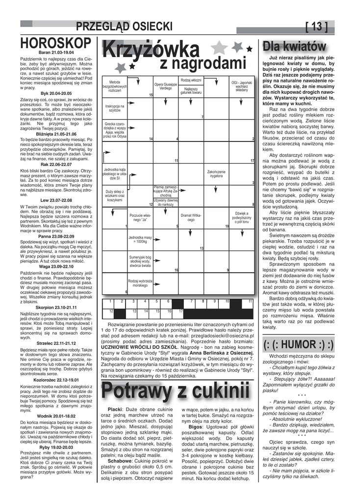PRZEGLĄD OSIECKI HOROSKOP Baran 21.03-19.04 Październik to najlepszy czas dla Ciebie, żeby być aktywniejszym. Można pochodzić po górach, jeździć na rowerze, a nawet szukać grzybów w lesie. Koniecznie częściej się uśmiechać! Pod koniec miesiąca spodziewaj się zmian w pracy. Byk 20.04-20.05 Zdarzy się coś, co sprawi, że wrócisz do przeszłości. To może być nieoczekiwane spotkanie, albo znalezienie jakiś dokumentów, bądź rozmowa, która odkryje dawne fakty. A w pracy nowe koleżanki. Nie przyjmuj tego jako zagrożenia Twojej pozycji. Bliźnięta 21.05-21.06 To będzie bardzo pracowity miesiąc. Po nieco spokojniejszym okresie lata, teraz przybędzie obowiązków. Pamiętaj, by nie brać na siebie cudzych zadań. Uważaj na finanse, nie szalej z zakupami. Rak 22.06-22.07 Ktoś bliski bardzo Cię zaskoczy. Otrzymasz prezent, o którym zawsze marzyłaś. Za to pod koniec miesiąca dotrze wiadomość, która zmieni Twoje plany na najbliższe miesiące. Skontroluj zdrowie. Lew 23.07-22.08 W Twoim związku powiało trochę chłodem. Nie obrażaj się i nie poddawaj. Najlepsza będzie szczera rozmowa z partnerem. Skontaktuj się też z pewnym Wodnikiem. Ma dla Ciebie ważne informacje w sprawie pracy. Panna 23.08-22.09 Spodziewaj się wizyt, spotkań i wieści z daleka. Na początku mogą Cię męczyć, ale przywykniesz, a nawet polubisz je. W pracy pojawi się szansa na większe pieniądze. A tuż obok nowa miłość. Waga 23.09-22.10 Październik nie będzie najlepszy jeśli chodzi o finanse. Prawdopodobnie będziesz musiała mocniej zacisnąć pasa. W drugiej połowie miesiąca możesz oczekiwać ciekawej propozycji zawodowej. Wszelkie zmiany konsultuj jednak z bliskimi. Skorpion 23.10-21.11 Najbliższe tygodnie nie są najlepszymi, jeśli chodzi o prowadzenie wielkich interesów. Ktoś może Tobą manipulować i sprawi, że poniesiesz straty. Lepiej skoncentruj się na sprawach domowych. Strzelec 22.11-21.12 Będziesz miała ręce pełne roboty. Także w dosłownym tego słowa znaczeniu. Nie ominie Cię praca w ogrodzie, remonty w domu lub robienie zapraw. Ale oszczędzaj się trochę. Dobrze gdybyś skontrolowała serce. Koziorożec 22.12-19.01 Koniecznie trzeba nadrobić zaległości z pracy. Jeśli tego nie zrobisz dojdzie do nieporozumień. W domu ktoś potrzebuje Twojej pomocy. Spodziewaj się też miłego spotkania z dawnymi znajomymi. Wodnik 20.01-18.02 Do końca miesiąca będziesz w doskonałym nastroju. Pojawią się okazje do spotkań i zawierania nowych znajomości. Uważaj na październikowe chłody i cieplej się ubieraj. Finanse będę lepsze. Ryby 19.02-20.03 Przeżyjesz miłe chwile z partnerem. Jeśli jesteś singielką nie szukaj daleko. Ktoś dobrze Ci znany czeka na Twój znak. Spróbuj go ośmielić. W połowie miesiąca przypływ gotówki. Może wygrana? [ 13 ] KrzyŜówka z nagrodami Metoda bezgotówkowych rozliczeń 15 Opera Giuseppe Verdiego Rodzaj włóczni OGI - Japoński wachlarz składany Najlepszy gatunek towaru Inskrypcja na szyldzie 7 Grecka czarodziejka z wyspy Ajaja, więziła przez rok Odysa 14 4 2 11 17 Jednostka kąta płaskiego w układzie SI Zakończenie irygatora 1 Poczucie własnego “Ja” 5 8 Dramat Witkacego Jednostka masy = 1000kg 12 6 10 Dźwięk a podwyŜszony o pół tonu 13 Sumeryjski bóg słodkiej wody, stwórca świata 2 3 Plemię zamieszkujące Afrykę Zachodnią UŜywany dawniej 12 do narkozy DuŜy sklep z wózkami oraz koszykami 1 Dla kwiatów 16 9 Rodzaj wybrzeŜa morskiego 3 4 5 6 13 14 15 16 7 8 9 10 11 17 Rozwiązanie powstanie po przeniesieniu liter oznaczonych cyframi od 1 do 17 do odpowiednich kratek poniżej. Prawidłowe hasło należy przesłać pod adresem redakcji lub na e-mail: [email protected] (prosimy podać adres zamieszkania). Poprzednie hasło brzmiało: UCZNIOWIE WRÓCILI DO SZKÓŁ. Nagrodę - bon na zabieg kosmetyczny w Gabinecie Urody "Styl" wygrała Anna Berlinska z Osiecznej. Nagroda do odbioru w Urzędzie Miasta i Gminy w Osiecznej, pokój nr 7. Zachęcamy do przesyłania rozwiązań krzyżówek, w tym miesiącu do wygrania bon upominkowy - również do realizacji w Gabinecie Urody "Styl". Na rozwiązania czekamy do 15 października. Potrawy z cukinii Placki: Duże obrane cukinie oraz jedną marchew utrzeć na tarce o średnich oczkach. Dodać jedno jajko. Mieszać, dosypując stopniowo jedną szklankę mąki. Do ciasta dodać sól, pieprz, pietruszkę, można tymianek, bazylię. Smażyć z obu stron na rozgrzanej patelni; na oleju bądź maśle. Schabowe: Cukinię pokroić w plastry o grubości około 0,5 cm. Delikatnie z obu stron posypać solą i pieprzem. Obtoczyć najpierw w mące, potem w jajku, a na końcu w tartej bułce. Smażyć na rozgrzanym oleju na złoty kolor. Bigos: Ugotować pół główki poszatkowanej kapusty. Odlać większość wody. Do kapusty dodać utartą marchew, pietruszkę, seler, dwie pokrojone papryki oraz 3-4 pokrojone w kostkę kiełbasy. Posolić, popieprzyć. Dołożyć dwie obrane i pokrojone cukinie bez pestek. Gotować jeszcze około 15 minut. Na końcu dodać ketchup. Już nieraz pisaliśmy jak pielęgnować kwiaty w domu, by bujnie rosły i pięknie wyglądały. Dziś raz jeszcze podajemy przepisy na naturalne nawożenie roślin. Okazuje się, że nie musimy dla nich kupować drogich nawozów. Wystarczy wykorzystać te, które mamy w kuchni. Raz na dwa tygodnie dobrze jest podlać rośliny mlekiem rozcieńczonym wodą. Zielone liście kwiatów nabiorą soczystej barwy. Warto też duże liście, na przykład fikusów, przecierać od czasu do czasu ściereczką nawilżoną mlekiem. Aby dostarczyć roślinom wapnia można podlewać je wodą z skorupkami jaj. Skorupki dobrze rozgnieść, wsypać do butelki z wodą i odstawić na jakiś czas. Potem po prostu podlewać. Jeśli nie chcemy “bawić się" w rozgniatanie skorupek, podlejmy kwiaty wodą od gotowania jajek. Oczywiście wystudzoną. Aby liście pięknie błyszczały wystarczy raz na jakiś c