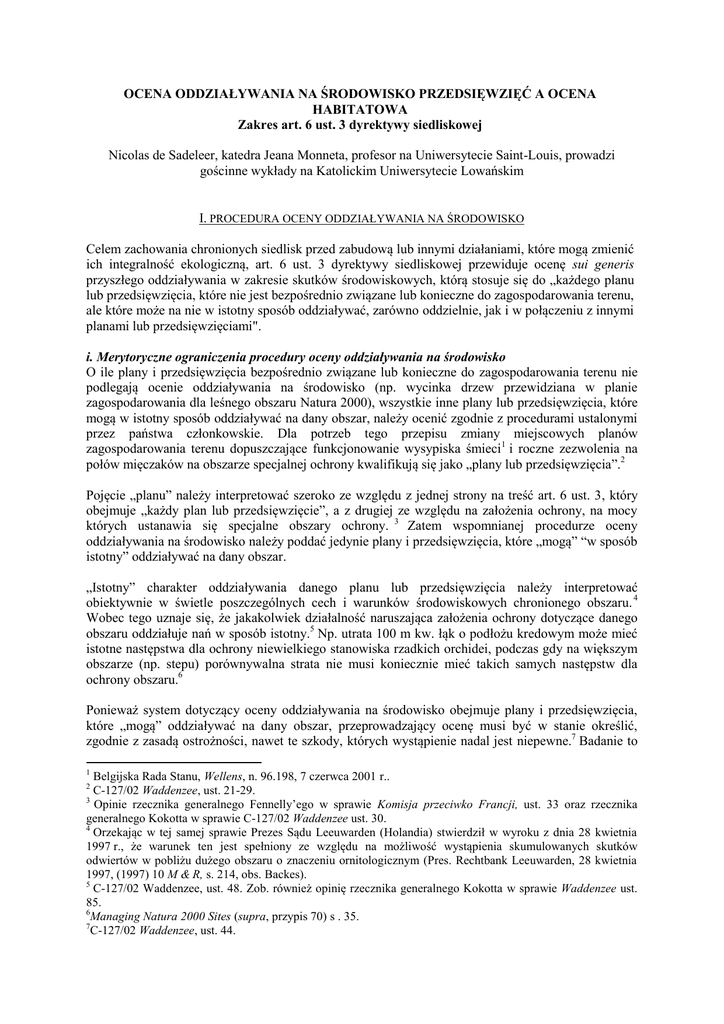 OCENA ODDZIAŁYWANIA NA ŚRODOWISKO PRZEDSIĘWZIĘĆ A OCENA HABITATOWA Zakres art. 6 ust. 3 dyrektywy siedliskowej Nicolas de Sadeleer, katedra Jeana Monneta, profesor na Uniwersytecie Saint-Louis, prowadzi gościnne wykłady na Katolickim Uniwersytecie Lowańskim I. PROCEDURA OCENY ODDZIAŁYWANIA NA ŚRODOWISKO Celem zachowania chronionych siedlisk przed zabudową lub innymi działaniami, które mogą zmienić ich integralność ekologiczną, art. 6 ust. 3 dyrektywy siedliskowej przewiduje ocenę sui generis przyszłego oddziaływania w zakresie skutków środowiskowych, którą stosuje się do „każdego planu lub przedsięwzięcia, które nie jest bezpośrednio związane lub konieczne do zagospodarowania terenu, ale które może na nie w istotny sposób oddziaływać, zarówno oddzielnie, jak i w połączeniu z innymi planami lub przedsięwzięciami". i. Merytoryczne ograniczenia procedury oceny oddziaływania na środowisko O ile plany i przedsięwzięcia bezpośrednio związane lub konieczne do zagospodarowania terenu nie podlegają ocenie oddziaływania na środowisko (np. wycinka drzew przewidziana w planie zagospodarowania dla leśnego obszaru Natura 2000), wszystkie inne plany lub przedsięwzięcia, które mogą w istotny sposób oddziaływać na dany obszar, należy ocenić zgodnie z procedurami ustalonymi przez państwa członkowskie. Dla potrzeb tego przepisu zmiany miejscowych planów zagospodarowania terenu dopuszczające funkcjonowanie wysypiska śmieci1 i roczne zezwolenia na połów mięczaków na obszarze specjalnej ochrony kwalifikują się jako „plany lub przedsięwzięcia”.2 Pojęcie „planu” należy interpretować szeroko ze względu z jednej strony na treść art. 6 ust. 3, który obejmuje „każdy plan lub przedsięwzięcie”, a z drugiej ze względu na założenia ochrony, na mocy których ustanawia się specjalne obszary ochrony. 3 Zatem wspomnianej procedurze oceny oddziaływania na środowisko należy poddać jedynie plany i przedsięwzięcia, które „mogą” “w sposób istotny” oddziaływać na dany obszar. „Istotny” charakter oddziaływania danego planu lub przedsięwzięcia należy interpretować obiektywnie w świetle poszczególnych cech i warunków środowiskowych chronionego obszaru. 4 Wobec tego uznaje się, że jakakolwiek działalność naruszająca założenia ochrony dotyczące danego obszaru oddziałuje nań w sposób istotny.5 Np. utrata 100 m kw. łąk o podłożu kredowym może mieć istotne następstwa dla ochrony niewielkiego stanowiska rzadkich orchidei, podczas gdy na większym obszarze (np. stepu) porównywalna strata nie musi koniecznie mieć takich samych następstw dla ochrony obszaru.6 Ponieważ system dotyczący oceny oddziaływania na środowisko obejmuje plany i przedsięwzięcia, które „mogą” oddziaływać na dany obszar, przeprowadzający ocenę musi być w stanie określić, zgodnie z zasadą ostrożności, nawet te szkody, których wystąpienie nadal jest niepewne.7 Badanie to 1 Belgijska Rada Stanu, Wellens, n. 96.198, 7 czerwca 2001 r.. C-127/02 Waddenzee, ust. 21-29. 3 Opinie rzecznika generalnego Fennelly’ego w sprawie Komisja przeciwko Francji, ust. 33 oraz rzecznika generalnego Kokotta w sprawie C-127/02 Waddenzee ust. 30. 4 Orzekając w tej samej sprawie Prezes Sądu Leeuwarden (Holandia) stwierdził w wyroku z dnia 28 kwietnia 1997 r., że warunek ten jest spełniony ze względu na możliwość wystąpienia skumulowanych skutków odwiertów w pobliżu dużego obszaru o znaczeniu ornitologicznym (Pres. Rechtbank Leeuwarden, 28 kwietnia 1997, (1997) 10 M & R, s. 214, obs. Backes). 5 C-127/02 Waddenzee, ust. 48. Zob. również opinię rzecznika generalnego Kokotta w sprawie Waddenzee ust. 85. 6 Managing Natura 2000 Sites (supra, przypis 70) s . 35. 7 C-127/02 Waddenzee, ust. 44. 2 wyraźnie wymaga także uwzględnienia skumulowanych skutków o mniej istotnym oddziaływaniu. Tak byłoby na przykład w przypadku, gdyby permanentne prerie zaadaptowano pod uprawę pszenicy, która rosnąc na dużym obszarze w sposób istotny oddziaływałaby na teren taki jak np. bagna Poitevin. Wreszcie plany i przedsięwzięcia objęte art. 6 ust. 3 muszą mieć umocowanie w konkretnym akcie, pod pewnymi warunkami, określającym prawa i obowiązki zaangażowanych stron.8 Oznacza to, że mechanizm notyfikacji nie spełniałby warunków dyrektywy siedliskowej. W rzeczywistości władze muszą wyraźnie zaznaczyć swoją zgodę na realizację przedsięwzięcia lub planu. Podobnie systemy pozwoleń wydawanych w sposób domniemany, które czyniłyby spornymi wszelkie oceny oddziaływania, są niezgodne z wymogami art. 6 ust. 3.9 ii. Zasięg geograficzny i założenia systemu oceny oddziaływania na środowisko Zasięg geograficzny oceny oddziaływania na środowisko nie ogranicza się jedynie do działań prowadzonych na obszarach chronionych, ale musi także obejmować wszelkie plany lub przedsięwzięcia zlokalizowane poza danym obszarem, które mogą oddziaływać w sposób istotny na stan ochrony obszaru chronionego. A zatem nawet bardziej odległe działania powodujące zanieczyszczenie, zlokalizowane np. w górze rzeki powyżej chronionego obszaru błotnego, muszą podlegać ocenie oddziaływania na środowisko. iii. Treść i cel odpowiedniej oceny Procedura oceny oddziaływania na środowisko w ramach programu Natura 200 musi być „odpowiednia” w odniesieniu do założeń ochrony danego obszaru (art. 6 ust. 3 dyrektywy siedliskowej). 10 Musi zatem obejmować identyfikację konkretnych, a nie abstrakcyjnych, skutków wynikających z danego planu lub przedsięwzięcia dla każdego siedliska i gatunku, dla którego dany obszar objęto ochroną. Należy również uwzględnić kumulację skutków przedsięwzięcia z innymi proponowanymi lub istniejącymi przedsięwzięciami. Ponieważ ważne jest rozważenie ewentualnych rozwiązań alternatywnych w stosunku do danego planu lub przedsięwzięcia (czego wymaga 