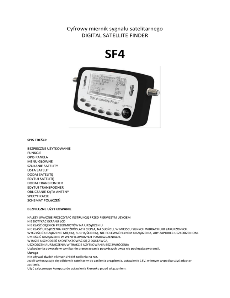 Cyfrowy miernik sygnału satelitarnego DIGITAL SATELLITE FINDER SF4 SPIS TREŚCI: BEZPIECZNE UŻYTKOWANIE FUNKCJE OPIS PANELA MENU GŁÓWNE SZUKANIE SATELITY LISTA SATELIT DODAJ SATELITĘ EDYTUJ SATELITĘ DODAJ TRANSPONDER EDYTUJ TRANSPODNER OBLICZANIE KĄTA ANTENY SPECYFIKACJE SCHEMAT POŁĄCZEŃ BEZPIECZNE UŻYTKOWANIE NALEŻY UWAŻNIE PRZECZYTAĆ INSTRUKCJĘ PRZED PIERWSZYM UŻYCIEM NIE DOTYKAĆ EKRANU LCD NIE KŁAŚĆ CIĘŻKICH PRZEDMIOTÓW NA URZĄDZENIU NIE KŁAŚĆ URZĄDZENIA PRZY ŹRÓDŁACH CIEPŁA, NA SŁOŃCU, W MIEJSCU SILNYCH WIBRACJI LUB ZAKURZONYCH. WYCZYŚCIĆ URZĄDZENIE MIĘKKĄ, SUCHĄ ŚCIERKĄ, NIE POLEWAĆ PŁYNEM URZĄDZENIA, ABY ZAPOBIEC USZKODZENIOM. UMIEŚCIĆ URZĄDZENIE W WENTYLOWANYCH POMIESZCZENIACH. W RAZIE USZKODZEŃ SKONTAKTOWAĆ SIĘ Z DOSTAWCĄ. USZKODZENIAURZĄDZENIA W TRAKCIE UŻYTKOWANIA BEZ ZWRÓCENIA Uszkodzenia powstałe w wyniku nie przestrzegania powyższych uwag nie podlegają gwarancji. Uwaga Nie używać dwóch różnych źródeł zasilania na raz. Jeżeli wykorzystuje się odbiornik satelitarny do zasilenia urządzenia, ustawienie 18V, w innym wypadku użyć adapter zasilania. Użyć załączonego kompasu do ustawienia kierunku przed włączeniem. W przypadku zwarcia przy podłączeniu kabla, na ekranie pokaże się ostrzeżenie oraz prośba o wyłączenie urządzenia („INPUT SIGNAL SHORT CIRCUIT! PLEASE POWER OFF!” PL: ZWARCIE NA SYGNALE WEJŚCIOWYM! PROSZĘ WYŁĄCZYĆ!”). Prosimy sprawdzić i usunąć problem, potem ponownie włączyć urządzenie. FUNKCJE - Możliwość edycji: transpondera, oznaczenie wskaźnika, częstotliwości sygnału itp. - Dokładna i wygodna możliwość instalacji anteny. - Obsługa regulacji 0/22KHz - Obsługa regulacji DisEqc1,0 - Pomiar siły sygnału - Wysokiej jakości wyświetlacz - Obsługa funkcji DVB-S i DVB-S2 Podłączenia: OPSI PANELA 1.Wejście sygnału (z LNB) 2.Wyjście sygnału (do odbiornika) 3.Wejście DC 4.UP - góra: przesunięcie kursora w górę 5.DOWN - dół: przesunięcie kursora w dół 6.LEFT - lewo: przesunięcie kursora w lewo 7. RIGHT - prawo: przesunięcie kursora w prawo 8. OK: potwierdzenie (ENTER) 9.EXIT: wyjście (anuluj) 10.Kompas 11.Brzęczyk MENU GŁÓWNE Na ekranie pokaże się Welcome! Initializing now, please wait a moment (Witamy! Trwa wstępne formatowanie, proszę czekać), przez pewien czas po podłączeniu zasilania, następnie wyświetli się ekran głównego menu. Wcisnąć UP lub DOWN aby przesunąć kursor do wybranej funkcji, następnie wcisnąć OK, aby potwierdzić (enter) ODSZUKIWANIE STELITY Ta funkcja oferuje szybki dostęp do satelity, dostosowanie parametrów oraz wyświetlanie statusu (siły) sygnału. Umożliwia również bezpośrednią modyfikację wybranych parametrów. Wybrać tę funkcję i nacisnąć przycisk OK aby wejść do menu jak na rysunku: USTAWIENE PARAMETRÓW SATELITY Nacisnąć przycisk UP lub DOWN aby przesunąć kursor do SAT NAME (nazwa satelity), nacisnąć przycisk LEFT lub RIGHT aby wybrać satelitę. Podobnie, przesunięcie kursora do LO FREQ (Typ LNB), Down Freq (częstotliwość transpondera) umożliwia wybranie różnych częstotliwości sygnału z satelity do odbiornika, przesunięcie kursora na Polarity (polaryzacja V lub H), DiSeqC1.0 (w przypadku konwerterów monoblock), Buzzer (sygnalizacja dźwiękowa siły sygnału). Jeżeli zajdzie potrzeba modyfikacji parametrów, wcisnąć przycisk UP lub DOWN, aby przesunąć kursor do wybranego parametru i nacisnąć przycisk OK aby wejść w funkcję ustawień, nacisnąć przycisk LEFT lub RIGHT, aby wybrać cyfrę którą zamierza się edytować, następnie nacisnąć przycisk UP lub DOWN aby zmienić liczbę (liczby: 0-9), wcisnąć przycisk EXIT aby potwierdzić i wyjść z aktualnie wybranych ustawień. Po zakończeniu wprowadzania zmian należy wcisnąć przycisk EXIT aby wyjść menu, na ekranie pokaże się Press OK to SAVE, others to EXIT (Wciśnij OK aby zapisać, inne aby wyjść), w tym momencie można zadecydować, czy chce się zapisać ostatnią modyfikację, czy nie. Przesunięcie kursora do „S: Q:” i naciśnięcie przycisku „OK” spowoduje wyświetlenie na ekranie informacji dotyczącej sygnału, jak na rysunku: Naciśnięcie przycisku EXIT (WYJŚCIE) spowoduje wyjście z tego menu. List Satellite ( lista zapisanych satelit) Funkcja pokazuje wszystkie wiadomości dotyczące satelit, transponderów, siły sygnału oraz jego jakości. Opcja ta oferuje wygodę w sprawdzeniu i wykonywania operacji. Wybrać List satellite i wcisnąć OK aby wejść do następującego menu. Wcisnąć przycisk UP lub DOWN aby wybrać satelitę, wcisnąć przycisk OK aby wejść do listy transponderów z wybranej satelity, jak na rysunku. Wcisnąć przycisk UP lub DOWN aby przesunąć kursor, wcisnąć przycisk LEFT lub RIGHT aby zmienić stronę. Wybrać transponder i wcisnąć przycisk OK aby wyświetlić siłę i jakość sygnału, jak na rysunku. Wcisnąć przycisk EXIT, aby wyjść z tego menu. DODAWANIE SATELITY Wedle preferencji użytkownika, można dodać nowe satelity. Opcja ta zawiera nazwę satelity, ustawienie częstotliwości (LO FREQUENCY), kontrolę 22HKZ oraz DiSEq1.0. Wybrać oraz wejść do menu dodawania satelity (ADD SATELLITE) jak na rysunku. Przesunąć kursor do Name i wcisnąć przycisk OK aby wejść w menu nadawania nazwy satelicie. Wcisnąć przycisk LEFT lub RIGHT aby przesunąć kursor i wybrać literę lub liczbę (wielkie litery: A-Z; małe litery: a-z; liczby: 1-9). Po wpisaniu nazwy wcisnąć przycisk EXIT aby potwierdzić i wyjść z obecnego menu. Wcisnąć przycisk UP lub DOWN aby przesunąć kursor do LO Freq, 22k lub DiSEqC1.0, następnie wcisnąć LEFT lub RIGHT aby wybrać liczbę, następnie wcisnąć przycisk UP lub DOWN, aby zmienić określone ustawienie. Jeżeli zajdzie potrzeba modyfikacji częstotliwości (LO FREQUENCY), przesunąć kursor do LO Freq i nacisnąć przycisk OK aby wejść do menu modyfikacji funkcji. Wcisnąć przy