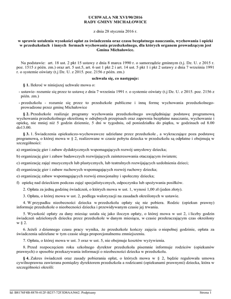 UCHWAŁA NR XVI/90/2016 RADY GMINY MICHAŁOWICE z dnia 28 stycznia 2016 r. w sprawie ustalenia wysokości opłat za świadczenia oraz czasu bezpłatnego nauczania, wychowania i opieki w przedszkolach i innych formach wychowania przedszkolnego, dla których organem prowadzącym jest Gmina Michałowice. Na podstawie: art. 18 ust. 2 pkt 15 ustawy z dnia 8 marca 1990 r. o samorządzie gminnym (t.j. Dz. U. z 2015 r. poz. 1515 z późn. zm.) oraz art. 5 ust.5, art. 6 ust 1 pkt 2 i art. 14 ust. 5 pkt 1 i pkt 2 ustawy z dnia 7 września 1991 r. o systemie oświaty (t.j Dz. U. z 2015. poz. 2156 z późn. zm.) uchwala się, co następuje: § 1. Ilekroć w niniejszej uchwale mowa o: - ustawie- rozumie się przez to ustawę z dnia 7 września 1991 r. o systemie oświaty (t.j Dz. U. z 2015. poz. 2156 z późn. zm.) - przedszkolu - rozumie się przez to przedszkole publiczne i inną formę wychowania przedszkolnegoprowadzone przez gminę Michałowice § 2. Przedszkole realizuje programy wychowania przedszkolnego uwzględniając podstawę programową wychowania przedszkolnego określoną w odrębnych przepisach oraz zapewnia bezpłatne nauczanie, wychowanie i opiekę, nie mniej niż 5 godzin dziennie, 5 dni w tygodniu, od poniedziałku do piątku, w godzinach od 8.00 do13.00. § 3. 1. Świadczenia opiekuńczo-wychowawcze udzielane przez przedszkole , a wykraczające poza podstawę programową, o której mowa w § 2, realizowane w czasie pobytu dziecka w przedszkolu są odpłatne i obejmują w szczególności: a) organizację gier i zabaw dydaktycznych wspomagających rozwój umysłowy dziecka; b) organizację gier i zabaw badawczych rozwijających zainteresowania otaczającym światem; c) organizację zajęć muzycznych lub plastycznych, lub teatralnych rozwijających uzdolnienia dzieci; d) organizację gier i zabaw ruchowych wspomagających rozwój ruchowy dziecka; e) organizację zabaw wspomagających rozwój emocjonalny i społeczny dziecka; f) opiekę nad dzieckiem podczas zajęć specjalistycznych, odpoczynku lub spożywania posiłków. 2. Opłata za jedną godzinę świadczeń, o których mowa w ust. 1, wynosi 1,00 zł (jeden złoty). 3. Opłata, o której mowa w ust. 2, podlega waloryzacji na zasadach określonych w ustawie. 4. W przypadku nieobecności dziecka w przedszkolu opłaty się nie pobiera. Rodzic (opiekun prawny) informuje przedszkole o nieobecności dziecka i przewidywanym czasie jej trwania. 5. Wysokość opłaty za dany miesiąc ustala się jako iloczyn opłaty, o której mowa w ust 2, i liczby godzin świadczeń udzielonych dziecku przez przedszkole w danym miesiącu, w czasie przekraczającym czas określony w § 2. 6. Jeżeli z dziennego czasu pracy wynika, że przedszkole kończy zajęcia o niepełnej godzinie, opłata za świadczenia udzielane w tym czasie ulega proporcjonalnemu zmniejszeniu. 7. Opłata, o której mowa w ust. 3 oraz w ust. 5, nie obejmuje kosztów wyżywienia. 8. Przed rozpoczęciem roku szkolnego dyrektor przedszkola pisemnie informuje rodziców (opiekunów prawnych) o sposobie przekazywania informacji o nieobecności dziecka w przedszkolu. § 4. Zakres świadczeń oraz zasady pobierania opłat, o których mowa w § 2, będzie regulowała umowa cywilnoprawna zawierana pomiędzy dyrektorem przedszkola a rodzicami (opiekunami prawnymi) dziecka, która w szczególności określi: Id: B8176F4B-8870-412F-B237-72F3D8AA5662. Podpisany Strona 1 - okres, na który jest zawierana, - dzienny wymiar czasu pobytu dziecka w przedszkolu, - zakres korzystania z posiłków, - zakres korzystania ze świadczeń ponad podstawę programową wychowania przedszkolnego. § 5. Wykonanie uchwały powierza się Wójtowi Gminy Michałowice § 6. Uchwała wchodzi w życie po upływie 14 dni od dnia ogłoszenia w Dzienniku Urzędowym Województwa Małopolskiego. Przewodnicząca Rady Gminy Michałowice Ewa Krawczyk Id: B8176F4B-8870-412F-B237-72F3D8AA5662. Podpisany Strona 2 Uzasadnienie Niniejsza uchwała ma na celu określenie dziennego wymiaru czasu bezpłatnego nauczania, wychowania i opieki oraz wysokości opłat w przedszkolach, dla których organem prowadzącym jest gmina Michałowice. W przypadku gminy, która nie prowadzi przedszkoli publicznych uchwała jest konieczna dla przedszkoli niepublicznych, które spełniają warunki określone w art. 90 ust 1 b ustawy z dnia 7 września 1991r o systemie oświaty (t.j. Dz.U 2015, poz. 2156 z późn. zm.), co spowodowane jest wprowadzeniem istotnych zmian w organizacji i finansowaniu wychowania przedszkolnego. Ustawa z dnia 7 września 1991r o systemie oświaty (t.j. Dz.U. 2015, poz. 2156 z późn. zm.) określa m.in. zasady organizacji i finansowania wychowania przedszkolnego i zobowiązuje gminę do zapewnienia bezpłatnej opieki przedszkolnej w zakresie podstawy programowej dzieciom w wieku 4 - 5 lat. (od września 2017r także dzieciom 3-letnim) zamieszkałym na terenie tej gminy. Ponieważ Gmina Michałowice nie prowadzi przedszkola samorządowego- ma obowiązek przeprowadzić otwarty konkurs ofert na realizację zadania publicznego z zakresu wychowania przedszkolnego i wyłonić niepubliczne przedszkole lub niepubliczne przedszkola, które spełniają warunki określone w art. 90, ust 1 b ww. ustawy. Przedszkole to ( lub przedszkola) m.in. nie będzie pobierać od rodziców (opiekunów prawnych) opłat za nauczanie, wychowanie i opiekę w ramach podstawy programowej wychowania przedszkolnego realizowanej w wymiarze 5 godzin dziennie, natomiast za czas wykraczający poza bezpłatne nauczanie będzie pobierać opłatę nie wyższą niż opłaty ustalone przez Radę Gminy dla publicznych przedszkoli samorządowych, nie wyższą jednak niż 1 zł za godzinę. Wobec powyższego konieczne jest ustalenie stawek opłat, o których mowa powyżej, mimo że w gminie nie funkcjonują przedszkola samorządowe, a w szkołach działają jedynie oddziały rocznego obowiązkowego przygotowania do szkoły. Można przyjąć, że średnia dzienna rzecz
