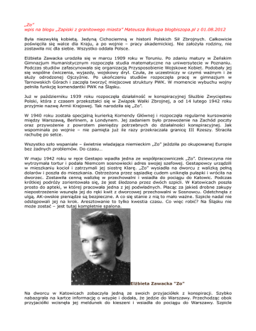 „Zo” wpis na blogu „Zapiski z granitowego miasta” Mateusza Biskupa blogbiszopa.pl z 01.08.2012 Była niezwykłą kobietą. Jedyną Cichociemną w historii Polskich Sił Zbrojnych. Całkowicie poświęciła się walce dla Kraju, a po wojnie – pracy akademickiej. Nie założyła rodziny, nie zostawiła nic dla siebie. Wszystko oddała Polsce. Elżbieta Zawacka urodziła się w marcu 1909 roku w Toruniu. Po zdaniu matury w Żeńskim Gimnazjum Humanistycznym rozpoczęła studia matematyczne na uniwersytecie w Poznaniu. Podczas studiów zafascynowała się organizacją Przysposobienie Wojskowe Kobiet. Podobały jej się wspólne ćwiczenia, wyjazdy, wojskowy dryl. Czuła, że uczestniczy w czymś ważnym i że służy odrodzonej Ojczyźnie. Po ukończeniu studiów rozpoczęła pracę w gimnazjum w Tarnowskich Górach i zaczęła tworzyć miejscowe struktury PWK. W momencie wybuchu wojny pełniła funkcję komendantki PWK na Śląsku. Już w październiku 1939 roku rozpoczęła działalność w konspiracyjnej Służbie Zwycięstwu Polski, która z czasem przekształci się w Związek Walki Zbrojnej, a od 14 lutego 1942 roku przyjmie nazwę Armii Krajowej. Tak narodziła się „Zo”. W 1940 roku została specjalną kurierką Komendy Głównej i rozpoczęła regularne kursowanie między Warszawą, Berlinem, a Londynem. Jej zadaniem było przewożenie na Zachód poczty oraz przywożenie z powrotem pieniędzy potrzebnych do działalności konspiracyjnej. Jak wspominała po wojnie – nie pamięta już ile razy przekraczała granicę III Rzeszy. Straciła rachubę po setce. Wszystko szło wspaniale – świetnie władająca niemieckim „Zo” jeździła po okupowanej Europie bez żadnych problemów. Do czasu… W maju 1942 roku w ręce Gestapo wpadła jedna ze współpracowniczek „Zo”. Dziewczyna nie wytrzymała tortur i podała Niemcom sosnowiecki adres swojej szefowej. Gestapowcy urządzili w mieszkaniu kocioł i zatrzymali jej siostrę Klarę. „Zo” wysiadła na dworcu z walizką pełną dolarów i poszła do mieszkania. Ostrzeżona przez sąsiadkę cudem uniknęła pułapki i wróciła na dworzec. Zostawiła cenną walizkę w przechowalni i wsiadła do pociągu do Katowic. Podczas krótkiej podróży zorientowała się, że jest śledzona przez dwóch szpicli. W Katowicach poszła prosto do apteki, w której pracowała jedna z jej podwładnych. Płacąc za jakieś drobne zakupy niepostrzeżenie wsunęła jej do ręki kwit z dworcowej przechowalni w Sosnowcu. Odetchnęła z ulgą. AK-owskie pieniądze są bezpieczne. A co się stanie z nią to mało ważne. Szpicle nadal nie odstępowali jej na krok. Aresztowanie to tylko kwestia czasu. Co więc robić? Na Śląsku nie może zostać – jest tutaj kompletnie spalona. Elżbieta Zawacka "Zo" Na dworcu w Katowicach zobaczyła jedną ze swoich przyjaciółek z konspiracji. Szybko nabazgrała na kartce informację o wsypie i dodała, że jedzie do Warszawy. Przechodząc obok przyjaciółki wcisnęła jej meldunek do kieszeni i wsiadła do pociągu do Warszawy. Szpicle oczywiście wsiedli za nią. Musiała ich zgubić za wszelką cenę. Tuż przed Warszawą poszła na tył pociągu udając, że idzie do ubikacji. Wyszła na zewnątrz i skoczyła z pędzącego wagonu na ziemię. Poraniona i pokrwawiona z trudem stanęła na nogi. Teraz jak najszybciej musi zjawić się w Warszawie. Od napotkanej wiejskiej kobiety kupiła za cenę swojego pierścionka bochen chleba i chustkę, którą owinęła podrapaną twarz. Po dotarciu do stolicy zameldowała się w jednej z konspiracyjnych melin. Była uratowana. Wskutek wsypy na Śląsku aresztowane zostało jej rodzeństwo – siostra Klara trafiła do najcięższego obozu koncentracyjnego dla kobiet w Ravensbruck, a brat Egon został zamordowany w Oświęcimiu. Było jasne, że „Zo” nie może wracać na Śląsk. Komendant Główny Armii Krajowej generał Stefan „Grot” Rowecki wymyślił dla niej specjalne zadanie. „Zo” musi jeszcze raz udać się do Londynu, by usprawnić komunikację na linii Komenda Główna AK w Warszawie – Sztab Naczelnego Wodza Polskich Sił Zbrojnych na Zachodzie. Oficerowie tworzący sztab generała Sikorskiego w Londynie nie mieli pojęcia o tym, co naprawdę dzieje się w Kraju i jak wygląda okupacyjna rzeczywistość. Ich Polska skończyła się 1 września 1939 roku. Po kampanii wrześniowej opuścili ją, by różnymi drogami przedostać się do Wielkiej Brytanii, by tam kontynuować walkę. Służyli Polsce jak umieli najlepiej, ale nie zdawali sobie sprawy z tego, jak okupowana Polska wygląda. Mieszkali teraz w nieogarniętym wojną Londynie w przyzwoitych kwaterach, jedli porządne posiłki, a czas wolny spędzali w pubach. W najgorszych snach nie mogliby sobie wyobrazić terroru rozpętanego przez nazistów w Kraju. Nie mieli pojęcia co to łapanki, kennkarty, getto, a Aleja Szucha kojarzyła im się wyłącznie z przedwojennym Ministerstwem Do Spraw Wyznań i Oświecenia Publicznego. To niezrozumienie okupacyjnych realiów powodowało wiele problemów na linii Warszawa – Londyn. „Zo” miała to naprawić. Wyruszyła w drogę w grudniu 1942 roku. Trasa prowadziła przez Niemcy, Francję, Andorę, Hiszpanię i Gibraltar. Stamtąd statkiem przepłynęła do Anglii i dotarła do Londynu w maju 1943 roku. Pułkownik Protasewicz przedstawił ją oficerom odpowiedzialnym za łączność z Krajem i polecił im ścisłą współpracę z „Zo”. Wielokrotnie go potem za to przeklinali. „Zo” nie uznawała bowiem żadnych kompromisów. Była niezwykle wymagająca wobec siebie i wobec innych. Natychmiast zażądała od oficerów przedstawienia wszystkich akt i depesz, które zostały wysłane z Kraju i które jej zdaniem nie zostały właściwie wzięte pod uwagę. Zarzucała ich setkami pytań, wytykała błędy, rugała za najmniejszy nieporządek w archiwum. Szybko ją znienawidzili. Skończyła się dla nich sielankowa praca w urzędowych 