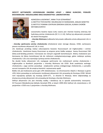 DEFICYT AKTYWNOŚCI LIZOSOMALNEJ KWAŚNEJ LIPAZY – OBRAZ KLINICZNY, PODŁOŻE BIOCHEMICZNE I MOLEKULARNE ORAZ DIAGNOSTYKA LABORATORYJNA AGNIESZKA ŁUGOWSKA1, ANNA TYLKI-SZYMAŃSKA2 1) INSTYTUT PSYCHIATRII I NEUROLOGII W WARSZAWIE, ZAKŁAD GENETYKI 2) INSTYTUT POMNIK-CENTRUM ZDROWIA DZIECKA, KLINIKA CHORÓB METABOLICZNYCH Lizosomalna kwaśna lipaza (LAL) zwana jest również kwaśną esterazą lub hydrolazą estrów cholesterolu [EC 3.1.1.13]. Deficyt jej aktywności prowadzi do dwóch fenotypów: dr Ługowska Agnieszka - choroby Wolmana (całkowita lub prawie całkowita utrata aktywności LAL in vivo) - choroby spichrzania estrów cholesterolu (cholesteryl ester storage disease, CESD; zachowana pewna resztkowa aktywność LAL in vivo). LAL katalizuje przebieg reakcji odszczepiania kwasów tłuszczowych od triglicerydów i estrów cholesterolu. Uwolnione kwasy tłuszczowe są wiązane przez białko wiążące kwasy tłuszczowe FAB (fatty-acid-binding protein) i kierowane do różnych organelli komórkowych. Wolny cholesterol jest kierowany do błony komórkowej lub do retikulum endoplazmatycznego, gdzie redukuje syntezę cholesterolu i LDL oraz stymuluje syntezę estrów cholesterolu. Na skutek braku aktywności LAL następuje spichrzanie nie rozłożonych estrów cholesterolu i triglicerydów w tkankach pacjentów z chorobą Wolmana lub CESD. Brak uwalniania wolnego cholesterolu z jego estrów powoduje zwiększenie syntezy endogennego cholesterolu, a ponadto wzrost transportu LDL do wnętrza komórki i wytwarzania apoB. Białko LAL jest kodowane przez gen LIPA zlokalizowany na chromosomie 10q23.2. Mutacje w genie LIPA, które pozwalają na zachowanie resztkowej aktywności LAL prowadzą do fenotypu CESD. Wśród nich najczęściej spotyka się mutację Δ254-2771 w eksonie 8. Mutacje, które odpowiadają za drastyczną utratę aktywności LAL prowadzą do fenotypu choroby Wolmana. Deficyt aktywności LAL jest chorobą rzadką i dziedziczy się w sposób autosomalny recesywny. W Pracowni Metabolicznej Zakładu Genetyki IPIN, w latach 1999-2012 deficyt LAL stwierdzono u 10 pacjentów z CESD oraz 2 pacjentów z chorobą Wolmana.