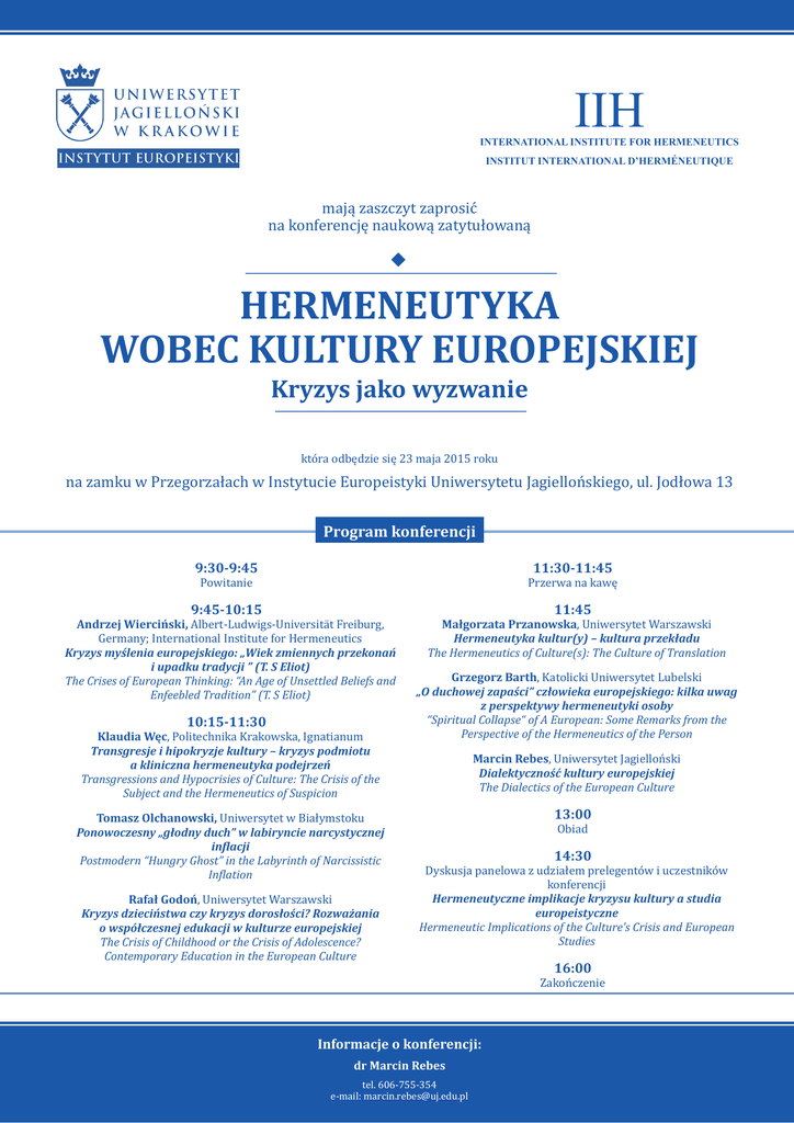 IIH INTERNATIONAL INSTITUTE FOR HERMENEUTICS INSTITUT INTERNATIONAL D’HERMÉNEUTIQUE mają zaszczyt zaprosić na konferencję naukową zatytułowaną Hermeneutyka wobec kultury europejskiej Kryzys jako wyzwanie która odbędzie się 23 maja 2015 roku na zamku w Przegorzałach w Instytucie Europeistyki Uniwersytetu Jagiellońskiego, ul. Jodłowa 13 Program konferencji 9:30-9:45 11:30-11:45 Powitanie 9:45-10:15 Andrzej Wierciński, Albert-Ludwigs-Universität Freiburg, Germany; International Institute for Hermeneutics Kryzys myślenia europejskiego: „Wiek zmiennych przekonań i upadku tradycji ” (T. S Eliot) The Crises of European Thinking: “An Age of Unsettled Beliefs and Enfeebled Tradition” (T. S Eliot) 10:15-11:30 Klaudia Węc, Politechnika Krakowska, Ignatianum Transgresje i hipokryzje kultury – kryzys podmiotu a kliniczna hermeneutyka podejrzeń Transgressions and Hypocrisies of Culture: The Crisis of the Subject and the Hermeneutics of Suspicion Tomasz Olchanowski, Uniwersytet w Białymstoku Ponowoczesny „głodny duch” w labiryncie narcystycznej inflacji Postmodern “Hungry Ghost” in the Labyrinth of Narcissistic Inflation Rafał Godoń, Uniwersytet Warszawski Kryzys dzieciństwa czy kryzys dorosłości? Rozważania o współczesnej edukacji w kulturze europejskiej The Crisis of Childhood or the Crisis of Adolescence? Contemporary Education in the European Culture Przerwa na kawę 11:45 Małgorzata Przanowska, Uniwersytet Warszawski Hermeneutyka kultur(y) – kultura przekładu The Hermeneutics of Culture(s): The Culture of Translation Grzegorz Barth, Katolicki Uniwersytet Lubelski „O duchowej zapaści” człowieka europejskiego: kilka uwag z perspektywy hermeneutyki osoby “Spiritual Collapse“ of A European: Some Remarks from the Perspective of the Hermeneutics of the Person Marcin Rebes, Uniwersytet Jagielloński Dialektyczność kultury europejskiej The Dialectics of the European Culture 13:00 Obiad 14:30 Dyskusja panelowa z udziałem prelegentów i uczestników konferencji Hermeneutyczne implikacje kryzysu kultury a studia europeistyczne Hermeneutic Implications of the Culture’s Crisis and European Studies 16:00 Zakończenie Informacje o konferencji: dr Marcin Rebes tel. 606-755-354 e-mail: [email protected]