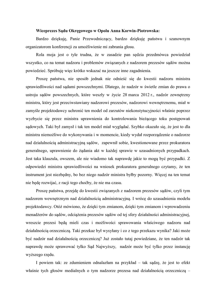 Wiceprezes Sądu Okręgowego w Opolu Anna Korwin-Piotrowska: Bardzo dziękuję, Panie Przewodniczący, bardzo dziękuję państwu i szanownym organizatorom konferencji za umożliwienie mi zabrania głosu. Rola moja jest o tyle trudna, że w zasadzie pan sędzia przedmówca powiedział wszystko, co na temat nadzoru i problemów związanych z nadzorem prezesów sądów można powiedzieć. Spróbuję więc krótko wskazać na jeszcze inne zagadnienia. Proszę państwa, nie sposób jednak nie odnieść się do kwestii nadzoru ministra sprawiedliwości nad sądami powszechnymi. Dlatego, że nadzór w świetle zmian do prawa o ustroju sądów powszechnych, które weszły w życie 28 marca 2012 r., nadzór zewnętrzny ministra, który jest przeciwstawiany nadzorowi prezesów, nadzorowi wewnętrznemu, miał w zamyśle projektodawcy uchronić ten model od zarzutów niekonstytucyjności właśnie poprzez wyzbycie się przez ministra uprawnienia do kontrolowania bieżącego toku postępowań sądowych. Taki był zamysł i tak ten model miał wyglądać. Szybko okazało się, że jest to dla ministra niemożliwe do wykonywania i w momencie, kiedy wydał rozporządzenie o nadzorze nad działalnością administracyjną sądów, zapewnił sobie, kwestionowane przez prokuratora generalnego, uprawnienie do żądania akt w każdej sprawie w uzasadnionych przypadkach. Jest taka klauzula, owszem, ale nie wiadomo tak naprawdę jakie to mogą być przypadki. Z odpowiedzi ministra sprawiedliwości na wniosek prokuratora generalnego czytamy, że ten instrument jest niezbędny, bo bez niego nadzór ministra byłby pozorny. Więcej na ten temat nie będę rozwijać, z racji tego choćby, że nie ma czasu. Proszę państwa, przejdę do kwestii związanych z nadzorem prezesów sądów, czyli tym nadzorem wewnętrznym nad działalnością administracyjną. I wrócę do uzasadnienia modelu projektodawcy. Otóż mówiono, że dzięki tym zmianom, dzięki tym zmianom i wprowadzeniu menadżerów do sądów, odciążenia prezesów sądów od tej sfery działalności administracyjnej, wreszcie prezesi będą mieli czas i możliwości sprawowania właściwego nadzoru nad działalnością orzeczniczą. Taki przekaz był wysyłany i co z tego przekazu wynika? Jaki może być nadzór nad działalnością orzeczniczą? Już zostało tutaj powiedziane, że ten nadzór tak naprawdę może sprawować tylko Sąd Najwyższy, nadzór może być tylko przez instancję wyższego rzędu. I powiem tak: ze zdumieniem odnalazłam na przykład – tak sądzę, że jest to efekt właśnie tych głosów medialnych o tym nadzorze prezesa nad działalnością orzeczniczą – wystąpienie jednej z liczących się organizacji pozarządowych, opiniotwórczej organizacji pozarządowej, które wskutek interwencji strony niezadowolonej z rozstrzygnięcia sądowego oddalającego wniosek o zwolnienie od kosztów sądowych, wystąpiła do prezesa sądu apelacyjnego z prośbą o właśnie podjęcie działań w trybie art. 38 prawa o ustroju sądów powszechnych w sprawie tejże, uważając, że powinna zostać przeprowadzona wizytacja w sądzie właśnie pod kątem weryfikacji decyzji dotyczących zwolnień od kosztów sądowych pod kątem orzecznictwa Europejskiego Trybunału Praw Człowieka w Strasburgu. Tak myślę, że ta interwencja, żądanie wizytacji – która oczywiście, nie mogłaby być przeprowadzona pod kątem zasadności udzielania bądź nieudzielania zwolnienia od kosztów, bo jest to orzeczenie sądu i może być tylko i wyłącznie weryfikowane w trybie nadzoru judykacyjnego – pewnie jest wynikiem tego przekazu medialnego, że oto teraz będziemy mieli zwiększony nadzór prezesów nad działalnością orzeczniczą i na pewno to poprawi sprawność i jakość funkcjonowania sądów. To jest zadziwiające, ale rzeczywiście tego rodzaju oczekiwania mamy i ciągle mamy te skargi, wnioski, pisma stron niezadowolonych kierowane do ministra, do prezesów o to, żeby coś zrobić i to orzeczenie zmienić. Dzisiaj zostało powiedziane jasno i wyraźnie wielokrotnie, że Trybunał wyraził się w sposób nie budzący wątpliwości, że ów nadzór administracyjny, jaki prezesi sprawują, nie może dotykać kwestii orzecznictwa. I to, proszę państwa, wiemy, tak wynika z przepisów, tak wynika z u.s.p., tak powiedział Trybunał. Ale rzeczywistość wydaje się być inna, a nawet powiem, że jest inna. Dlatego, że jednak to, co zostało tutaj zaakcentowane przez pana sędziego Klugiewicza, prezesi sądów w zakresie administracji sądowej podlegają i prezesowi przełożonego sadu, ale jednak również ministrowi sprawiedliwości, który, jako polityk, odpowiada przed całym rządem za wyniki wymiaru sprawiedliwości. Wyniki rozumiane wynikami statystycznymi, bo to jest najważniejsze – ilość, pozostałość, wskaźniki zaległości, itd. W związku z tym nadzór sprawowany przez prezesów sądów z kolei nadzorowanych i kierowanych przez ministra sprawiedliwości nakierowany jest przede wszystkim na to, żeby poprawić prawność w kontekście poprawy wyników statystycznych. To jest główne zadanie prezesów, jeżeli chodzi o sprawowanie nadzoru administracyjnego nad działalnością sądów. I co w efekcie? Tak jak powiedział pan sędzia, oczywiście oddzielenie sfery działalności administracyjnej od sfery orzeczniczej nie jest takie proste, jakby się wydawało i jak możemy wyczytać z wyroku Trybunału Konstytucyjnego. Dlatego, że oczywiście wiele różnych orzeczeń, czynności procesowych skutkuje zwłoką, skutkuje opóźnieniem rozpoznania, tak jak zawieszenie postępowania, jak wyłączenie sprawy jednego oskarżonego do innego postępowania, jak podjęcie decyzji przez sąd w postępowaniu uproszczonym, że jednak oskarżony musi się stawić na rozprawy, bo sąd nie będzie prowadził rozprawy pod jego nieobecność. Wszystkie te decyzje procesowe mogą powodować przewlekłość postępowania. I cóż, prezes sąd
