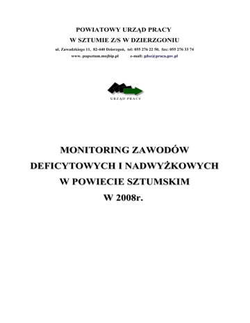 POWIATOWY URZĄD PRACY W SZTUMIE Z/S W DZIERZGONIU ul. Zawadzkiego 11, 82-440 Dzierzgoń, tel: 055 276 22 50, fax: 055 276 33 74 www. pupsztum.mojbip.pl e-mail: [email protected] MONITORING ZAWODÓW DEFICYTOWYCH I NADWYŻKOWYCH W POWIECIE SZTUMSKIM W 2008r. Dzierzgoń, marzec 2009 SPIS TREŚCI 1. WSTĘP ....................................................................................................... 3 2. ANALIZA BEZROBOCIA WEDŁUG ZAWODÓW (grup zawodów).... 5 2.1. Dane ogólne.......................................................................................... 5 2.2. Najliczniejsze grupy zawodowe w roku 2008...................................... 6 2.3. Najmniej liczne grupy zawodowe w roku 2008................................... 7 2.4. Napływ osób bezrobotnych w 2008 roku wg zawodów i specjalności 8 3. ANALIZA OFERT PRACY ...................................................................... 12 3.1. Oferty pracy zgłoszone w 2008 r. wg zawodów.................................. 12 3.2. Oferty pracy zgłoszone w 2008 r. wg rodzaju działalności................. 13 3.3. Bezrobotni wg rodzaju działalności ostatniego miejsca pracy oraz oferty pracy w 2008 r................................................................................................. 14 4. NALIZA ZAWODÓW DEFICYTOWYCH I NADWYŻKOWYCH....... 17 4.1. Zawody deficytowe.............................................................................. 17 4.2. Zawody nadwyżkowe........................................................................... 18 4.3. Zawody zrównoważone........................................................................ 20 5. PODSUMOWANIE I WNIOSKI............................................................... 22 6. SPIS RYSUNKÓW I TABEL..................................................................... 24 2 1. WSTĘP Celem niniejszego opracowania jest określenie kierunków i natężenia zmian zachodzących w strukturze zawodowo-kwalifikacyjnej na terenie powiatu sztumskiego. Opracowanie umożliwi stworzenie bazy informacyjnej dla opracowania przyszłych struktur zawodowo – kwalifikacyjnych w układzie lokalnym. Przez monitoring zawodów deficytowych i nadwyżkowych należy rozumieć proces systematycznego obserwowania zjawisk zachodzących na rynku pracy, dotyczących kształtowania popytu na pracę i podaży zasobów pracy w przekroju terytorialno – zawodowym oraz formułowania na tej podstawie ocen, wniosków i krótkotrwałych prognoz niezbędnych dla prawidłowego funkcjonowania systemów: szkolenia osób bezrobotnych oraz kształcenia zawodowego. Zawód deficytowy to zawód, na który występuje na rynku pracy zapotrzebowanie wyższe niż liczba osób poszukujących pracy w tym zawodzie. Zawód nadwyżkowy to zawód, na który na rynku pracy występuje zapotrzebowanie mniejsze od liczby osób poszukujących pracy w tym zawodzie. Wdrożenie monitoringu zawodów deficytowych i nadwyżkowych pozwala na: 1. podniesienie świadomości przedstawicieli instytucji rynku pracy oraz sfery edukacji w zakresie potrzeb rynku pracy, poprzez upowszechnienie wyników monitoringu zawodów nadwyżkowych i deficytowych - kompleksowych analiz pod kątem popytu na określone zawody i kwalifikacje oraz uwzględniających zmiany zachodzące na rynku; 2. stworzenie mechanizmu pozwalającego skoordynować politykę podmiotów rynku pracy i sektora edukacyjnego z potrzebami rynku pracy; 3. usprawnienie poradnictwa zawodowego poprzez wskazanie zawodów deficytowych i nadwyżkowych; 4. ułatwienie realizacji programów specjalnych dla aktywizacji osób długotrwale bezrobotnych w celu promowania ich ponownego zatrudnienia; 5. usprawnienie pośrednictwa pracy poprzez uzyskanie informacji o planowanych ofertach pracy na rok przyszły oraz przewidywanej liczbie absolwentów wg zawodów; 3 6. określenie odpowiednich kierunków szkolenia bezrobotnych, zapewniając większą efektywność organizowanych szkoleń. Sporządzony raport dot. zawodów deficytowych i nadwyżkowych za rok 2008 składa się z części diagnostycznej, która obejmuje analizę stanu bezrobocia w powiecie sztumskim, oferty pracy oraz ranking zawodów deficytowych i nadwyżkowych w roku 2008. Źródłem informacji wykorzystanych do opracowania niniejszego raportu były: Załącznik 2 do sprawozdania MPiPS-01 – „Bezrobotni według rodzaju działalności ostatniego miejsca pracy oraz ofert pracy. Stan za I i II półrocze 2008 roku” oraz Załącznik 3 do sprawozdania MPiPS-01 - „Bezrobotni oraz oferty pracy według zawodów i specjalności za I i II półrocze 2008”. Monitoring dotyczy 30 dużych grup zawodowych (kod 2 cyfrowy), 392 grup elementarnych (kod 4 cyfrowy) oraz 1770 zawodów i specjalności określonych w „Klasyfikacji zawodów i specjalności” wprowadzonej do stosowania rozporządzeniem Ministra Gospodarki i Pracy z dnia 8 grudnia 2004 r. (Dz.U Nr 265, poz. 2644) oraz rozporządzeniem Ministra Pracy i Polityki Społecznej z dnia 1 czerwca 2007 r. zmieniającym rozporządzenie w sprawie klasyfikacji zawodów i specjalności dla potrzeb rynku pracy oraz zakresu jej stosowania (Dz. U Nr 106, poz. 728). Głównymi użytkownikami „Monitoringu zawodów deficytowych i nadwyżkowych” są m.in.: - władze oświatowe wszelkich szczebli, - instytucje szkoleniowe, - inne zainteresowane organy rządowe, samorządowe, organizacje pozarządowe. 4 2. ANALIZA BEZROBOCIA WEDŁUG ZAWODÓW (grup zawodów). 2.1. Dane ogólne. Według stanu na dzień 31.12.2008r. w Powiatowym Urzędzie Pracy w Sztumie z/s w Dzierzgoniu zarejestrowanych było 2110 osób bezrobotnych, w tym 1441 kobiety. Wśród osób zarejestrowanych 78% (1654 osób), posiada zawód wyuczony względnie wykonywany. Liczba kobiet posiadających wyuczony zawód kształtuje się na poziomie 1106 osób, co stanowi 67% ogółu bezrobotnych z zawodem. Wśród osób z zawodem 316 osób (20%) to osoby długotrwale bezrobotne, osoby zarejestrowane w okresie do 12 mi