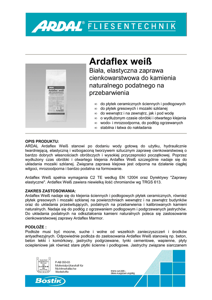 Ardaflex weiß Biała, elastyczna zaprawa cienkowarstwowa do kamienia naturalnego podatnego na przebarwienia • • • • • • do płytek ceramicznych ściennych i podłogowych do płytek gresowych i mozaiki szklanej do wewnątrz i na zewnątrz, jak i pod wodę o wydłużonym czasie obróbki i otwartego klejenia wodo- i mrozoodporna, do podłóg ogrzewanych stabilna i łatwa do nakładania OPIS PRODUKTU: ARDAL Ardaflex Weiß stanowi po dodaniu wody gotową do użytku, hydraulicznie twardniejącą, elastyczną i wzbogaconą tworzywem sztucznym zaprawę cienkowarstwową o bardzo dobrych własnościach obróbczych i wysokiej przyczepności początkowej. Poprzez wydłużony czas obróbki i otwartego klejenia Ardaflex Weiß szczególnie nadaje się do układania mozaiki szklanej. Związana zaprawa klejowa jest odporna na działanie ciągłej wilgoci, mrozoodporna i bardzo podatna na formowanie. Ardaflex Weiß spełnia wymagania C2 TE według EN 12004 oraz Dyrektywy "Zaprawy elastyczne". Ardaflex Weiß zawiera niewielką ilość chromianów wg TRGS 613. ZAKRES ZASTOSOWANIA: Ardaflex Weiß nadaje się do klejenia ściennych i podłogowych płytek ceramicznych, również płytek gresowych i mozaiki szklanej na powierzchniach wewnątrz i na zewnątrz budynków oraz do układania prześwitujących, podatnych na przebarwienia i kalibrowanych kamieni naturalnych. Nadaje się do podłóg z ogrzewaniem podłogowym i podgrzewanych jastrychów. Do układania podatnych na odkształcenia kamieni naturalnych poleca się zastosowanie cienkowarstwowej zaprawy Ardaflex Marmor. PODŁOŻE : Podłoże musi być mocne, suche i wolne od wszelkich zanieczyszczeń i środków antyadhezyjnych. Odpowiednie podłoża do zastosowania Ardaflex Weiß stanowią np. beton, beton lekki i komórkowy, jastrychy podgrzewane, tynki cementowe, wapienne, płyty ociepleniowe jak również stare płytki ścienne i podłogowe. Jastrychy związane siarczanem wapnia należy przeszlifować, odkurzyć i odpowiednio wysuszyć (zawartość wilgoci związanej 0,5%). Wilgoć związana: jastrychy cementowe 2,0%; jastrychy związane siarczanem wapnia 0,3%. Do gruntowania chłonnych podłoży polecamy ARDAL Grundfestiger. Zagruntowane jastrychy wiązane siarczanem wapnia muszą przeschnąć 24 godziny. W przypadku wątpliwości przeprowadzić próby. Obowiązują odpowiednie normy, dyrektywy oraz ogólnie uznane i stosowane zasady. PRZYGOTOWANIE ZAPRAWY: Ardaflex Weiß miesza się z wodą wodociągową w czystym pojemniku do uzyskania jednorodnej masy. Na 25 kg zaprawy dodaje się ok. 7 litrów wody. Do mieszania zaleca się stosowanie mieszalnika do zapraw. Po około trzyminutowym okresie dojrzewania należy jeszcze raz krótko zamieszać zaprawę. Zaprawa jest gotowa do natychmiastowej obróbki. Przygotowaną zaprawę można stosować przez około 4 godziny. OBRÓBKA: Nie stosować Ardaflex Weiß w temperaturze poniżej +5°C. Należy przestrzegać przepisów normy DIN 18 157 cz. 1 "Wykonywanie okładzin ceramicznych metodą cienkowarstwową". W okładzinie ceramicznej należy wykonać szczeliny dylatacyjne o wymaganej wielkości i zastosować silikon sanitarny Bostik Sanitärsilicon Profi albo silikon do marmuru i naturalnego kamienia Bostik Marmorsilicon. Ardaflex Weiß najpierw gładką stroną kielni nakłada się na podłoże cienką warstwą. Następnie na świeżą warstwę kontaktową nanosi się nową zaprawę, którą rozprowadza się szpachlą zębatą dobraną odpowiednio do wielkości płytki. Jednorazowo można nałożyć na powierzchnię tyle zaprawy, aby płytki układać zawsze na świeżej warstwie kleju. Czas układania (czas otwartego schnięcia) wynosi w zależności od warunków otoczenia i podłoża około 30 minut. Podczas klejenia na powierzchniach na zewnątrz budynków oraz na uczęszczanych powierzchniach należy uważać, aby płytki ceramiczne przykładać całą powierzchnią bez jam skurczowych. W takim przypadku może być konieczne układanie metodą Buttering-Floating. FUGOWANIE: Po ok. 24 godzinach można fugować płytki ceramiczne i kamień naturalny podatny na przebarwienia za pomocą fugi ARDAL Special Fuge, ARDAL Maxi Fuge lub ARDAL Flex Fuge jak również kamień naturalny podatny na przebarwienia za pomocą zaprawy fugowej ARDAL Fugenmörtel lub ARDAL Flex Fuge (niezbędne próby). CZYSZCZENIE: Narzędzia i zabrudzone miejsca natychmiast czyścić wodą. DANE TECHNICZNE: Kolor: Baza: Stosunek mieszania: Czas pracy: Zużycie (zaprawa sucha): Czas otwartego schnięcia: Temperatura pracy: Możliwość wejścia na posadzkę: Pełna obciążalność: biel naturalna modyfikowana żywica z tworzyw sztucznych, cementowa zaprawa sucha 25 kg zaprawy + ok. 7 l wody ok. 24 godziny w zależności od temperatury 1,5 – 3,0 kg/m^2 w zależności od listwy zębatej ok. 30 minut w zależności od temperatury i chłonności podłoża +5ºC do +25ºC po ok. 24 godzinach po ok. 14 dniach GISCODE: ZP 1 BHP: Produkt zawiera cement i reaguje z wodą alkalicznie. Należy chronić oczy i skórę. Przestrzegać ostrzeżeń i wskazówek bezpieczeństwa, podanych na opakowaniach oraz w arkuszach danych bezpieczeństwa. Niska zawartość chromu wg TRGS 613. PRZECHOWYWANIE: W miejscu chłodnym i suchym. Okres przechowywania: 12 miesięcy. FORMA MAGAZYNOWANIA: Worek: 25 kg