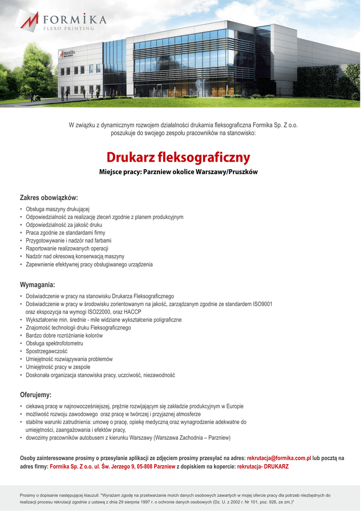 W związku z dynamicznym rozwojem działalności drukarnia fleksograficzna Formika Sp. Z o.o. poszukuje do swojego zespołu pracowników na stanowisko: Drukarz fleksograficzny Miejsce pracy: Parzniew okolice Warszawy/Pruszków Zakres obowiązków: • • • • • • • • Obsługa maszyny drukującej Odpowiedzialność za realizację zleceń zgodnie z planem produkcyjnym Odpowiedzialność za jakość druku Praca zgodnie ze standardami firmy Przygotowywanie i nadzór nad farbami Raportowanie realizowanych operacji Nadzór nad okresową konserwacją maszyny Zapewnienie efektywnej pracy obsługiwanego urządzenia Wymagania: • Doświadczenie w pracy na stanowisku Drukarza Fleksograficznego • Doświadczenie w pracy w środowisku zorientowanym na jakość, zarządzanym zgodnie ze standardem ISO9001 oraz ekspozycja na wymogi ISO22000, oraz HACCP • Wykształcenie min. średnie - mile widziane wykształcenie poligraficzne • Znajomość technologii druku Fleksograficznego • Bardzo dobre rozróżnianie kolorów • Obsługa spektrofotometru • Spostrzegawczość • Umiejętność rozwiązywania problemów • Umiejętność pracy w zespole • Doskonała organizacja stanowiska pracy, uczciwość, niezawodność Oferujemy: • ciekawą pracę w najnowocześniejszej, prężnie rozwijającym się zakładzie produkcyjnym w Europie • możliwość rozwoju zawodowego oraz pracę w twórczej i przyjaznej atmosferze • stabilne warunki zatrudnienia: umowę o pracę, opiekę medyczną oraz wynagrodzenie adekwatne do umiejętności, zaangażowania i efektów pracy, • dowozimy pracowników autobusem z kierunku Warszawy (Warszawa Zachodnia – Parzniew) Osoby zainteresowane prosimy o przesyłanie aplikacji ze zdjęciem prosimy przesyłać na adres: [email protected] lub pocztą na adres firmy: Formika Sp. Z o.o. ul. Św. Jerzego 9, 05-808 Parzniew z dopiskiem na kopercie: rekrutacja- DRUKARZ Prosimy o dopisanie następującej klauzuli: "Wyrażam zgodę na przetwarzanie moich danych osobowych zawartych w mojej ofercie pracy dla potrzeb niezbędnych do realizacji procesu rekrutacji zgodnie z ustawą z dnia 29 sierpnia 1997 r. o ochronie danych osobowych (Dz. U. z 2002 r. Nr 101, poz. 926, ze zm.)"
