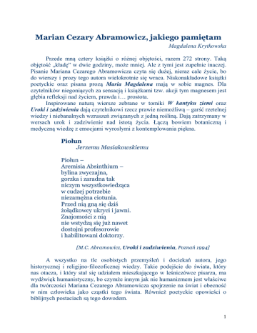 Marian Cezary Abramowicz, jakiego pamiętam Magdalena Krytkowska Przede mną cztery książki o różnej objętości, razem 272 strony. Taką objętość „kładę” w dwie godziny, może mniej. Ale z tymi jest zupełnie inaczej. Pisanie Mariana Cezarego Abramowicza czyta się dużej, nieraz cale życie, bo do wierszy i prozy tego autora wielokrotnie się wraca. Niskonakładowe książki poetyckie oraz pisana prozą Maria Magdalena mają w sobie magnes. Dla czytelników niegoniących za sensacją i książkami tzw. akcji tym magnesem jest głębia refleksji nad życiem, prawda i… prostota. Inspirowane naturą wiersze zebrane w tomiki W kantyku ziemi oraz Uroki i zadziwienia dają czytelnikowi rzecz prawie niemożliwą – garść rzetelnej wiedzy i niebanalnych wzruszeń związanych z jedną rośliną. Dają zatrzymany w wersach urok i zadziwienie nad istotą życia. Łączą bowiem botaniczną i medyczną wiedzę z emocjami wyrosłymi z kontemplowania piękna. Piołun Jerzemu Masiakowskiemu Piołun – Aremisia Absinthium – bylina zwyczajna, gorzka i zaradna tak niczym wszystkowiedząca w cudzej potrzebie niezamężna ciotunia. Przed nią gną się dziś żołądkowcy ukryci i jawni. Znajomości z nią nie wstydzą się już nawet dostojni profesorowie i habilitowani doktorzy. [M.C. Abramowicz, Uroki i zadziwienia, Poznań 1994] A wszystko na tle osobistych przemyśleń i dociekań autora, jego historycznej i religijno-filozoficznej wiedzy. Takie podejście do świata, który nas otacza, i który stał się udziałem mieszkającego w leśniczówce pisarza, ma wydźwięk humanistyczny, bo czymże innym jak nie humanizmem jest właściwe dla twórczości Mariana Cezarego Abramowicza spojrzenie na świat i obecność w nim człowieka jako cząstki tego świata. Również poetyckie opowieści o biblijnych postaciach są tego dowodem. 1 Betania I ja bywałem w Betanii, bałem się zrzędliwej Marty i wraz z Marią rumieniłem się u stóp Mistrza. Teraz przychodzę nocami, Biję głową o mury Bretanii od zewnątrz i Mistrza zbudzić się wstydzę. [M.C. Abramowicz, Confiteor, Poznań 1994] Apogeum takiego spojrzenia znajdujemy w powieści Maria Magdalena, którą czyta się jak wielki monolog kobiety mądrej, choć w szczególny sposób doświadczonej przez los, a może dlatego właśnie mądrej. Jej spotkanie i rozmowa z Pawłem z Antiohi, w której zawarta jest historia życia Marii Magdaleny, to podsumowanie zainteresowań autora biblijnymi tematami, na które patrzy przez pryzmat człowieczego losu. Takie samo spojrzenie spotykamy w ważnym dla poety tomiku wierszy Confiteor . To w nim zawarł swoje poetyckie credo. Rzadko spotyka się tak spójną twórczość poetyckoprozatorską. Apoteoza Ponad bojowe rakiety i strzały znienacka, na przekór szubienicom i egzekucyjnym plutonom w slumsach istnienia i trwania bieli się Pietą Michała Anioła i wybucha ”Odą do radości” z Dziewiątej Symfonii Ludwiga van Beethovena to niby takie zwyczajne, czasem cuchnące piwem, zbrukane serce człowieka, co zadziwia z czasem i podczas jak niemy a zwycięski wciąż Krzyż. [M.C. Abramowicz, Confiteor, Poznań 1994] 2 Mariana Cezarego Abramowicza po raz pierwszy spotkałam, kiedy pracowałam w Wojewódzkiej Bibliotece Publicznej im. Adama Asnyka w Kaliszu. Tam przez szereg lat gościł zapraszany na spotkania autorskie oraz jako juror w konkursach literackich. Podczas tych spotkań nie było ani cienia nudy. Swoimi zainteresowaniami skupionymi na człowieku potrafił oczarować bez reszty zarówno dzieci z podstawówek, młodzież licealną i dorosłych. Pamiętam jak ratując reputację biblioteki zastąpił odmawiającego nieoczekiwanie spotkania jednego z ważnych autorów. Nie wahał się ani chwili, choć uczestnikami spotkania mieli być więźniowie. Nasze wątpliwości, czy tak kruchej postury i wrażliwy człowiek poradzi sobie, rozwiały się z pierwszym zdaniem wypowiedzianymi do audytorium w więziennej świetlicy. Abramowicz zawsze był perfekcyjnie przygotowany do spotkań z czytelnikami. Szanował ich i czas, jaki mu poświęcali. Nigdy nie czytał wierszy, zawsze mówił je z pamięci, a wybierał nieprzypadkowo, to były poetyckie spektakle, ale pozbawione patosu i deklamacji. Z tych spotkań zapamiętałam ogromny spokój i życzliwość, jakimi obdarzał słuchaczy. W jego wypowiedziach nie było żadnych zbędnych słów. Niezwykła to postać, potrzebna bardzo w czasach, gdy zaczynały dominować pośpiech i komercja, a nierzadko bylejakość. Na przedtytułowych kartach czterech leżących przede mną książek pisane kaligraficznym, drobnym pismem dedykacje. Nie jakieś tam zdawkowe, pseudo serdeczne, ale bogate w piękne słowa człowieka, który lubił ludzi i którego lubili ludzie. Pamiętam również pożegnanie poety, jego ostatnią drogę. Patrząc na postać leżącą w objęciach dębowych desek widziałam człowieka, który ciągle żył. I żyje, bo jego książki nie umierają na półkach ich właścicieli. Magdalena Krytkowska Marian Cezary Abramowicz 3 Aloaha PDF Suite Freeware Edition: http://www.aloaha.com