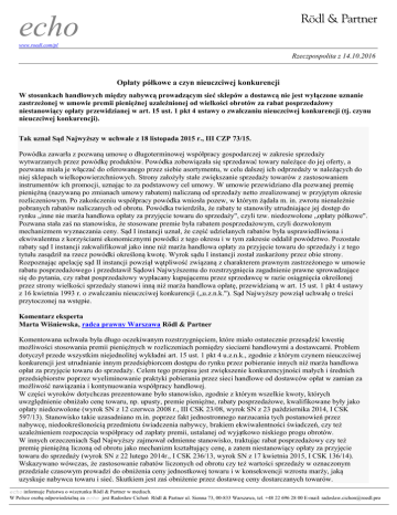 echo www.roedl.com/pl Rzeczpospolita z 14.10.2016 Opłaty półkowe a czyn nieuczciwej konkurencji W stosunkach handlowych między nabywcą prowadzącym sieć sklepów a dostawcą nie jest wyłączone uznanie zastrzeżonej w umowie premii pieniężnej uzależnionej od wielkości obrotów za rabat posprzedażowy niestanowiący opłaty przewidzianej w art. 15 ust. 1 pkt 4 ustawy o zwalczaniu nieuczciwej konkurencji (tj. czynu nieuczciwej konkurencji). Tak uznał Sąd Najwyższy w uchwale z 18 listopada 2015 r., III CZP 73/15. Powódka zawarła z pozwaną umowę o długoterminowej współpracy gospodarczej w zakresie sprzedaży wytwarzanych przez powódkę produktów. Powódka zobowiązała się sprzedawać towary należące do jej oferty, a pozwana miała je włączać do oferowanego przez siebie asortymentu, w celu dalszej ich odprzedaży w należących do niej sklepach wielkopowierzchniowych. Strony założyły stałe zwiększanie sprzedaży towarów z zastosowaniem instrumentów ich promocji, uznając to za podstawowy cel umowy. W umowie przewidziano dla pozwanej premię pieniężną (nazywaną po zmianach umowy rabatem) naliczaną od sprzedaży netto zrealizowanej w przyjętym okresie rozliczeniowym. Po zakończeniu współpracy powódka wniosła pozew, w którym żądała m. in. zwrotu nienależnie pobranych rabatów naliczanych od obrotu. Powódka twierdziła, że rabaty te stanowiły utrudniające jej dostęp do rynku „inne nie marża handlowa opłaty za przyjęcie towaru do sprzedaży", czyli tzw. niedozwolone „opłaty półkowe". Pozwana stała zaś na stanowisku, że stosowane premie była rabatem posprzedażowym, czyli dozwolonym mechanizmem wyznaczania ceny. Sąd I instancji uznał, że część udzielanych rabatów była usprawiedliwiona i ekwiwalentna z korzyściami ekonomicznymi powódki z tego okresu i w tym zakresie oddalił powództwo. Pozostałe rabaty sąd I instancji zakwalifikował jako inne niż marża handlowa opłaty za przyjęcie towaru do sprzedaży i z tego tytułu zasądził na rzecz powódki określoną kwotę. Wyrok sądu I instancji został zaskarżony przez obie strony. Rozpoznając apelację sąd II instancji powziął wątpliwość związaną z charakterem prawnym zastrzeżonego w umowie rabatu posprzedażowego i przedstawił Sądowi Najwyższemu do rozstrzygnięcia zagadnienie prawne sprowadzające się do pytania, czy rabat posprzedażowy wypłacany kupującemu przez sprzedawcę w razie osiągnięcia określonej przez strony wielkości sprzedaży stanowi inną niż marża handlowa opłatę, przewidzianą w art. 15 ust. 1 pkt 4 ustawy z 16 kwietnia 1993 r. o zwalczaniu nieuczciwej konkurencji („u.z.n.k."). Sąd Najwyższy powziął uchwałę o treści przytoczonej na wstępie. Komentarz eksperta Marta Wiśniewska, radca prawny Warszawa Rödl & Partner Komentowana uchwała była długo oczekiwanym rozstrzygnięciem, które miało ostatecznie przesądzić kwestię możliwości stosowania premii pieniężnych w rozliczeniach pomiędzy sieciami handlowymi a dostawcami. Problem dotyczył przede wszystkim niejednolitej wykładni art. 15 ust. 1 pkt 4 u.z.n.k., zgodnie z którym czynem nieuczciwej konkurencji jest utrudnianie innym przedsiębiorcom dostępu do rynku przez pobieranie innych niż marża handlowa opłat za przyjęcie towaru do sprzedaży. Celem tego przepisu jest zwiększenie konkurencyjności małych i średnich przedsiębiorstw poprzez wyeliminowanie praktyki pobierania przez sieci handlowe od dostawców opłat w zamian za możliwość nawiązania i kontynuowania współpracy handlowej. W części wyroków dotychczas prezentowane było stanowisko, zgodnie z którym wszelkie kwoty, których uwzględnienie obniżało cenę towaru, np. upusty, premie pieniężne, rabaty posprzedażowe, kwalifikowane były jako opłaty niedozwolone (wyrok SN z 12 czerwca 2008 r., III CSK 23/08, wyrok SN z 23 października 2014, I CSK 597/13). Stanowisko takie uzasadniano m.in. poprzez fakt jednostronnego narzucania tych postanowień przez nabywcę, niedookreślonością przedmiotu świadczenia nabywcy, brakiem ekwiwalentności świadczeń, czy też uzależnieniem rozpoczęcia współpracy od zapłaty premii, ustalanej od wyjątkowo niskiego progu obrotów. W innych orzeczeniach Sąd Najwyższy zajmował odmienne stanowisko, traktując rabat posprzedażowy czy też premię pieniężną liczoną od obrotu jako mechanizm kształtujący cenę, a zatem niestanowiący opłaty za przyjęcie towaru do sprzedaży (wyrok SN z 22 lutego 2014r., I CSK 236/13, wyrok SN z 17 kwietnia 2015, I CSK 136/14). Wskazywano wówczas, że zastosowanie rabatów liczonych od obrotu czy też wartości sprzedaży w oznaczonym przedziale czasowym prowadzi do obniżenia ceny jednostkowej towaru i w konsekwencji wzrostu marży, jaką uzyskuje nabywca towaru i sieć. Skutkiem jest zaś obniżenie przez dostawcę ceny dostarczanych towarów. echo informuje Państwa o wizerunku Rödl & Partner w mediach. W Polsce osobą odpowiedzialną za echo jest Radosław Cichoń Rödl & Partner ul. Sienna 73, 00-833 Warszawa, tel. +48 22 696 28 00 E-mail: [email protected] Podobnie wypowiedział się Sąd Najwyższy w komentowanej uchwale, z której można wywieść kilka ważnych dla praktyki wniosków. W pierwszej kolejności wskazać należy na istotną konkluzję, iż rabat posprzedażowy, jako następczy mechanizm kształtowania ceny sprzedaży, stanowi element marży handlowej i w związku z tym znajduje się poza wskazanym w u.z.n.k. katalogiem zakazanych opłat. W dalszej kolejności analiza uchwały prowadzi do wniosku, że zastrzeżone w umowach premie pieniężne uzależnione od obrotów mogą stanowić dozwolony rabat posprzedażowy, co jednak – jak wskazał Sąd Najwyższy – „nie oznacza generalnie ich wyłączenia spod kontroli sądu również na gruncie przepisu art. 15 ust. 1 pkt 4 u.z.n.k.". W praktyce oznacza to, że dopuszczalność zastrzeżenia takiej premii pieniężnej zależy o