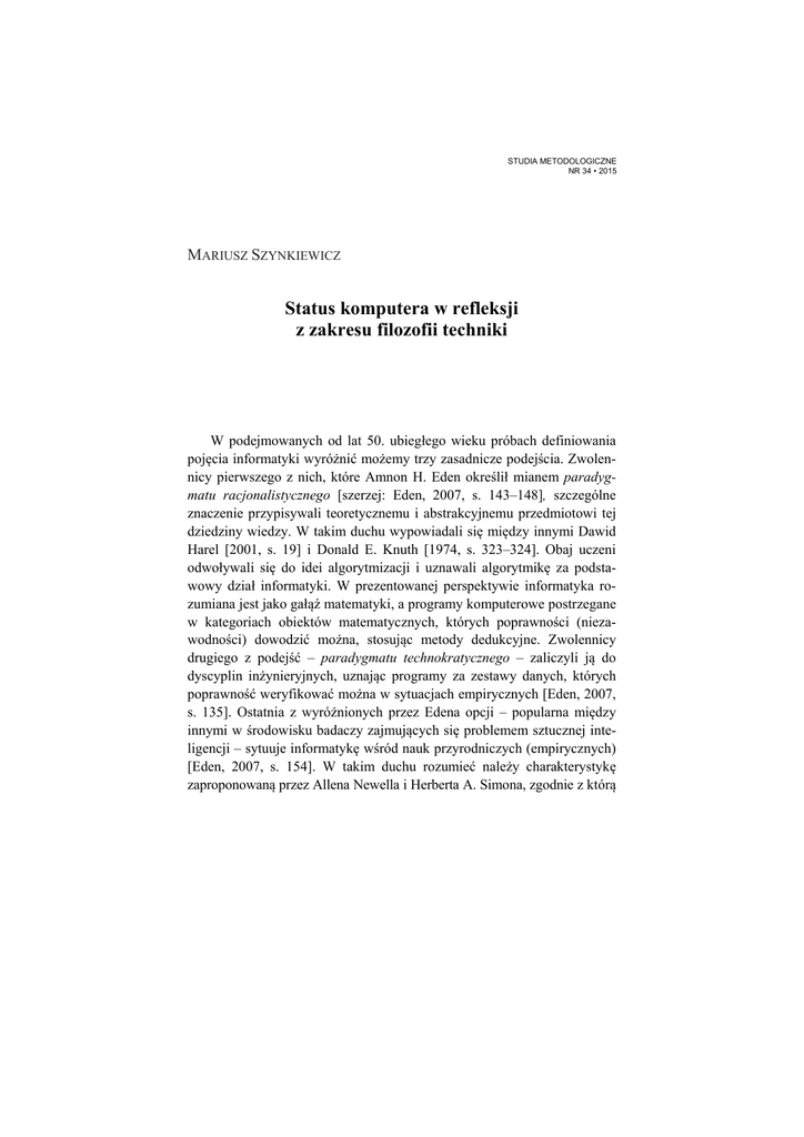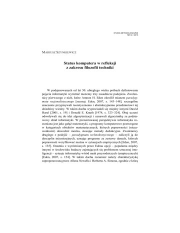 STUDIA METODOLOGICZNE NR 34 • 2015 MARIUSZ SZYNKIEWICZ Status komputera w refleksji z zakresu filozofii techniki W podejmowanych od lat 50. ubiegłego wieku próbach definiowania pojęcia informatyki wyróżnić możemy trzy zasadnicze podejścia. Zwolennicy pierwszego z nich, które Amnon H. Eden określił mianem paradygmatu racjonalistycznego [szerzej: Eden, 2007, s. 143–148], szczególne znaczenie przypisywali teoretycznemu i abstrakcyjnemu przedmiotowi tej dziedziny wiedzy. W takim duchu wypowiadali się między innymi Dawid Harel [2001, s. 19] i Donald E. Knuth [1974, s. 323–324]. Obaj uczeni odwoływali się do idei algorytmizacji i uznawali algorytmikę za podstawowy dział informatyki. W prezentowanej perspektywie informatyka rozumiana jest jako gałąź matematyki, a programy komputerowe postrzegane w kategoriach obiektów matematycznych, których poprawności (niezawodności) dowodzić można, stosując metody dedukcyjne. Zwolennicy drugiego z podejść – paradygmatu technokratycznego – zaliczyli ją do dyscyplin inżynieryjnych, uznając programy za zestawy danych, których poprawność weryfikować można w sytuacjach empirycznych [Eden, 2007, s. 135]. Ostatnia z wyróżnionych przez Edena opcji – popularna między innymi w środowisku badaczy zajmujących się problemem sztucznej inteligencji – sytuuje informatykę wśród nauk przyrodniczych (empirycznych) [Eden, 2007, s. 154]. W takim duchu rozumieć należy charakterystykę zaproponowaną przez Allena Newella i Herberta A. Simona, zgodnie z którą 172 MARIUSZ SZYNKIEWICZ może być ona pojmowana jako: ogół zjawisk i procesów związanych z komputerami [Newell, Simon, 1975, s. 113]1. Z uwagi na wielowymiarowość współczesnej informatyki2 adekwatna jej definicja powinna uwzględniać wszystkie trzy – wyszczególnione wyżej – stanowiska. Próby zredukowania opisywanej dziedziny do jednego, ściśle określonego, obszaru prowadzić mogą do nieporozumień i niejasności znaczeniowych. Problemy te stają się istotne nie tylko w perspektywie filozofii nauki [zob. Boniecka-Krzykowska, 2014, s. 85–99], ale także w kontekście samej informatyki [zob. Adamski, 2002; Tadeusiewicz, 2011, s. 2–3]. Analizując znaczenie terminu informatyka, Marian Adamski uznał pojęcia algorytmu i komputera za najważniejsze (fundamentalne) dla tej dziedziny [Adamski, 2002, s. II]. W swojej pracy koncentruję się przede wszystkim na drugim spośród wymienionych wyżej pojęć, analizując jego znaczenie w dwóch zasadniczych perspektywach. Pierwsza z nich ma charakter historyczny i związana jest z rozwojem technologii komputerowych. Druga odwołuje się do filozofii techniki – zwłaszcza tych jej obszarów, które zajmują się analizą procesów automatyzacji, algorytmizacji i szeroko pojmowanym pojęciem maszyny3. Wokół idei automatyzacji4 Termin komputer (od gr. computus, computare) pojawił się po raz pierwszy w roku 1613, w książce Richarda Braithwaita zatytułowanej The Yong Mans Gleanings [Galey, 2014, s. 252]. Początkowo oznaczał on ___________________ 1 W artykule z roku 1975 obaj autorzy zaliczyli informatykę do nauk empirycznych [Newell, Simon, 1975, s. 115]. 2 Pojęcie współczesnej informatyki odnosi się do okresu po rewolucji komputerowej lat 40. i 50. XX wieku. 3 W swoich analizach skoncentruję się głównie na współczesnych komputerach cyfrowych. 4 Automatyzacja może być rozumiana jako określona procedura i analizowana na rozmaitych poziomach. W przypadku technologii komputerowych szczególnego znaczenia nabierają te jej aspekty, które wiążą się z mechanizacją szeroko pojmowanych procesów myślowych, czyli takich kompetencji jak umiejętność liczenia, przetwarzania czy magazynowania danych, informacji oraz wiedzy. Status komputera w refleksji z zakresu filozofii techniki 173 osobę zajmującą się wykonywaniem obliczeń. Z czasem stał się jednak synonimem urządzenia służącego do prowadzenia operacji matematycznych. W takim sensie termin komputer stosowany był powszechnie do połowy XX stulecia. We współczesnych opracowaniach naukowych, encyklopedycznych i podręcznikowych komputery charakteryzowane są przede wszystkim jako maszyny przetwarzające informacje (tak zwane maszyny informacyjne). Za główną cechę, która odróżnia je od innych klas urządzeń technicznych, uznaje się natomiast programowalność. Jest ona warunkiem koniecznym, jaki spełnić musi każde urządzenie zaliczane do kategorii komputerów. Rozważania dotyczące materialnego (sprzętowego) wymiaru współczesnej informatyki rozpocznę od omówienia pojęcia automatyzacji5. Automatyzacja – w interesującym nas zakresie – wiąże się bezpośrednio z pojęciem maszyny. Tematyka związana z maszynami oraz łączącymi się z ich istnieniem i funkcjonowaniem problemami ontologicznymi, etycznymi, antropologicznymi, a nawet estetycznymi, poruszana była w literaturze filozoficznej wielokrotnie. O maszynach pisali między innymi: Arystoteles, Kartezjusz, Francis Bacon, Julien Offray de La Mettrie, Karol Marks. W wieku XX i XXI problematyka ta okazała się szczególnie istotna dla rozważań z zakresu ontologii i filozofii techniki [zob. Ellul, 1964; Ferkiss, 1993; Van Lier, 1970; Mumford 1963; Bańka, 1980; 1981; Falkowski, 2014]. Współczesne rozumienie pojęcia automatyzacji kojarzone jest przede wszystkim z osobami Dela Hardera i Johna Diebolda. Harder posługiwał się tym terminem, opisując sposób funkcjonowania i obsługi maszyn produkcyjnych. Bardziej ogólny sens pojęciu automatyzacji nadał dopiero Diebold. W książce pt. Automation: The Advent of the Automatic Factory [Diebold, 1952] wykorzystał on rozważane pojęcie, opisując klasę urządzeń zdolnych do zastąpienia człowieka w wykonywaniu określonych typów pracy. Autor powiązał ideę automatyzacji z pojęciem informacji ___________________ 5 Automat rozumieć możemy jako względnie autonomiczne urządzenie wyk