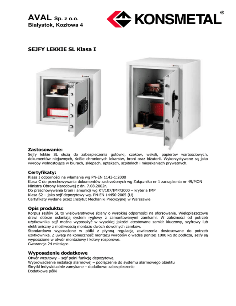 AVAL Sp. z o.o. Białystok, Kozłowa 4 SEJFY LEKKIE SL Klasa I